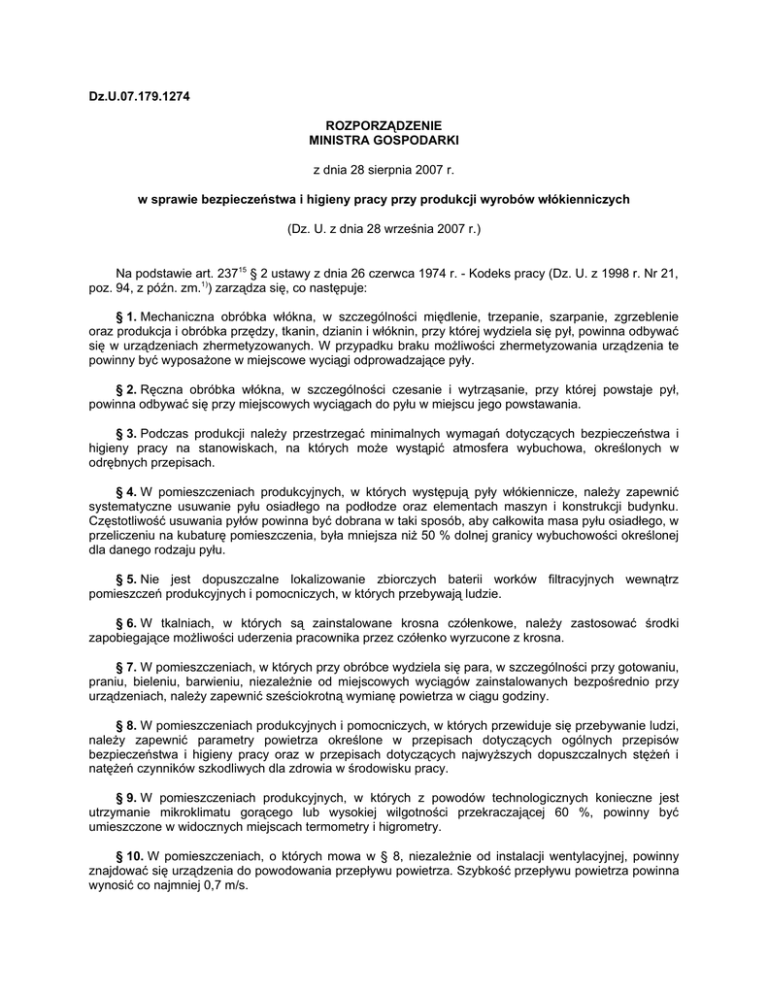 Dz.U.07.179.1274 ROZPORZĄDZENIE MINISTRA GOSPODARKI z dnia 28 sierpnia 2007 r. w sprawie bezpieczeństwa i higieny pracy przy produkcji wyrobów włókienniczych (Dz. U. z dnia 28 września 2007 r.) Na podstawie art. 23715 § 2 ustawy z dnia 26 czerwca 1974 r. - Kodeks pracy (Dz. U. z 1998 r. Nr 21, poz. 94, z późn. zm.1)) zarządza się, co następuje: § 1. Mechaniczna obróbka włókna, w szczególności międlenie, trzepanie, szarpanie, zgrzeblenie oraz produkcja i obróbka przędzy, tkanin, dzianin i włóknin, przy której wydziela się pył, powinna odbywać się w urządzeniach zhermetyzowanych. W przypadku braku możliwości zhermetyzowania urządzenia te powinny być wyposażone w miejscowe wyciągi odprowadzające pyły. § 2. Ręczna obróbka włókna, w szczególności czesanie i wytrząsanie, przy której powstaje pył, powinna odbywać się przy miejscowych wyciągach do pyłu w miejscu jego powstawania. § 3. Podczas produkcji należy przestrzegać minimalnych wymagań dotyczących bezpieczeństwa i higieny pracy na stanowiskach, na których może wystąpić atmosfera wybuchowa, określonych w odrębnych przepisach. § 4. W pomieszczeniach produkcyjnych, w których występują pyły włókiennicze, należy zapewnić systematyczne usuwanie pyłu osiadłego na podłodze oraz elementach maszyn i konstrukcji budynku. Częstotliwość usuwania pyłów powinna być dobrana w taki sposób, aby całkowita masa pyłu osiadłego, w przeliczeniu na kubaturę pomieszczenia, była mniejsza niż 50 % dolnej granicy wybuchowości określonej dla danego rodzaju pyłu. § 5. Nie jest dopuszczalne lokalizowanie zbiorczych baterii worków filtracyjnych wewnątrz pomieszczeń produkcyjnych i pomocniczych, w których przebywają ludzie. § 6. W tkalniach, w których są zainstalowane krosna czółenkowe, należy zastosować środki zapobiegające możliwości uderzenia pracownika przez czółenko wyrzucone z krosna. § 7. W pomieszczeniach, w których przy obróbce wydziela się para, w szczególności przy gotowaniu, praniu, bieleniu, barwieniu, niezależnie od miejscowych wyciągów zainstalowanych bezpośrednio przy urządzeniach, należy zapewnić sześciokrotną wymianę powietrza w ciągu godziny. § 8. W pomieszczeniach produkcyjnych i pomocniczych, w których przewiduje się przebywanie ludzi, należy zapewnić parametry powietrza określone w przepisach dotyczących ogólnych przepisów bezpieczeństwa i higieny pracy oraz w przepisach dotyczących najwyższych dopuszczalnych stężeń i natężeń czynników szkodliwych dla zdrowia w środowisku pracy. § 9. W pomieszczeniach produkcyjnych, w których z powodów technologicznych konieczne jest utrzymanie mikroklimatu gorącego lub wysokiej wilgotności przekraczającej 60 %, powinny być umieszczone w widocznych miejscach termometry i higrometry. § 10. W pomieszczeniach, o których mowa w § 8, niezależnie od instalacji wentylacyjnej, powinny znajdować się urządzenia do powodowania przepływu powietrza. Szybkość przepływu powietrza powinna wynosić co najmniej 0,7 m/s. § 11. Przygotowywanie chemikaliów, w szczególności mieszanie, przelewanie i innego rodzaju czynności, przy których wydzielają się pary, gazy i pył, powinno odbywać się w wydzielonych pomieszczeniach pracy, w urządzeniach zhermetyzowanych. W przypadku braku możliwości zhermatyzowania powinno się przy tych czynnościach stosować wyciągi miejscowe, a pracownicy powinni używać odpowiednich środków ochrony indywidualnej. § 12. Wanny i kadzie, zawierające roztwory, które wydzielają niebezpieczne substancje chemiczne, w szczególności drażniące, duszące, toksyczne lub bardzo toksyczne, powinny posiadać wyciągi miejscowe lub okapy z wyciągami. § 13. Podłogi w pomieszczeniach narażonych na działanie substancji chemicznych, wody i pary powinny być nienasiąkliwe, szczelne, z odpowiednimi spadkami w kierunku kratek odpływowych. W miejscach, w których pracownicy przy pracy stoją lub siedzą, na podłodze powinny być ułożone podesty niezagrażające bezpieczeństwu pracy. § 14. W pomieszczeniach narażonych na działanie substancji chemicznych, wody i pary ściany powinny być pokryte, do wysokości co najmniej 2,0 m, materiałem nienasiąkliwym, łatwo zmywalnym i odpornym na działanie środków stosowanych do czyszczenia, usuwania plam, prania lub barwienia wyrobów włókienniczych. § 15. Traci moc rozporządzenie Ministrów: Pracy i Opieki Społecznej, Zdrowia i Przemysłu z dnia 26 marca 1946 r. o higienie pracy w zakładach przemysłu włókienniczego (Dz. U. Nr 23, poz. 151). § 16. Rozporządzenie wchodzi w życie po upływie 14 dni od dnia ogłoszenia. ______ 1) Zmiany tekstu jednolitego wymienionej ustawy zostały ogłoszone w Dz. U. z 1998 r. Nr 106, poz. 668 i Nr 113, poz. 717, z 1999 r. Nr 99, poz. 1152, z 2000 r. Nr 19, poz. 239, Nr 43, poz. 489, Nr 107, poz. 1127 i Nr 120, poz. 1268, z 2001 r. Nr 11, poz. 84, Nr 28, poz. 301, Nr 52, poz. 538, Nr 99, poz. 1075, Nr 111, poz. 1194, Nr 123, poz. 1354, Nr 128, poz. 1405 i Nr 154, poz. 1805, z 2002 r. Nr 74, poz. 676, Nr 135, poz. 1146, Nr 196, poz. 1660, Nr 199, poz. 1673 i Nr 200, poz. 1679, z 2003 r. Nr 166, poz. 1608 i Nr 213, poz. 2081, z 2004 r. Nr 96, poz. 959, Nr 99, poz. 1001, Nr 120, poz. 1252 i Nr 240, poz. 2407, z 2005 r. Nr 10, poz. 71, Nr 68, poz. 610, Nr 86, poz. 732 i Nr 167, poz. 1398, z 2006 r. Nr 104, poz. 708 i 711, Nr 133, poz. 935, Nr 217, poz. 1587 i Nr 221, poz. 1615 oraz z 2007 r. Nr 64, poz. 426, Nr 89, poz. 589 i Nr 176, poz. 1239.