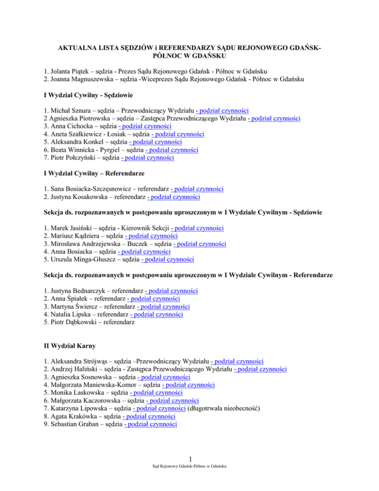 AKTUALNA LISTA SĘDZIÓW i REFERENDARZY SĄDU REJONOWEGO GDAŃSKPÓŁNOC W GDAŃSKU 1. Jolanta Piątek – sędzia - Prezes Sądu Rejonowego Gdańsk - Północ w Gdańsku 2. Joanna Magnuszewska – sędzia -Wiceprezes Sądu Rejonowego Gdańsk - Północ w Gdańsku I Wydział Cywilny - Sędziowie 1. Michał Sznura – sędzia – Przewodniczący Wydziału - podział czynności 2 Agnieszka Piotrowska – sędzia – Zastępca Przewodniczącego Wydziału - podział czynności 3. Anna Cichocka – sędzia - podział czynności 4. Aneta Szałkiewicz - Łosiak – sędzia - podział czynności 5. Aleksandra Konkel – sędzia - podział czynności 6. Beata Winnicka - Pyrgiel – sędzia - podział czynności 7. Piotr Połczyński – sędzia - podział czynności I Wydział Cywilny – Referendarze 1. Sana Bosiacka-Szczęsnowicz – referendarz - podział czynności 2. Justyna Kosakowska – referendarz - podział czynności Sekcja ds. rozpoznawanych w postępowaniu uproszczonym w I Wydziale Cywilnym - Sędziowie 1. Marek Jasiński – sędzia - Kierownik Sekcji - podział czynności 2. Mariusz Kądziera – sędzia - podział czynności 3. Mirosława Andrzejewska – Buczek – sędzia - podział czynności 4. Anna Bosiacka – sędzia - podział czynności 5. Urszula Minga-Głuszcz – sędzia - podział czynności Sekcja ds. rozpoznawanych w postępowaniu uproszczonym w I Wydziale Cywilnym - Referendarze 1. Justyna Bednarczyk – referendarz - podział czynności 2. Anna Śpiałek – referendarz - podział czynności 3. Martyna Świercz – referendarz - podział czynności 4. Natalia Lipska – referendarz - podział czynności 5. Piotr Dąbkowski – referendarz II Wydział Karny 1. Aleksandra Strójwąs – sędzia –Przewodniczący Wydziału - podział czynności 2. Andrzej Haliński – sędzia - Zastępca Przewodniczącego Wydziału - podział czynności 3. Agnieszka Sosnowska – sędzia - podział czynności 4. Małgorzata Maniewska-Komor – sędzia - podział czynności 5. Monika Laskowska – sędzia - podział czynności 6. Małgorzata Kaczorowska – sędzia - podział czynności 7. Katarzyna Lipowska – sędzia - podział czynności (długotrwała nieobecność) 8. Agata Krakówka – sędzia - podział czynności 9. Sebastian Graban – sędzia - podział czynności 1 Sąd Rejonowy Gdańsk-Północ w Gdańsku III Wydział Ksiąg Wieczystych - Sędziowie Joanna Jaros – sędzia - Przewodniczący Wydziału - podział czynności III Wydział Ksiąg Wieczystych - Referendarze 1. Dariusz Brylowski - referendarz - podział czynności 2. Agnieszka Gorzałczyńska – referendarz - podział czynności 3. Katarzyna Jelińska – Łopacińska - referendarz - podział czynności 4. Iwona Karaszewska - referendarz (długotrwała nieobecność) 5. Stella Korzeniewska – referendarz - podział czynności 6. Marzena Michaelis – referendarz - podział czynności 7. Magdalena Nowicka – Reszka – referendarz (długotrwała nieobecność) 8. Małgorzata Okońska – referendarz (długotrwała nieobecność) 9. Monika Onacka – Leśniczak – referendarz - podział czynności 10.Anna Ostrowska – referendarz - podział czynności 11. Rafał Rudnicki – referendarz - podział czynności 12. Ewelina Staniszewska – referendarz (długotrwała nieobecność) 13. Beata Szymkowiak – referendarz - podział czynności 14. Magdalena Zaleska – Butkiewicz- referendarz - podział czynności 15. Joanna Zaremba – referendarz - podział czynności 16. Katarzyna Zelewska – referendarz - podział czynności 17. Katarzyna Dudojć – referendarz - podział czynności 18. Aleksandra Siniecka-Kotula – referendarz 19. Grażyna Tandek – referendarz IV Wydział Gospodarczy - Sędziowie 1. Artur Wanarski – sędzia - Przewodniczący Wydziału - podział czynności 2. Monika Wasilewska – sędzia - Zastępca Przewodniczącego Wydziału - podział czynności 3. Maciej Turek – sędzia - podział czynności 4. Jarosław Olszewski – sędzia - podział czynności 5. Rafał Strugała – sędzia - podział czynności 6. Justyna Sosnowy – sędzia - podział czynności IV Wydział Gospodarczy - Referendarze 1. Dawid Deja – referendarze - podział czynności 2. Anna Janiszewska – referendarze - podział czynności V Wydział Gospodarczy - Sędziowie 1. Halina Czapiewska – sędzia - Przewodniczący Wydziału - podział czynności 2. Anna Brzoza – sędzia - Zastępca Przewodniczącego Wydziału - podział czynności 3. Joanna Magnuszewska – sędzia - podział czynności 4. Zofia Szlendak - Karwowska – sędzia - podział czynności 5. Joanna Kocent - Mazurek – sędzia - podział czynności 6. Marzena Gancarz – sędzia - podział czynności 7. Beata Głuszak – sędzia - podział czynności 2 Sąd Rejonowy Gdańsk-Północ w Gdańsku V Wydział Gospodarczy – Referendarze 1. Monika Oriol-Signerska – referendarz - podział czynności 2. Izabela Przybylińska – referendarz - podział czynności 3. Hanna Wojszwiłło-Grześ - referendarz VI Wydział Gospodarczy - Sędziowie 1. Maria Jezierska - Mikszewicz – sędzia - Przewodniczący Wydziału - podział czynności 2. Ireneusz Fojuth – sędzia - Zastępca Przewodniczącego Wydziału - podział czynności 3. Anna Stankiewicz – sędzia - podział czynności 4. Jacek Werengowski – sędzia - podział czynności 5. Ewa Kubiak – sędzia - podział czynności 6. Aleksandra Stefanowska – sędzia - podział czynności 7. Anna Morawska- sędzia - podział czynności VII Wydział Gospodarczy Krajowego Rejestru Sadowego - Sędziowie 1. Anna Bieganowska - Kowalska – sędzia - Przewodniczący Wydziału - podział czynności 2. Elżbieta Szczygieł –sędzia - podział czynności VII Wydział Gospodarczy Krajowego Rejestru Sadowego - Referendarze 1. Mariusz Garbarek - referendarz - podział czynności 2. Marcin Gójski – referendarz - podział czynności 3. Ewa Jastrzębowska – referendarz - podział czynności 4. Iwona Karnick