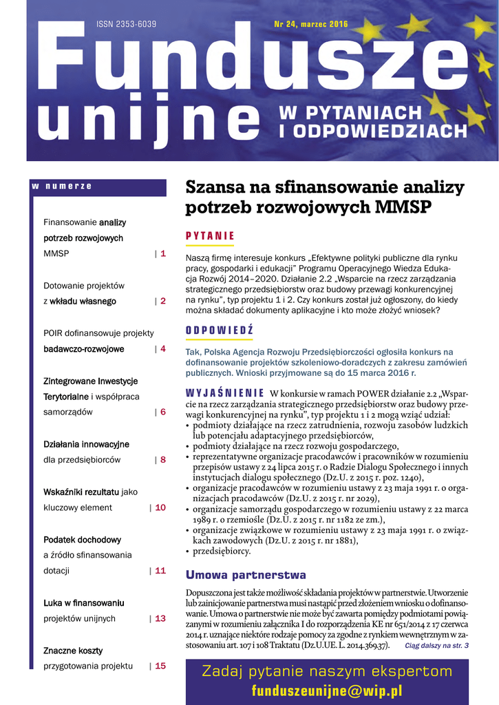 Nr 24, marzec 2016 ISSN 2353-6039 Szansa na sfinansowanie analizy potrzeb rozwojowych MMSP w numerze Finansowanie analizy P YTANIE potrzeb rozwojowych MMSP |1 Dotowanie projektów z wkładu własnego |2 Naszą firmę interesuje konkurs „Efektywne polityki publiczne dla rynku pracy, gospodarki i edukacji” Programu Operacyjnego Wiedza Edukacja Rozwój 2014–2020. Działanie 2.2 „Wsparcie na rzecz zarządzania strategicznego przedsiębiorstw oraz budowy przewagi konkurencyjnej na rynku”, typ projektu 1 i 2. Czy konkurs został już ogłoszony, do kiedy można składać dokumenty aplikacyjne i kto może złożyć wniosek? POIR dofinansowuje projekty ODPOWIEDŹ badawczo-rozwojowe Tak, Polska Agencja Rozwoju Przedsiębiorczości ogłosiła konkurs na dofinansowanie projektów szkoleniowo-doradczych z zakresu zamówień publicznych. Wnioski przyjmowane są do 15 marca 2016 r. |4 Zintegrowane Inwestycje W Y J A Ś N I E N I E W konkursie w ramach POWER działanie 2.2 „Wspar- Terytorialne i współpraca samorządów |6 Działania innowacyjne dla przedsiębiorców |8 Wskaźniki rezultatu jako kluczowy element | 10 Podatek dochodowy a źródło sfinansowania dotacji | 11 Umowa partnerstwa | 13 Dopuszczona jest także możliwość składania projektów w partnerstwie. Utworzenie lub zainicjowanie partnerstwa musi nastąpić przed złożeniem wniosku o dofinansowanie. Umowa o partnerstwie nie może być zawarta pomiędzy podmiotami powiązanymi w rozumieniu załącznika I do rozporządzenia KE nr 651/2014 z 17 czerwca 2014 r. uznające niektóre rodzaje pomocy za zgodne z rynkiem wewnętrznym w zastosowaniu art. 107 i 108 Traktatu (Dz.U.UE. L. 2014.369.37). Ciąg dalszy na str. 3 Luka w finansowaniu projektów unijnych Znaczne koszty przygotowania projektu cie na rzecz zarządzania strategicznego przedsiębiorstw oraz budowy przewagi konkurencyjnej na rynku”, typ projektu 1 i 2 mogą wziąć udział: • podmioty działające na rzecz zatrudnienia, rozwoju zasobów ludzkich lub potencjału adaptacyjnego przedsiębiorców, • podmioty działające na rzecz rozwoju gospodarczego, • reprezentatywne organizacje pracodawców i pracowników w rozumieniu przepisów ustawy z 24 lipca 2015 r. o Radzie Dialogu Społecznego i innych instytucjach dialogu społecznego (Dz.U. z 2015 r. poz. 1240), • organizacje pracodawców w rozumieniu ustawy z 23 maja 1991 r. o organizacjach pracodawców (Dz.U. z 2015 r. nr 2029), • organizacje samorządu gospodarczego w rozumieniu ustawy z 22 marca 1989 r. o rzemiośle (Dz.U. z 2015 r. nr 1182 ze zm.), • organizacje związkowe w rozumieniu ustawy z 23 maja 1991 r. o związkach zawodowych (Dz.U. z 2015 r. nr 1881), • przedsiębiorcy. | 15 Zadaj pytanie naszym ekspertom Zadaj pytanie na: [email protected] [email protected] ŹRÓDŁA FINANSOWANIA Może pojawić się konieczność dofinansowania z wkładu własnego OD REDAKCJI P YTANIE Czy potrzebne jest wniesienie wkładu własnego? W jakiej może być on formie? ODPOWIEDŹ Szanowny Czytelniku! Czy beneficjentem funduszy europejskich w perspektywie finansowej UE 2014-2020 mogą być przede wszystkim podmioty z sektora małych i średnich firm? Jakie szanse na uzyskanie dofinansowania mają duże przedsiębiorstwa? Eksperci miesięcznika „Fundusze unijne w pytaniach i odpowiedziach” podpowiadają, z jakiego rodzaju wsparcia mogą skorzystać duże przedsiębiorstwa w ramach Programu Operacyjnego Inteligentny Rozwój. Ponadto w najnowszym numerze miesięcznika wskazujemy również czemu mają służyć Zintegrowana Inwestycje Terytorialne, dlaczego tak ważne są wskaźniki rezultatu, jak przygotować się do kontroli, kiedy dotacja będzie stanowiła przychód opodatkowany podatkiem dochodowym, co to jest luka w finansowaniu oraz kiedy koszty przygotowania projektu należy ująć jako rozliczenia międzyokresowe czynne. Zapraszam do lektury! Anna Śmigulska-Wojciechowska Zazwyczaj dofinansowanie kształtuje się na poziomie ok. 30% całkowitych kosztów kwalifikowalnych projektu. Warto dobrze przeczytać wytyczne, a później umowę o dofinansowanie, aby uniknąć ewentualnych nieprawidłowości na etapie realizacji projektu. W Y J A Ś N I E N I E W wielu przy- nabytych od osób trzecich, na warunpadkach – ale trzeba zawsze odnaleźć taki zapis w wytycznych lub umowie o dofinansowanie – możliwe jest wniesienie wkładu własnego w formie rzeczowej, tzn. niepieniężnej. Jednak wkład niepieniężny nie może przekroczyć wartości wkładu własnego. Jako wkład własny pieniężny traktowane są wszystkie koszty rozumiane jako „rozchód środków finansowych w czasie trwania projektu”, poniesione zgodnie z obowiązującym w danym programie przewodnikiem kwalifikowalności kosztów. Jeżeli chodzi o wkład rzeczowy, czyli niepieniężny, mamy tu do czynienia z brakiem jakiegokolwiek przepływu środków finansowych w czasie trwania projektu. Wkład niepieniężny Nasi partnerzy MARZEC 2016 2 Wkładem niepieniężnym mogą być np. towary, materiały i surowce, wniesione do projektu, jednak nabyte przed okresem kwalifikowalności, ustalonym w wytycznych i określonym w umowie o dofinansowanie. Co istotne – ich wartość musi być potwierdzona odpowiednim dokumentem. Jako niepieniężny wkład własny możemy potraktować także wykorzystanie w planowanym projekcie całkowicie zamortyzowanych środków trwałych, przy czym wartość wkładu beneficjent musi określić na podstawie wyceny lub obowiązującej stawki rynkowej dzierżawy, wynajmu lub wypożyczenia. Możliwe jest także uwzględnienie wartości niematerialnych i prawnych, kach rynkowych. Mogą być to np. prototypy, patenty, licencje, know-how. W takim przypadku wartość wkładu rzeczowego określana jest przez beneficjenta na podstawie wyceny rzeczoznawcy lub stawek rynkowych. Warto rozważyć także, jako wkład niepieniężny, odpisy amortyzacyjne z tytułu obniżenia wartości środka trwałego, które odnoszą się do czasu i p