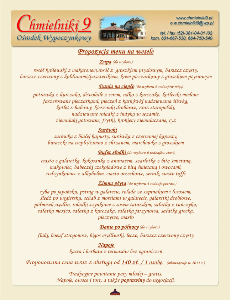 Propozycja menu na wesele Zupa (do wyboru) rosół królewski z makaronem,rosół z groszkiem ptysiowym, barszcz czysty, barszcz czerwony z kołdunami/pasztecikiem, krem pieczarkowy z groszkiem ptysiowym Dania na ciepło ciepło (do wyboru 6 rodzajów mięs) potrawka z kurczaka, de'volaile z serem, udko z kurczaka, kotleciki mielone faszerowane pieczarkami, pieczeń z karkówki nadziewana śliwką, kotlet schabowy, kieszonki drobiowe, zraz staropolski, nadziewane roladki z indyka w sezamie, ziemniaki gotowane, frytki, krokiety ziemniaczane, ryż Surówki surówka z białej kapusty, surówka z czerwonej kapusty, buraczki na ciepło/zimno z chrzanem, marchewka z groszkiem Bufet słodki (do wyboru 6 rodzajów ciast) ciasto z galaretką, kokosanka z ananasem, szarlotka z bitą śmietaną, makowiec, babeczki czekoladowe z bitą śmietaną i owocami, rodzynkowiec z alkoholem, ciasto orzechowe, sernik, ciasto toffi Zimna płyta (do wyboru 4 rodzaje potraw) ryba po japońsku, pstrąg w galarecie, rolada ze szpinakiem i łososiem, śledź po węgiersku, schab z morelami w galarecie, galaretki drobiowe, półmisek wędlin, roladki szynkowe z sosem tatarskim, sałatka z tuńczyka, sałatka mexico, sałatka z kurczaka, sałatka jarzynowa, sałatka grecka, pieczywo, masło Danie po północy (do wyboru) flaki, boeuf strogonow, bigos myśliwski, leczo, barszcz czerwony czysty Napoje kawa i herbata z termosów bez ograniczeń Proponowana cena wraz z obsługą od 140 zł. / 1 osobę. (obowiązuje w 2011 r.). Tradycyjne powitanie pary młodej – gratis. Napoje, owoce i tort, a także poprawiny do negocjacji.