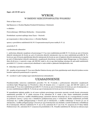 Sygn. akt III RC 43/13 WYROK W IMIENIU RZECZYPOSPOLITEJ POLSKIEJ Dnia 22 lipca 2013 r. Sąd Rejonowy w Środzie Śląskiej Wydział III Rodzinny i Nieletnich w składzie : Przewodniczący: SSR Beata Michurska – Gruszczyńska Protokolant: asystent sędziego Anna Tęcza – Paciorek po rozpoznaniu w dniu 22 lipca 2013 r. w Środzie Śląskiej sprawy z powództwa małoletnich M.i W. P.reprezentowanych przez matkę D. P. (1) przeciwko P. P. o podwyższenie alimentów I. podwyższa alimenty zasądzone od pozwanego P. P.na rzecz małoletniej powódki W. P.z kwoty po 300 zł (trzysta złotych) miesięcznie do kwoty po 400 zł (czterysta złotych) miesięcznie oraz na rzecz małoletniej powódki M. P.z kwoty po 350 zł (trzysta pięćdziesiąt złotych) miesięcznie do kwoty po 500 zł (pięćset złotych) miesięcznie, tj. łącznie po 900 zł (dziewięćset złotych) miesięcznie, zasądzonych dotychczas wyrokiem Sądu Okręgowego we Wrocławiu z dnia 18.08.2011r. w sprawie o sygn. akt XIII RC 1296/11, do 10-ego dnia każdego miesiąca do rąk matki małoletnich powódek D. P. (1)wraz z ustawowymi odsetkami w razie zwłoki w płatności którejkolwiek z rat; II. dalej idące powództwo oddala; III. zasądza od pozwanego P. P.na rzecz Skarbu Państwa kwotę 156 zł (sto pięćdziesiąt sześć złotych) tytułem zwrotu kosztów sądowych poniesionych w sprawie; IV. wyrokowi w pkt I nadaje rygor natychmiastowej wykonalności. UZASADNIENIE Przedstawicielka ustawowa małoletnich powodów W.i M. P.wniosła o podwyższenie alimentów zasądzonych wyrokiem Sądu Okręgowego we Wrocławiu z dnia 18 sierpnia 2011 r. w sprawie o sygn. akt XIII RC 1296/11, od pozwanego P. P.na rzecz małoletniej powódki W. P.z kwoty po 300 zł miesięcznie do kwoty po 400 zł miesięcznie, a na rzecz małoletniej powódki M. P.z kwoty po 350 zł miesięcznie do kwoty po 600 zł miesięcznie. W uzasadnieniu żądania podała, że od czasu wydania powyższego orzeczenia znacznie wzrosły koszty utrzymania małoletnich powódek. W. P. miała wówczas 8 lat, natomiast M. P. miała 4 lata. Ojciec małoletnich powódek utrzymywał się wówczas z zasiłku rehabilitacyjnego, natomiast obecnie utrzymuje się on z wynagrodzenia za pracę na podstawie umowy o pracę oraz z dodatkowo podejmowanej pracy w stolarstwie. Matka małoletnich powódek utrzymuje się z zasiłku pielęgnacyjnego w kwocie 520 zł miesięcznie, z zasiłku rodzinnego w kwocie po 212 zł miesięcznie, z zasiłku pielęgnacyjnego w kwocie po 153 zł miesięcznie oraz dodatku z tytułu kształcenia i rehabilitacji 80 zł miesięcznie. Obecnie małoletnia W. P. ma 10 lat, natomiast M. P. ma 6 lat. W. uczęszcza do IV klasy Szkoły Podstawowej w M., natomiast M. P. uczęszcza do przedszkola w M.. Ponadto małoletnia M. choruje na cukrzycę typu I, celiakię oraz zaćmę, co powoduje, że wymaga stałej opieki ze strony matki. Ponadto małoletnia musi często jeździć na płatne wizyty lekarskie. Pozwany w odpowiedzi na pozew wniósł o oddalenie powództwa w całości oraz o zasądzenie na jego rzecz zwrotu kosztów procesu. W uzasadnieniu wskazał, że jego sytuacja materialna i finansowa nie uległa poprawie od daty orzekania o obowiązku alimentacyjnym. Obecnie pracuje na podstawie umowy o pracę na czas określony do dnia 08 sierpnia 2013 r., za wynagrodzeniem 2.090 zł brutto miesięcznie oraz otrzymuje dodatkowo premię w wysokości 20% wynagrodzenia, za 100% obecność pracy. Ponadto pozwany wskazał, że nie polega na prawdzie twierdzenie matki małoletnich powódek jakoby pozwany miał podejmować dodatkowe prace w stolarstwie. Pozwany wskazał również, że musiał sprzedać swój samochód, aby spłacić zaciągnięte pożyczki i obecnie korzysta z pożyczonego samochodu. Ponadto mieszka on ze swoimi rodzicami w mieszkaniu brata. Jego ojciec nie pracuje, natomiast matka nie może pracować ze względu na stan zdrowia, pobiera zasiłek w kwocie 454 zł miesięcznie. Pozwany podniósł również, że opłaca część czynszu za mieszkaniu w kwocie 250 – 300 zł miesięcznie, opłaca także prąd w kwocie 70 zł miesięcznie oraz wydatkuje na dojazdy do pracy kwotę 200 – 350 zł miesięcznie. Pozwany wskazał, że opłaca córce M. zajęcia z języka angielskiego w kwocie 20 zł miesięcznie, a córce W. zakupił komplet podręczników do szkoły, jak również doładowuje jej telefon komórkowy. Podczas pobytów dzieci u pozwanego, stara się on zapewnić im rozrywkę zabierając na basen, do kina, w góry. Ponadto wielokrotnie dokonywał zakupu odzieży oraz obuwia dla dzieci. Sąd ustalił następujący stan faktyczny: Małoletnia powódka W. P., urodzona w dniu (...)oraz małoletnia powódka M. P., urodzona w dniu (...)pochodzą ze związku małżeńskiego D. P. (1)i P. P.. bezsporne Wyrokiem Sądu Okręgowego we Wrocławiu z dnia 18 sierpnia 2013 r. w sprawie o sygn. akt XIII RC 1296/11, związek małżeński D. P. (1)i P. P.został rozwiązany przez rozwód, bez orzekania o winie. Ponadto Sąd powierzył wykonywanie władzy rodzicielskiej nad małoletnimi W.i M. P.– D. P. (1), ograniczając władzę rodzicielską P. P.do ogólnego wglądu w wychowanie dzieci oraz do współdecydowania o ich istotnych sprawach oraz określił sposób kontaktowania się P. P.z małoletnimi dziećmi w pierwszy i trzeci weekend miesiąca, poczynając od piątku od godziny 16:00 do niedzieli do godziny 18:00 oraz spędzania z małoletnimi jednego tygodnia ferii zimowych i dwóch tygodni wakacji letnich, a które to będą tygodnie strony miały ustalać pomiędzy sobą miesiąc przed rozpoczęciem ferii i dwa miesiące przed rozpoczęciem wakacji letnich. Sąd zasądził również od P. P.na rzecz małoletniej powódki W. P.alimenty w kwocie po 300 zł miesięcznie, a na rzecz małoletniej powódki M. P.w kwocie po 350 zł miesięcznie. dowód: akta sprawy Sądu Okręgowego we Wrocławiu o sygn. XIII RC 1296/11 Następnie wyrokiem Sądu Apelacyjnego we Wrocław