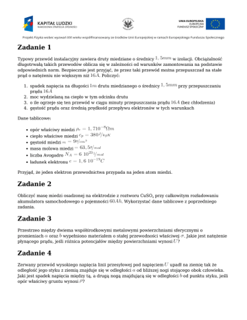 Zadanie 1 Typowy przewód instalacyjny zawiera druty miedziane o średnicy w izolacji. Obciążalność długotrwałą takich przewodów oblicza się w zależności od warunków zamontowania na podstawie odpowiednich norm. Bezpiecznie jest przyjąć, że przez taki przewód można przepuszczad na stałe prąd o natężeniu nie większym niż . Policzyć: 1. spadek napięcia na długości drutu miedzianego o średnicy przy przepuszczaniu prądu 2. moc wydzielaną na ciepło w tym odcinku drutu 3. o ile ogrzeje się ten przewód w ciągu minuty przepuszczania prądu (bez chłodzenia) 4. gęstość prądu oraz średnią prędkośd przepływu elektronów w tych warunkach Dane tablicowe: opór właściwy miedzi ciepło właściwe miedzi gęstośd miedzi masa molowa miedzi liczba Avogadro ładunek elektronu Przyjąd, że jeden elektron przewodnictwa przypada na jeden atom miedzi. Zadanie 2 Obliczyć masę miedzi osadzonej na elektrodzie z roztworu CuSO4 przy całkowitym rozładowaniu akumulatora samochodowego o pojemności . Wykorzystać dane tablicowe z poprzedniego zadania. Zadanie 3 Przestrzeo między dwiema współśrodkowymi metalowymi powierzchniami sferycznymi o promieniach oraz wypełniono materiałem o stałej przewodności właściwej . Jakie jest natężenie płynącego prądu, jeśli różnica potencjałów między powierzchniami wynosi ? Zadanie 4 Zerwany przewód wysokiego napięcia linii przesyłowej pod napięciem upadł na ziemię tak że odległość jego styku z ziemią znajduje się w odległości od bliższej nogi stojącego obok człowieka. Jaki jest spadek napięcia między tą, a drugą nogą znajdującą się w odległości od punktu styku, jeśli opór właściwy gruntu wynosi ? Zadanie 5 Znaleźć prądy płynące przez oporniki w układzie pokazanym na rysunku, zaniedbując opory wewnętrzne źródeł. Zadanie 6 Jakie będą, wskazania woltomierza i amperomierza w układach pokazanych na rysunku? Opory wewnętrzne woltomierza i amperomierza wynoszą, odpowiednio i , a opór wewnętrzny źródła .