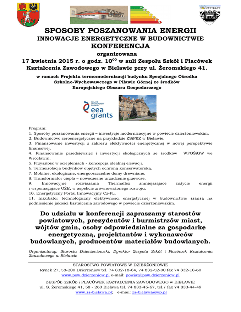 SPOSOBY POSZANOWANIA ENERGII INNOWACJE ENERGETYCZNE W BUDOWNICTWIE KONFERENCJA organizowana 17 kwietnia 2015 r. o godz. 1000 w auli Zespołu Szkół i Placówek Kształcenia Zawodowego w Bielawie przy ul. Żeromskiego 41. w ramach Projektu termomodernizacji budynku Specjalnego Ośrodka Szkolno-Wychowawczego w Piławie Górnej ze środków Europejskiego Obszaru Gospodarczego Program: 1. Sposoby poszanowania energii – inwestycje modernizacyjne w powiecie dzierżoniowskim. 2. Budownictwo zeroenergetyczne na przykładzie ZSiPKZ w Bielawie. 3. Finansowanie inwestycji z zakresu efektywności energetycznej w nowej perspektywie finansowej. 4. Finansowanie przedsięwzięć i inwestycji ekologicznych ze środków WFOŚiGW we Wrocławiu. 5. Przyszłość w ociepleniach - koncepcja idealnej elewacji. 6. Termoizolacja budynków objętych ochroną konserwatorską. 7. Mobilne, ekologiczne, energooszczędne domy drewniane. 8. Transformator ciepła – nowoczesne urządzenie grzewcze. 9. Innowacyjne rozwiązania Thermaflex zmniejszające zużycie energii i wspomagające OŹE, w aspekcie zrównoważonego rozwoju. 10. Energetyczny Portal Innowacyjny Cz-PL. 11. Inkubator technologiczny efektywności energetycznej w budownictwie szansą na podniesienie jakości kształcenia zawodowego w powiecie dzierżoniowskim. Do udziału w konferencji zapraszamy starostów powiatowych, prezydentów i burmistrzów miast, wójtów gmin, osoby odpowiedzialne za gospodarkę energetyczną, projektantów i wykonawców budowlanych, producentów materiałów budowlanych. Organizatorzy: Starosta Dzierżoniowski, Dyrektor Zespołu Szkół i Placówek Kształcenia Zawodowego w Bielawie STAROSTWO POWIATOWE W DZIERŻONIOWIE Rynek 27, 58-200 Dzierżoniów tel. 74 832-18-64, 74 832-52-00 fax 74 832-18-60 www.pow.dzierzoniow.pl e-mail: [email protected] ZESPÓŁ SZKÓŁ i PLACÓWEK KSZTAŁCENIA ZAWODOWEGO w BIELAWIE ul. S. Żeromskiego 41, 58 - 260 Bielawa tel. 74 833-45-67, tel./ fax 74 833-44-49 www.zs-bielawa.pl; e-mail: [email protected]