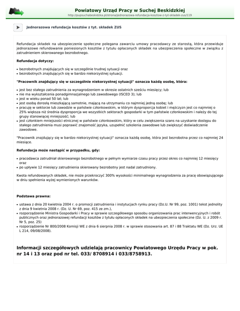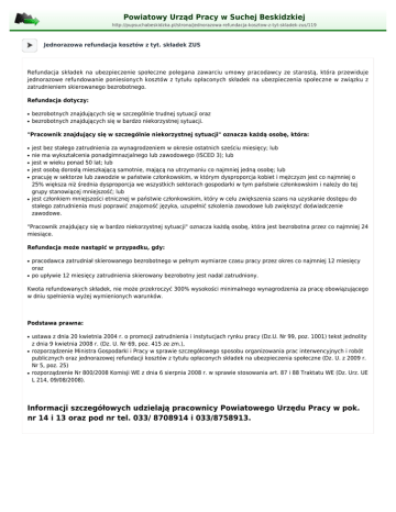Powiatowy Urząd Pracy w Suchej Beskidzkiej http://pupsuchabeskidzka.pl/strona/jednorazowa-refundacja-kosztow-z-tyt-skladek-zus/119 Jednorazowa refundacja kosztów z tyt. składek ZUS Refundacja składek na ubezpieczenie społeczne polegana zawarciu umowy pracodawcy ze starostą, która przewiduje jednorazowe refundowanie poniesionych kosztów z tytułu opłaconych składek na ubezpieczenia społeczne w związku z zatrudnieniem skierowanego bezrobotnego. Refundacja dotyczy: ● ● bezrobotnych znajdujących się w szczególnie trudnej sytuacji oraz bezrobotnych znajdujących się w bardzo niekorzystnej sytuacji. "Pracownik znajdujący się w szczególnie niekorzystnej sytuacji" oznacza każdą osobę, która: ● ● ● ● ● ● jest bez stałego zatrudnienia za wynagrodzeniem w okresie ostatnich sześciu miesięcy; lub nie ma wykształcenia ponadgimnazjalnego lub zawodowego (ISCED 3); lub jest w wieku ponad 50 lat; lub jest osobą dorosłą mieszkającą samotnie, mającą na utrzymaniu co najmniej jedną osobę; lub pracuję w sektorze lub zawodzie w państwie członkowskim, w którym dysproporcja kobiet i mężczyzn jest co najmniej o 25% większa niż średnia dysproporcja we wszystkich sektorach gospodarki w tym państwie członkowskim i należy do tej grupy stanowiącej mniejszość; lub jest członkiem mniejszości etnicznej w państwie członkowskim, który w celu zwiększenia szans na uzyskanie dostępu do stałego zatrudnienia musi poprawić znajomość języka, uzupełnić szkolenia zawodowe lub zwiększyć doświadczenie zawodowe. "Pracownik znajdujący się w bardzo niekorzystnej sytuacji" oznacza każdą osobę, która jest bezrobotna przez co najmniej 24 miesiące. Refundacja może nastąpić w przypadku, gdy: ● ● pracodawca zatrudniał skierowanego bezrobotnego w pełnym wymiarze czasu pracy przez okres co najmniej 12 miesięcy oraz po upływie 12 miesięcy zatrudnienia skierowany bezrobotny jest nadal zatrudniony. Kwota refundowanych składek, nie może przekroczyć 300% wysokości minimalnego wynagrodzenia za pracę obowiązującego w dniu spełnienia wyżej wymienionych warunków. Podstawa prawna: ● ● ● ustawa z dnia 20 kwietnia 2004 r. o promocji zatrudnienia i instytucjach rynku pracy (Dz.U. Nr 99, poz. 1001) tekst jednolity z dnia 9 kwietnia 2008 r. (Dz. U. Nr 69, poz. 415 ze zm.), rozporządzenie Ministra Gospodarki i Pracy w sprawie szczegółowego sposobu organizowania prac interwencyjnych i robót publicznych oraz jednorazowej refundacji kosztów z tytułu opłaconych składek na ubezpieczenia społeczne (Dz. U. z 2009 r. Nr 5, poz. 25) rozporządzenie Nr 800/2008 Komisji WE z dnia 6 sierpnia 2008 r. w sprawie stosowania art. 87 i 88 Traktatu WE (Dz. Urz. UE L 214, 09/08/2008). Informacji szczegółowych udzielają pracownicy Powiatowego Urzędu Pracy w pok. nr 14 i 13 oraz pod nr tel. 033/ 8708914 i 033/8758913.