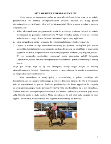 STYL WESTERN W REKREACJI CZ. XX Kiedy mamy już opanowane podstawy prowadzenia konia jedną ręką, to w trakcie przechodzenia do bardziej skomplikowanych ćwiczeń pojawić się mogą pewne niedociągnięcia, czy też błędy, jakie koń będzie popełniał. Błędy te mogą wynikać z różnych względów, np.: 1. Słabe lub niedokładne przygotowanie konia do wyższego poziomu ćwiczeń w trakcie prowadzenia na poziomie podstawowym. W tym wypadku należy wrócić do ćwiczeń podstawowych z tego zakresu ćwiczeń i zbudować lepszą bazę wyjściową. 2. Mała koncentracja konia – wracamy do ćwiczeń rozluźniających i korygujących. 3. Często się zdarza, że zbyt mało skoncentrowany jest jeździec, szczególnie jeśli ma on niewielkie doświadczenie w prowadzeniu treningu. Pojawiają się tutaj błędy w podawaniu sygnałów dla konia, nieprawidłowo stosowana jest pomoc wodzami, czy nogami jeźdźca. W tym przypadku powinniśmy zatrzymać konia, przemyśleć całość ćwiczenia i spróbować jeszcze raz przy maksymalnym rozluźnieniu i pełnej koncentracji z naszej strony. Skąd tyle uwag? Stąd, że są one niezbędne, byśmy mogli przejść to bardziej skomplikowanych ćwiczeń. Pamiętając schemat z poprzedniego ćwiczenia wprowadzimy do niego kilka nowych elementów: Kłus zamieniamy w wolny galop – przechodzimy z galopu szybkiego, ale kontrolowanego, do galopu wolniejszego poprzez odchylenie ramion do tyłu i wysunięcie stóp ze strzemionami do przodu. Ruch ten powinien być dla konia sygnałem do przejścia do wolniejszego galopu, wodze powinny być użyte tylko jako korekta (o ile to jest potrzebna). Zmiana prędkości przez pociągnięcie wodzami jest błędem i to bardzo poważnym, gdyż burzy całą filozofię jazdy w stylu western. Może się zdarzyć, że koń zbyt słabo reaguje na nasz sygnał i nie zwalnia, wtedy zamiast ww. sygnału przechodzimy do trawersu. Zdjęcie 1 1 Trawers jest trudnym ćwiczeniem, dlatego na tym etapie konieczne jest przejście do prowadzenia konia oburącz. Po wykonaniu kilku kroków w trawersie koń na pewno zwolni galop (jak wykonać trawers opisałem w poprzednich artykułach) (Zdjęcie 1). W pierwszym oraz w drugim ćwiczeniu jak tylko koń zwolni galop (staramy się nie przechodzić do kłusu) wracamy do pozycji zrównoważonej i wykonujemy dwa małe koła o – w miarę możliwości – tej samej średnicy. Uważam, że zastosowanie dwóch różnych wersji przejazdu tego schematu jest dobrym ćwiczeniem, które dobrze wpływa na psychikę konia. Jeżeli koń nie będzie chciał zmienić tempa w galopie na wolniejsze przez zastosowanie ćwiczenia pierwszego, tylko przez zastosowanie trawersu, to musimy uzbroić się w cierpliwość. Natomiast należy pamiętać, że korygowanie prędkości na kole powinno odbywać się tylko za pomocą tylko za pomocą ćwiczenia nr 1 – tzn. ramiona odchylamy do tyłu, nogi wysuwamy do przodu, a przyspieszamy przez ucisk oboma nogami końskich boków. Dodatkową pomocą jest głos. Do zwolnienia wykonujemy miękkie i ciche „szsz, szsz, szsz”, natomiast głośnie klikanie „kli, kli, kli” to przyspieszenie. (SCHEMAT W DWÓCH WARIANTACH): WARIANT 1: A – B – galop B – przejście do wolnego galopu (wykonujemy dwa koła) B – C – galop C – przejście do wolnego galopu (wykonujemy dwa koła) A – stop WARIANT 2: A – B – galop B – przejście do wolnego galopu (wykonujemy dwa koła) B – C – galop C – przejście do wolnego galopu (wykonujemy dwa koła) C – A – galop A – stop 2 Wykorzystując te warianty do ćwiczeń starajmy się, aby przejście do wolnych kół w powtarzanym schemacie rozpoczynało się w innym miejscu, wystarczy 3 – 4 metry przesunięcia do przodu lub od miejsca poprzednio wykonanego przejścia do zwolnienia, tak, że ćwicząc nie uczymy konia, że tylko w danym miejscu ma zwolnić. Zależy nam na tym, aby był on skoncentrowany i czekał na nasze sygnały (polecenia) Uwaga – jeżeli koń po przejściu trawersem do koła i zwolnieniu nie da się korygować przez zastosowanie ćwiczenia 1, należy wrócić do wcześniejszych ćwiczeń. Cdn. 3