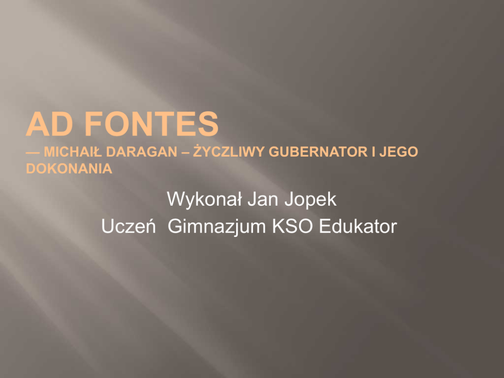 AD FONTES — MICHAIŁ DARAGAN – ŻYCZLIWY GUBERNATOR I JEGO DOKONANIA Wykonał Jan Jopek Uczeń Gimnazjum KSO Edukator Michał Piotrowicz Daragan, słynny z dbałości o Kalisz gubernator, wciąż intryguje. Choć wiemy coraz więcej, w życiorysie zasłużonego Rosjanina wiele jest niewiadomych. Tym chętniej wracamy do tej niezwykłej postaci, próbując nakreślić jej życie przed przybyciem do naszego miasta. Szlachecka rodzina Daraganów bierze swój początek z dwóch ziem obecnej Ukrainy – obwodu połtawskiego i czernihowskiego. W stolicy tego ostatniego, Czernihowie, zachował się pochodzący z I poł. XVIII wieku dom Daraganów. Najstarszym znanym przodkiem gubernatora był jego pradziadek Iwan Daragan. Dziadek, również noszący imię Michał, major wojsk rosyjskich zmarł w 1860 r. Prawdziwie ciekawymi ludźmi byli rodzice przyszłego odnowiciela kaliskiego parku. Ich życiorysy odnotowują rosyjskie encyklopedie. Piotr Michajłowicz Daragan (18001875) był znanym rosyjskim generałem, gubernatorem Tuły. Anna (1806-1877) została pedagogiem i autorką wielu książek dla dzieci. Praca pisarska Anny zwróciła uwagę cesarzowej Marii Fiodorownej, która mianowała ją na stanowisko przełożonej szkoły w Moskwie, a następnie Instytutu Sierot w Petersburgu. Oboje rodzice przyszłego kaliskiego gubernatora zostali pochowani na wileńskim cmentarzu prawosławnym. Ich grób się zachował. Pod jego rządami kaliszanie mogli się cieszyć dużą swobodą narodowościową. Nawet znienawidzony przez Polaków hymn państwowy „Boże, cara chrani”, którym rozpoczynało się każde przedstawienie w teatrze, odgrywano długo przed spektaklem tak, żeby Polacy nie musieli uczestniczyć w tym widowisku lojalizmu. W obecności władz gubernialnych zastępcy naczelników powiatów rozmawiali po polsku. Według jednej z opowieści przekazywanej z pokolenia na pokolenia pewnego razu Daragan podczas spaceru po parku miał spotkać ogrodnika nucącego słowa „Mazurka Dąbrowskiego”. Gubernator taktownie udał, że nie słyszy. Jakże więc też musiał się zdziwić, kiedy ogrodnik dokończył tekst patriotycznej pieśni własnymi słowami: „Jeszcze Polska nie zginęła, póki Daragan żyje”. Niezależnie od tego, czy historia jest prawdziwa, czy nie, dobrze oddaje stosunek tego nietypowego carskiego urzędnika do polskości. Udało mi się odnaleźć grób Daragana na cmentarzu prawosławny : Przeniesienie szkoły realnej z Włocławka do Kalisza, kasa przemysłowców, tania kuchnia, sala zajęć, barak amerykański przy szpitalu, nowo wzniesiony gmach własny Towarzystwa Dobroczynności, oto dowody, jak pod każdym względem myśli On o dobrobycie miasta i okolicy. Z ważniejszych budowli, które w ciągu ostatnich siedemnastu lat stanęły w Kaliszu wymienić wypada: przebudowanie ochronek, schronienia starców i kalek, szpitala św. Trójcy, szpitala żydowskiego i przeróbka więzienia. Wybudowany został gmach straży ogniowej, areszt miejski, szlachtuz, gdzie od 1887 r. mieści się stacja rewizji mikroskopowej mięsa wieprzowego, hale do sprzedaży jarzyn, jatki mięsne, ratusz, wreszcie teatr, który stanowi prawdziwą ozdobę miasta'' - tak o działaniach Daragana pisano w dodatku ilustrowanym nr 109 do ,,Gazety Kaliskiej W swej pracy wykorzystałem źródła ze stron : •Najwybitniejsi przedstawiciele.pl •Info-kalisz.pl •Życie Kalisza •Gazeta Kaliska z 1900r. Opiekun: Wioletta Janiszewska