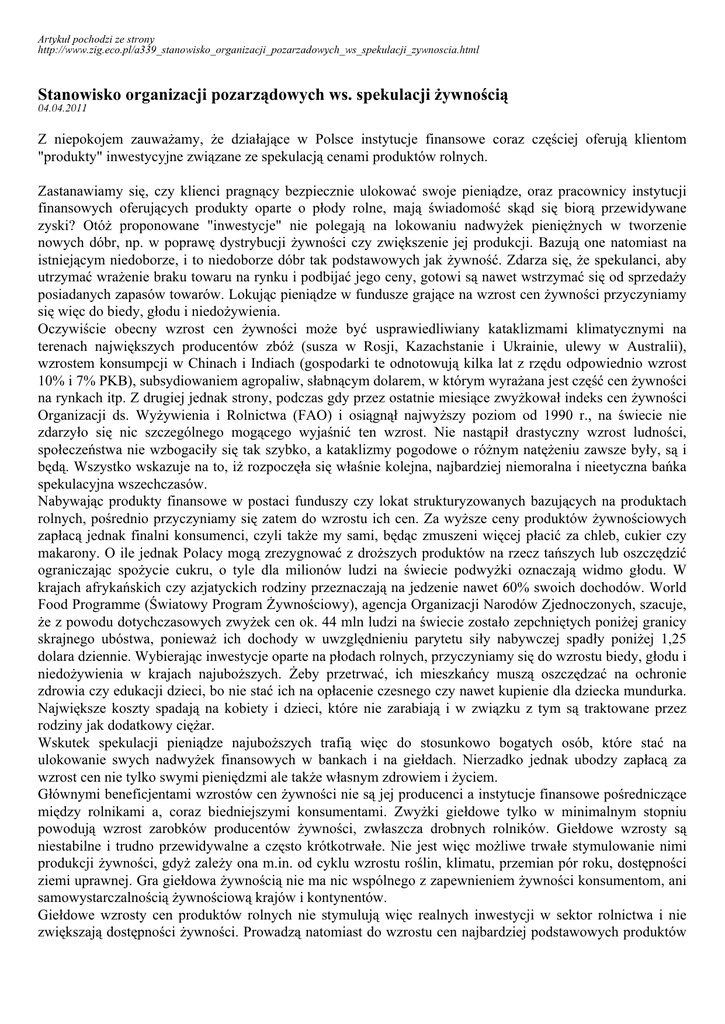 Artykuł pochodzi ze strony http://www.zig.eco.pl/a339_stanowisko_organizacji_pozarzadowych_ws_spekulacji_zywnoscia.html Stanowisko organizacji pozarządowych ws. spekulacji żywnością 04.04.2011 Z niepokojem zauważamy, że działające w Polsce instytucje finansowe coraz częściej oferują klientom "produkty" inwestycyjne związane ze spekulacją cenami produktów rolnych. Zastanawiamy się, czy klienci pragnący bezpiecznie ulokować swoje pieniądze, oraz pracownicy instytucji finansowych oferujących produkty oparte o płody rolne, mają świadomość skąd się biorą przewidywane zyski? Otóż proponowane "inwestycje" nie polegają na lokowaniu nadwyżek pieniężnych w tworzenie nowych dóbr, np. w poprawę dystrybucji żywności czy zwiększenie jej produkcji. Bazują one natomiast na istniejącym niedoborze, i to niedoborze dóbr tak podstawowych jak żywność. Zdarza się, że spekulanci, aby utrzymać wrażenie braku towaru na rynku i podbijać jego ceny, gotowi są nawet wstrzymać się od sprzedaży posiadanych zapasów towarów. Lokując pieniądze w fundusze grające na wzrost cen żywności przyczyniamy się więc do biedy, głodu i niedożywienia. Oczywiście obecny wzrost cen żywności może być usprawiedliwiany kataklizmami klimatycznymi na terenach największych producentów zbóż (susza w Rosji, Kazachstanie i Ukrainie, ulewy w Australii), wzrostem konsumpcji w Chinach i Indiach (gospodarki te odnotowują kilka lat z rzędu odpowiednio wzrost 10% i 7% PKB), subsydiowaniem agropaliw, słabnącym dolarem, w którym wyrażana jest część cen żywności na rynkach itp. Z drugiej jednak strony, podczas gdy przez ostatnie miesiące zwyżkował indeks cen żywności Organizacji ds. Wyżywienia i Rolnictwa (FAO) i osiągnął najwyższy poziom od 1990 r., na świecie nie zdarzyło się nic szczególnego mogącego wyjaśnić ten wzrost. Nie nastąpił drastyczny wzrost ludności, społeczeństwa nie wzbogaciły się tak szybko, a kataklizmy pogodowe o różnym natężeniu zawsze były, są i będą. Wszystko wskazuje na to, iż rozpoczęła się właśnie kolejna, najbardziej niemoralna i nieetyczna bańka spekulacyjna wszechczasów. Nabywając produkty finansowe w postaci funduszy czy lokat strukturyzowanych bazujących na produktach rolnych, pośrednio przyczyniamy się zatem do wzrostu ich cen. Za wyższe ceny produktów żywnościowych zapłacą jednak finalni konsumenci, czyli także my sami, będąc zmuszeni więcej płacić za chleb, cukier czy makarony. O ile jednak Polacy mogą zrezygnować z droższych produktów na rzecz tańszych lub oszczędzić ograniczając spożycie cukru, o tyle dla milionów ludzi na świecie podwyżki oznaczają widmo głodu. W krajach afrykańskich czy azjatyckich rodziny przeznaczają na jedzenie nawet 60% swoich dochodów. World Food Programme (Światowy Program Żywnościowy), agencja Organizacji Narodów Zjednoczonych, szacuje, że z powodu dotychczasowych zwyżek cen ok. 44 mln ludzi na świecie zostało zepchniętych poniżej granicy skrajnego ubóstwa, ponieważ ich dochody w uwzględnieniu parytetu siły nabywczej spadły poniżej 1,25 dolara dziennie. Wybierając inwestycje oparte na płodach rolnych, przyczyniamy się do wzrostu biedy, głodu i niedożywienia w krajach najuboższych. Żeby przetrwać, ich mieszkańcy muszą oszczędzać na ochronie zdrowia czy edukacji dzieci, bo nie stać ich na opłacenie czesnego czy nawet kupienie dla dziecka mundurka. Największe koszty spadają na kobiety i dzieci, które nie zarabiają i w związku z tym są traktowane przez rodziny jak dodatkowy ciężar. Wskutek spekulacji pieniądze najuboższych trafią więc do stosunkowo bogatych osób, które stać na ulokowanie swych nadwyżek finansowych w bankach i na giełdach. Nierzadko jednak ubodzy zapłacą za wzrost cen nie tylko swymi pieniędzmi ale także własnym zdrowiem i życiem. Głównymi beneficjentami wzrostów cen żywności nie są jej producenci a instytucje finansowe pośredniczące między rolnikami a, coraz biedniejszymi konsumentami. Zwyżki giełdowe tylko w minimalnym stopniu powodują wzrost zarobków producentów żywności, zwłaszcza drobnych rolników. Giełdowe wzrosty są niestabilne i trudno przewidywalne a często krótkotrwałe. Nie jest więc możliwe trwałe stymulowanie nimi produkcji żywności, gdyż zależy ona m.in. od cyklu wzrostu roślin, klimatu, przemian pór roku, dostępności ziemi uprawnej. Gra giełdowa żywnością nie ma nic wspólnego z zapewnieniem żywności konsumentom, ani samowystarczalnością żywnościową krajów i kontynentów. Giełdowe wzrosty cen produktów rolnych nie stymulują więc realnych inwestycji w sektor rolnictwa i nie zwiększają dostępności żywności. Prowadzą natomiast do wzrostu cen najbardziej podstawowych produktów zapewniających ludzką egzystencję, tym samym również w dużej mierze wpływają na głód, niedożywienie i wzrost niepokojów politycznych. Problem spekulowania żywnością dostrzegają ekonomiści. Prof. Andrzej Kowalski, dyrektor Instytutu Ekonomiki Rolnictwa i Gospodarki Żywnościowej Główną w wypowiedzi dla Gazety Wyborczej potwierdza, że przyczyną wzrostu cen żywności w ostatnich miesiącach na świecie są spekulacje na rynkach rolnych (Gazeta Wyborcza, 14.02.2011)*. Spekulacje giełdowe, obok niesprawiedliwych relacji handlowych, błędnej polityki rolnej, niewłaściwie zaprojektowanej pomocy rozwojowej, czynników pogodowych, klimatycznych, erozji gleby, wzrostu cen ropy, chybionych inwestycji z agropaliwa, konfliktów zbrojnych i wzrostu liczby ludności przyczyniają się do pogłębiania głodu i ubóstwa na świecie. Apelujemy więc do instytucji finansowych by kierowały się zasadami społecznej odpowiedzialności biznesu i powstrzymały się od oferowania "produktów" finansowych bazujących na spekulacji żywnością a do klientów o nie nabywanie ich. Apelujemy też do mediów o właściwe nagłaśniani