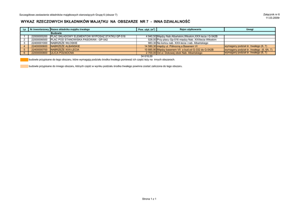 Załącznik nr 6 11.03.2009r Szczegółowe zestawienie składników majątkowych stanowiących Grupę 6 (obszar 7) WYKAZ RZECZOWYCH SKŁADNIKÓW MAJĄTKU NA OBSZARZE NR 7 - INNA DZIAŁALNOŚĆ Lp 1 2 3 4 5 6 Nr inwentarzowy Nazwa składnika majątku trwałego 22000005200 22000006500 22400001000 22400000600 22400000700 22000000800 Pow. użyt. (m2) Rejon użytkowania Budowle PLAC SKŁADOWY ELEMENTÓW WYPOSAŻ.STATKU GP-516 PLAC POD STANOWISKA PASOWAN - GP-542 NABRZEŻE WŁOSKIE NABRZEŻE ALBAŃSKIE NABRZEŻE XXX-LECIA ULICA PÓŁNOCNA 4 940,50 Między Nab.Albańskim,Włoskim,XXX-lecia i G-542B 528,00 Przy placu Gp-516 między Nab. XXXlecia iWłoskim 983,30 Na końcu nab. XXX-lecia i nab. Albańskiego 14 580,30 między ul. Północną a Basenem VI 10 885,90 Między basenem VII a bud.od G-332 do G-542B 2 700,00 Od ul. Dokowej obok Nab. Albańskiego 34 618,00 budowle przypisane do tego obszaru, które wymagają podziału środka trwałego ponieważ ich część leży na innych obszarach. budowle przypisane do innego obszaru, których część w wyniku podziału środka trwałego powinna zostać zaliczona do tego obszaru. Strona 1 z 1 Uwagi wymagany podział śr. trwałego (6, 7) wymagany podział śr. trwałego (6, 6A, 7) wymagany podział śr. trwałego (6, 7)