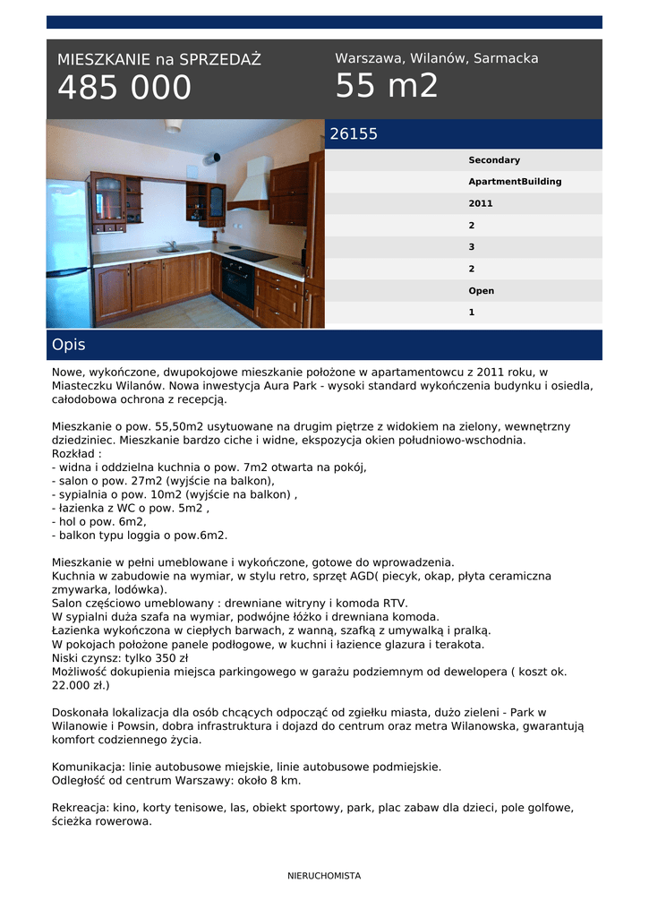 MIESZKANIE na SPRZEDAŻ 485 000 Warszawa, Wilanów, Sarmacka 55 m2 26155 Secondary ApartmentBuilding 2011 2 3 2 Open 1 Opis Nowe, wykończone, dwupokojowe mieszkanie położone w apartamentowcu z 2011 roku, w Miasteczku Wilanów. Nowa inwestycja Aura Park - wysoki standard wykończenia budynku i osiedla, całodobowa ochrona z recepcją. Mieszkanie o pow. 55,50m2 usytuowane na drugim piętrze z widokiem na zielony, wewnętrzny dziedziniec. Mieszkanie bardzo ciche i widne, ekspozycja okien południowo-wschodnia. Rozkład : - widna i oddzielna kuchnia o pow. 7m2 otwarta na pokój, - salon o pow. 27m2 (wyjście na balkon), - sypialnia o pow. 10m2 (wyjście na balkon) , - łazienka z WC o pow. 5m2 , - hol o pow. 6m2, - balkon typu loggia o pow.6m2. Mieszkanie w pełni umeblowane i wykończone, gotowe do wprowadzenia. Kuchnia w zabudowie na wymiar, w stylu retro, sprzęt AGD( piecyk, okap, płyta ceramiczna zmywarka, lodówka). Salon częściowo umeblowany : drewniane witryny i komoda RTV. W sypialni duża szafa na wymiar, podwójne łóżko i drewniana komoda. Łazienka wykończona w ciepłych barwach, z wanną, szafką z umywalką i pralką. W pokojach położone panele podłogowe, w kuchni i łazience glazura i terakota. Niski czynsz: tylko 350 zł Możliwość dokupienia miejsca parkingowego w garażu podziemnym od dewelopera ( koszt ok. 22.000 zł.) Doskonała lokalizacja dla osób chcących odpocząć od zgiełku miasta, dużo zieleni - Park w Wilanowie i Powsin, dobra infrastruktura i dojazd do centrum oraz metra Wilanowska, gwarantują komfort codziennego życia. Komunikacja: linie autobusowe miejskie, linie autobusowe podmiejskie. Odległość od centrum Warszawy: około 8 km. Rekreacja: kino, korty tenisowe, las, obiekt sportowy, park, plac zabaw dla dzieci, pole golfowe, ścieżka rowerowa. NIERUCHOMISTA Usługi: apteka, bank, bankomat, bazarek, centrum handlowe, cukiernia, delikatesy, fryzjer, kwiaciarnia, lotnisko, market, piekarnia, pralnia, przychodnia, restauracja, salon kosmetyczny, sklep 24 h, sklep spożywczy, stacja benzynowa, stomatolog, szpital, weterynarz. Instytucje: biblioteka, gimnazjum, kościół, poczta, Policja, przedszkole, Straż Miejska, Straż Pożarna, szkoła podstawowa, szkoła średnia, uczelnia wyższa. Polecam. Zapraszam na prezentację nieruchomości. ************************************************** Dokładamy wszelkich starań, by informacje, dotyczące oferowanych przez nas nieruchomości były aktualne, kompletne i sprawdzone. Więcej informacji na stronie: http://www.nieruchomista.waw.pl Nasza firma oferuje kompleksową obsługę transakcji i nieruchomości: - pomoc w uzyskaniu kredytu hipotecznego - pomoc przy finalizacji transakcji u dobrego notariusza - profesjonalny protokół zdawczo-odbiorczy - profesjonalne doradztwo w sprawach aranżacji wnętrz - bezpłatną wycenę kosztów remontu - promocyjne ceny remontów i przeprowadzek Prezentowane przez nas oferty nie stanowią oferty w rozumieniu Kodeksu Cywilnego. Treść oferty wraz ze zdjęciami objęta ochroną praw autorskich i pokrewnych na podstawie Ustawy z dnia 4 lutego 1994 (Dz. U. z 1994 r. Nr 24, poz. 83). Kopiowanie treści i zdjęć bez zgody ich twórcy podlega karze, określonej w art. 78 Ustawy. Mirosława Borowy tel. +48 602 736 555 email: [email protected] NIERUCHOMISTA Powered by TCPDF (www.tcpdf.org)