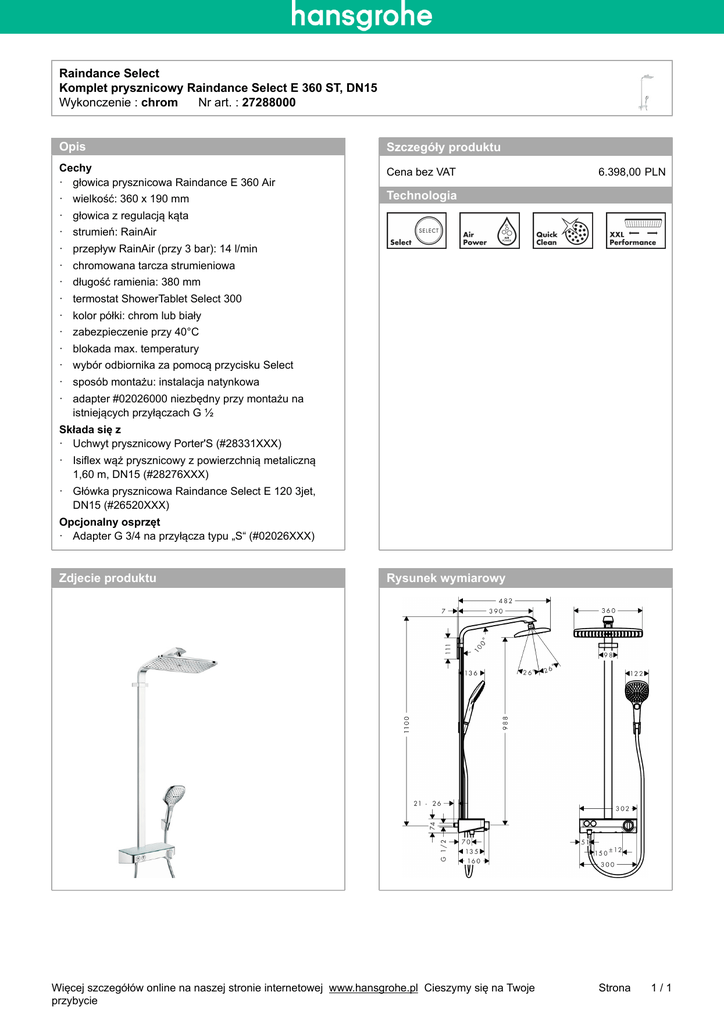 Raindance Select Komplet prysznicowy Raindance Select E 360 ST, DN15 Wykonczenie : chrom___Nr art. : 27288000 Opis Szczegóły produktu Cechy · głowica prysznicowa Raindance E 360 Air Cena bez VAT · wielkość: 360 x 190 mm 6.398,00-PLN Technologia · głowica z regulacją kąta · strumień: RainAir · przepływ RainAir (przy 3 bar): 14 l/min · chromowana tarcza strumieniowa · długość ramienia: 380 mm · termostat ShowerTablet Select 300 · kolor półki: chrom lub biały · zabezpieczenie przy 40°C · blokada max. temperatury · wybór odbiornika za pomocą przycisku Select · sposób montażu: instalacja natynkowa · adapter #02026000 niezbędny przy montażu na istniejących przyłączach G ½ Składa się z · Uchwyt prysznicowy Porter'S (#28331XXX) · Isiflex wąż prysznicowy z powierzchnią metaliczną 1,60 m, DN15 (#28276XXX) · Główka prysznicowa Raindance Select E 120 3jet, DN15 (#26520XXX) Opcjonalny osprzęt · Adapter G 3/4 na przyłącza typu „S“ (#02026XXX) Zdjecie produktu Rysunek wymiarowy Więcej szczegółów online na naszej stronie internetowej_www.hansgrohe.pl_Cieszymy się na Twoje przybycie Strona 1/1