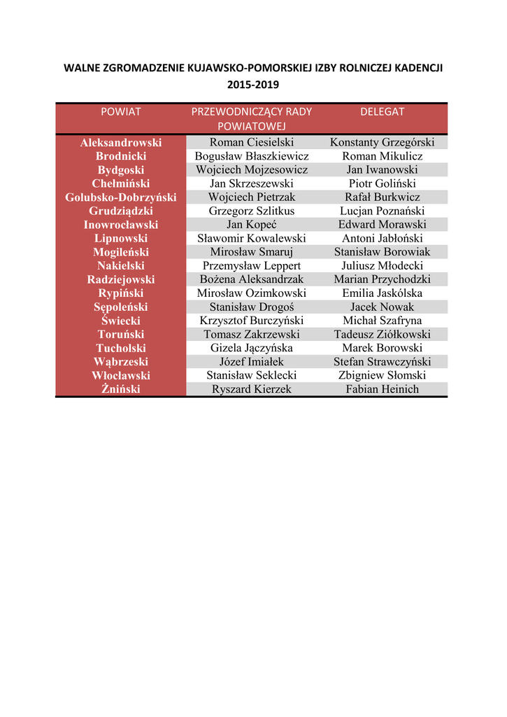 WALNE ZGROMADZENIE KUJAWSKO-POMORSKIEJ IZBY ROLNICZEJ KADENCJI 2015-2019 POWIAT Aleksandrowski Brodnicki Bydgoski Chełmiński Golubsko-Dobrzyński Grudziądzki Inowrocławski Lipnowski Mogileński Nakielski Radziejowski Rypiński Sępoleński Świecki Toruński Tucholski Wąbrzeski Włocławski Żniński PRZEWODNICZĄCY RADY POWIATOWEJ Roman Ciesielski Bogusław Błaszkiewicz Wojciech Mojzesowicz Jan Skrzeszewski Wojciech Pietrzak Grzegorz Szlitkus Jan Kopeć Sławomir Kowalewski Mirosław Smaruj Przemysław Leppert Bożena Aleksandrzak Mirosław Ozimkowski Stanisław Drogoś Krzysztof Burczyński Tomasz Zakrzewski Gizela Jączyńska Józef Imiałek Stanisław Seklecki Ryszard Kierzek DELEGAT Konstanty Grzegórski Roman Mikulicz Jan Iwanowski Piotr Goliński Rafał Burkwicz Lucjan Poznański Edward Morawski Antoni Jabłoński Stanisław Borowiak Juliusz Młodecki Marian Przychodzki Emilia Jaskólska Jacek Nowak Michał Szafryna Tadeusz Ziółkowski Marek Borowski Stefan Strawczyński Zbigniew Słomski Fabian Heinich 19 żniński Heinich Ryszard Kierzek Fabian