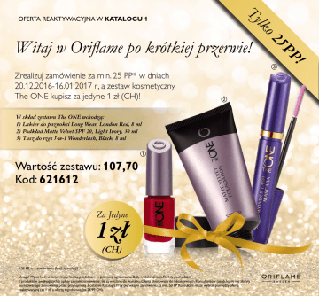 P 5P o2 lk Ty OFERTA REAKTYWACYJNA W KATALOGU 1 Witaj w Oriflame po krótkiej przerwie! Zrealizuj zamówienie za min. 25 PP* w dniach 20.12.2016-16.01.2017 r., a zestaw kosmetyczny The ONE kupisz za jedyne 1 zł (CH)! b W skład zestawu The ONE wchodzą: 1) Lakier do paznokci Long Wear, London Red, 8 ml 2) Podkład Matte Velvet SPF 20, Light Ivory, 30 ml 3) Tusz do rzęs 5-w-1 Wonderlash, Black, 8 ml a Wartość zestawu: 107,70 Kod: 621612 Za Jedyne 1zł (CH) * 25 PP w 1 zamówieniu (brak kumulacji) Uwaga! Wpisz kod na zamówieniu. Liczba produktów w promocji ograniczona. Brak wielokrotności. Punkty pochodzące z produktów zwalniających z opłaty za małe zamówienie nie są wliczane do warunku.Oferta skierowana do Nieaktywnych Konsultantów (osób, które nie złożyły punktowanego zamówienia przez przynajmniej 3 ostatnie Katalogi). Przy pierwszym zamówieniu za min. 50 PP Konsultant może wybrać pomiędzy ofertą reaktywacyjną (za 1 zł) a ofertą tygodniową (za 24,99 CH). ! c
