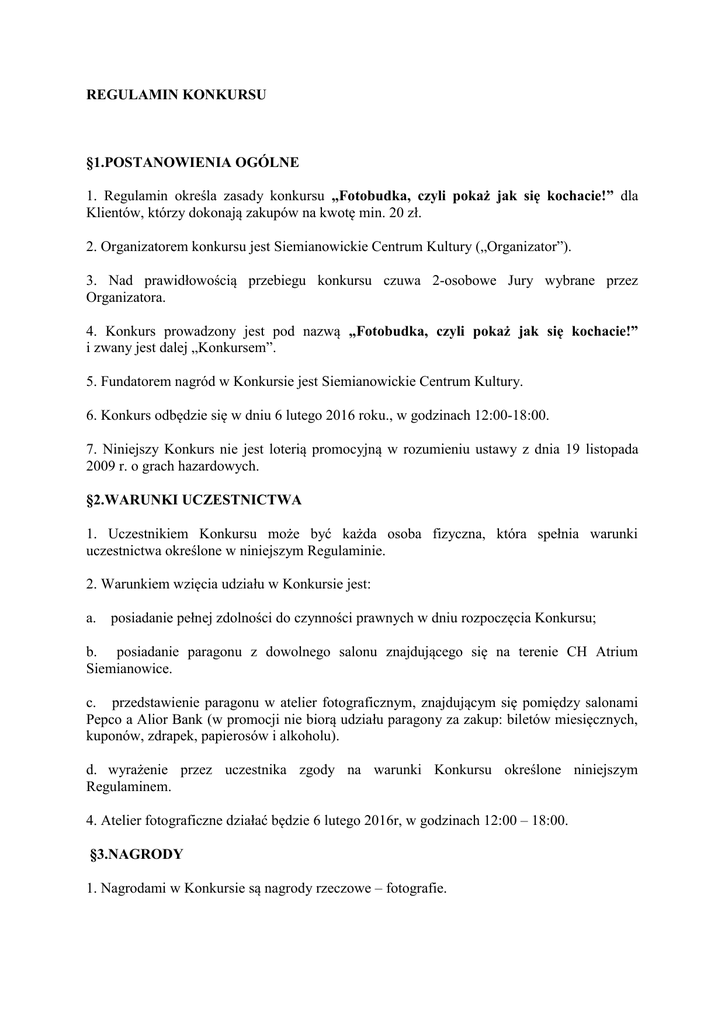 REGULAMIN KONKURSU §1.POSTANOWIENIA OGÓLNE 1. Regulamin określa zasady konkursu „Fotobudka, czyli pokaż jak się kochacie!” dla Klientów, którzy dokonają zakupów na kwotę min. 20 zł. 2. Organizatorem konkursu jest Siemianowickie Centrum Kultury („Organizator”). 3. Nad prawidłowością przebiegu konkursu czuwa 2-osobowe Jury wybrane przez Organizatora. 4. Konkurs prowadzony jest pod nazwą „Fotobudka, czyli pokaż jak się kochacie!” i zwany jest dalej „Konkursem”. 5. Fundatorem nagród w Konkursie jest Siemianowickie Centrum Kultury. 6. Konkurs odbędzie się w dniu 6 lutego 2016 roku., w godzinach 12:00-18:00. 7. Niniejszy Konkurs nie jest loterią promocyjną w rozumieniu ustawy z dnia 19 listopada 2009 r. o grach hazardowych. §2.WARUNKI UCZESTNICTWA 1. Uczestnikiem Konkursu może być każda osoba fizyczna, która spełnia warunki uczestnictwa określone w niniejszym Regulaminie. 2. Warunkiem wzięcia udziału w Konkursie jest: a. posiadanie pełnej zdolności do czynności prawnych w dniu rozpoczęcia Konkursu; b. posiadanie paragonu z dowolnego salonu znajdującego się na terenie CH Atrium Siemianowice. c. przedstawienie paragonu w atelier fotograficznym, znajdującym się pomiędzy salonami Pepco a Alior Bank (w promocji nie biorą udziału paragony za zakup: biletów miesięcznych, kuponów, zdrapek, papierosów i alkoholu). d. wyrażenie przez uczestnika zgody na warunki Konkursu określone niniejszym Regulaminem. 4. Atelier fotograficzne działać będzie 6 lutego 2016r, w godzinach 12:00 – 18:00. §3.NAGRODY 1. Nagrodami w Konkursie są nagrody rzeczowe – fotografie. 2. Nagrody będą do odebrania w atelier fotograficznym znajdującym się pomiędzy salonami Pepco a Alior Bank w dniu 6 lutego 2016r, w godzinach od 12:00 do 18:00. Wykonane zdjęcia będą na bieżąco drukowane w jakości fotograficznej, w formacie A6. Osoby fotografowane będą je mogły zabrać ze sobą na pamiątkę (czas oczekiwania na odbiór zdjęcia, 5 – 15 minut. Osoby, które pozostawią u obsługujących kontakt mailowy, otrzymają również zdjęcia w formie elektronicznej (w dn. 8.02). 3. Warunkiem odbioru nagrody jest odbiór osobisty nagrody przez uczestnika. 4. Uczestnikowi nie przysługuje prawo żądania wymiany nagrody rzeczowej na ekwiwalent pieniężny. §4.ZASADY PRZYZNAWANIA NAGRÓD 1. Konkurs wymaga od uczestnika dostarczenia do punktu atelier fotograficznego paragonu na kwotę min. 20 zł. Paragony łączą się w kwotę zakupu z danego dnia. Paragony można rejestrować i wykonywać fotografie wyłącznie w dniu dokonania zakupu. Paragon zostanie ostemplowany. Jeden paragon może być jednokrotnie wykorzystany. 2. Za każde wydane 20 zł przysługiwać będzie możliwość wykonania fotografii. 3. Organizator zastrzega sobie możliwość ch.pl/siemianowice wybranych fotografii. publikacji na stronie www.atrium- 4. Uczestnicy udzielają Organizatorowi nieograniczonej w czasie licencji na opublikowanie na stronie internetowej Centrum Handlowego Atrium Siemianowice www.atriumch.pl/siemianowice przekazanych Organizatorowi fotografii oraz wykorzystanie wizerunku. 6. Wynagrodzenie za udzielenie licencji stanowi nagroda, o której mowa w par. 3 ust. 1. §5.REKLAMACJE 1. Wszelkie reklamacje dotyczące sposobu przeprowadzenia Konkursu uczestnicy winni zgłaszać na piśmie w czasie trwania Konkursu lub w terminie nie dłuższym niż 60 dni od jego zakończenia. 2. Pisemna reklamacja powinna zawierać imię, nazwisko, dokładny adres uczestnika oraz wskazanie przyczyny reklamacji. Reklamacja powinna być przesłana na adres Organizatora (Siemianowickie Centrum kultury, ul. Niepodległości 45, 41-106 Siemianowice) z dopiskiem „KONKURS– Fotobudka, czyli pokaż jak się kochacie!”. 3. Reklamacje rozpatrywane będą przez Organizatora niezwłocznie po ich otrzymaniu. §6.POSTANOWIENIA KOŃCOWE 1. Regulamin Konkursu dostępny jest w Atelier Fotograficznym, Biurze Dyrekcji CH Atrium Siemianowice oraz na stronie internetowej http://www.atrium-ch.pl/siemianowice 2. W sprawach nieuregulowanych niniejszym Regulaminem będą miały zastosowanie odpowiednie przepisy powszechnie obowiązującego prawa.