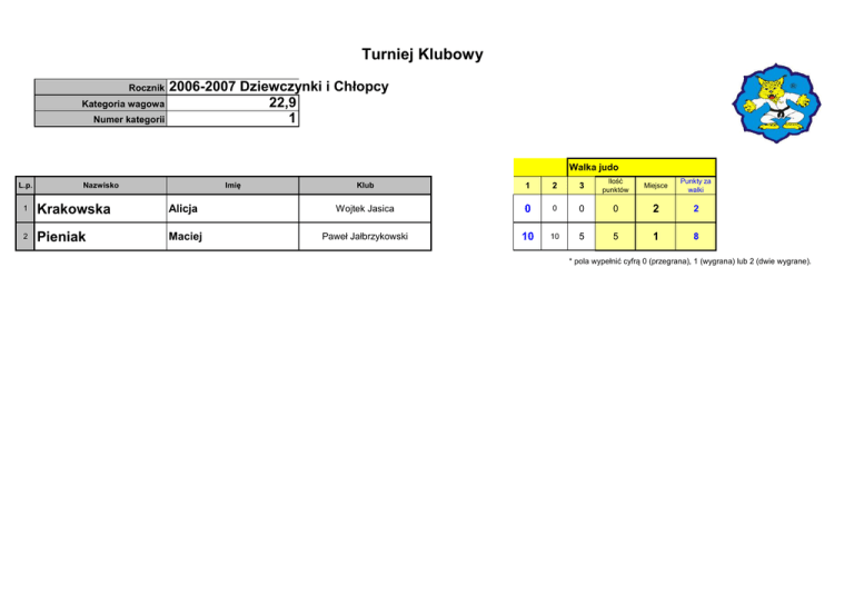 Turniej Klubowy Rocznik Kategoria wagowa Numer kategorii 2006-2007 Dziewczynki i Chłopcy 22,9 1 2 Walka judo L.p. Imię Nazwisko Klub 1 2 3 Ilość punktów Miejsce Punkty za walki 1 Krakowska Alicja Wojtek Jasica 0 0 0 0 2 2 2 Pieniak Maciej Paweł Jałbrzykowski 10 10 5 5 1 8 * pola wypełnić cyfrą 0 (przegrana), 1 (wygrana) lub 2 (dwie wygrane). Turniej Klubowy Rocznik Kategoria wagowa Numer kategorii 2006-2007 Dziewczynki i Chłopcy 24,7 2 5 Walka judo L.p. Imię Nazwisko Klub 1 2 1 Koperwas Jan Jarosław Szczepaniak 10 2 Sławek Miłosz Adam Czyż 0 3 Kornatka Kacper Jarosław Szczepaniak 10 4 Jankowski Adam Adam Czyż 0 5 Strzelczyk Aleksander Paweł Jałbrzykowski 3 4 5 6 10 8 9 10 0 0 0 10 10 Ilość punktów Miejsce Punkty za walki 10 40 1 10 4 1 4 4 4 25 2 8 4 0 5 2 4 17 3 6 4 1 10 0 7 7 5 0 0 0 0 * pola wypełnić cyfrą 0 (przegrana), 1 (wygrana) lub 2 (dwie wygrane). Jedna walka to jedna kolumna. 0 0 0 0 0 Turniej Klubowy Rocznik Kategoria wagowa Numer kategorii 2006-2007 Dziewczynki i Chłopcy 25,8 3 5 Walka judo L.p. Imię Nazwisko Klub 1 2 1 Chudzik Dawid Adam Czyż 0 2 Jemielity Mateusz Jarosław Szczepaniak 10 3 Markowski Rafał Adam Czyż 0 4 Kaszuba Kamila Adam Czyż 10 5 Wereszczyński Wiktor Adam Czyż 3 4 5 6 0 8 9 0 0 10 10 7 10 Ilość punktów Miejsce Punkty za walki 0 0 5 2 4 30 2 8 4 10 4 4 4 20 3 6 4 37 1 10 4 10 0 0 10 7 0 10 0 10 10 * pola wypełnić cyfrą 0 (przegrana), 1 (wygrana) lub 2 (dwie wygrane). Jedna walka to jedna kolumna. 0 0 0 0 0 Turniej Klubowy Rocznik Kategoria wagowa Numer kategorii 2006-2007 Dziewczynki i Chłopcy 26,5 4 5 Walka judo L.p. Imię Nazwisko Klub 1 2 1 Dąbrowski Bartosz Adam Czyż 10 2 Walkiewicz Tymoteusz Adam Czyż 0 3 Borzęcki Jakub Paweł Jałbrzykowski 10 4 Jadczak Wiktoria Adam Czyż 0 5 Ring Michał Wojtek Jasica 3 4 5 6 7 8 9 0 0 0 0 10 10 Ilość punktów Miejsce Punkty za walki 0 17 3 6 4 0 5 2 4 27 1 10 4 8 4 4 4 20 2 8 4 0 10 0 10 7 7 1 7 0 0 * pola wypełnić cyfrą 0 (przegrana), 1 (wygrana) lub 2 (dwie wygrane). Jedna walka to jedna kolumna. 0 0 0 0 0 Turniej Klubowy Rocznik Kategoria wagowa Numer kategorii 2006-2007 Dziewczynki i Chłopcy 28 5 5 Walka judo L.p. Imię Nazwisko Klub 1 2 1 Limanowski Stanisław Jarosław Szczepaniak 0 2 Sokulski Szymon Paweł Jałbrzykowski 10 3 Nycz Kaja Jarosław Szczepaniak 0 4 Bodnar Maciej Paweł Jałbrzykowski 10 5 Śmietańska Maja Adam Czyż 3 4 5 6 0 8 9 0 10 10 10 0 10 Ilość punktów Miejsce Punkty za walki 0 0 5 2 4 40 1 10 4 20 3 6 4 30 2 8 4 10 4 4 4 10 0 10 0 7 10 10 0 0 10 * pola wypełnić cyfrą 0 (przegrana), 1 (wygrana) lub 2 (dwie wygrane). Jedna walka to jedna kolumna. 0 0 0 0 0 Turniej Klubowy Rocznik Kategoria wagowa Numer kategorii 2006-2007 Dziewczynki i Chłopcy 28,7 6 5 Walka judo L.p. Imię Nazwisko Klub 1 2 1 Wroński Juliusz Adam Czyż 10 2 Kosmatka Michał Adam Czyż 0 3 Gałczyński Aleksander Adam Czyż 10 4 Rozmysłowicz Ewa Paweł Jałbrzykowski 0 5 Dominiczak Marcel Wojtek Jasica 3 4 5 6 10 8 9 10 0 0 0 10 10 Ilość punktów Miejsce Punkty za walki 7 37 1 10 4 10 4 4 4 15 3 6 4 0 5 2 4 30 2 8 4 10 5 0 10 7 0 0 0 10 0 * pola wypełnić cyfrą 0 (przegrana), 1 (wygrana) lub 2 (dwie wygrane). Jedna walka to jedna kolumna. 0 0 0 0 0 Turniej Klubowy Rocznik Kategoria wagowa Numer kategorii 2006-2007 Dziewczynki i Chłopcy 29,4 7 5 Walka judo L.p. Imię Nazwisko Klub 1 2 1 Czerbniak Igor Adam Czyż 0 2 Gumieniak Maciej Paweł Jałbrzykowski 10 3 Marciniak Barbara Jarosław Szczepaniak 0 4 Tataj Julia Adam Czyż 10 5 Fafiński Stanisław Paweł Jałbrzykowski 3 4 5 6 0 8 9 0 10 0 10 0 10 Ilość punktów Miejsce Punkty za walki 0 0 5 2 4 20 2 8 4 20 2 8 4 40 1 10 4 20 2 8 4 0 10 10 0 7 0 10 10 10 10 * pola wypełnić cyfrą 0 (przegrana), 1 (wygrana) lub 2 (dwie wygrane). Jedna walka to jedna kolumna. 0 0 0 0 0 Turniej Klubowy Rocznik Kategoria wagowa Numer kategorii 2006-2007 Dziewczynki i Chłopcy 30,4 8 5 Walka judo L.p. Imię Nazwisko Klub 1 2 1 Hycnar Mateusz Paweł Jałbrzykowski 0 2 Mozer Dominik Adam Czyż 10 3 Kołakowski Tomek Adam Czyż 7 4 Maliszewska Julia Wojtek Jasica 0 5 Bujakowski Filip Jarosław Szczepaniak 3 4 5 6 0 8 9 0 10 10 7 10 10 Ilość punktów Miejsce Punkty za walki 0 0 5 2 4 40 1 10 4 14 3 6 4 5 4 4 4 27 2 8 4 10 0 0 0 7 0 5 0 7 10 * pola wypełnić cyfrą 0 (przegrana), 1 (wygrana) lub 2 (dwie wygrane). Jedna walka to jedna kolumna. 0 0 0 0 0 Turniej Klubowy Rocznik Kategoria wagowa Numer kategorii 2006-2007 Dziewczynki i Chłopcy 31,1 9 4 Walka judo Klub 1 2 1 Święch Mateusz Adam Czyż 0 2 Gorochow Zuzia Wojtek Jasica 10 3 Wdowczyk Kacpaer Adam Czyż 0 4 Paszek Damian Paweł Jałbrzykowski 10 3 4 10 0 0 10 5 inna kategria lub przerwa Imię Nazwisko inna kategria lub przerwa L.p. Ilość punktów Miejsce Punkty za walki 10 3 6 3 10 20 2 8 3 0 0 4 2 3 30 1 10 3 6 0 10 * pola wypełnić cyfrą 0 (przegrana), 1 (wygrana) lub 2 (dwie wygrane). Jedna walka to jedna kolumna. 0 0 0 0 Turniej Klubowy Rocznik Kategoria wagowa Numer kategorii 2006-2007 Dziewczynki i Chłopcy 33,8 10 4 Walka judo Klub 1 2 1 Wyka Jakub Jarosław Szczepaniak 0 2 Lewandowski Janek Adam Czyż 7 3 Kardaszewski Dawid Wojtek Jasica 10 4 Stachowiak Oliwia Adam Czyż 0 3 4 0 7 10 0 5 inna kategria lub przerwa Imię Nazwisko inna kategria lub przerwa L.p. Ilość punktów Miejsce Punkty za walki 0 4 2 3 0 14 2 8 3 10 30 1 10 3 1 3 6 3 6 0 1 * pola wypełnić cyfrą 0 (przegrana), 1 (wygrana) lub 2 (dwie wygrane). Jedna walka to jedna kolumna. 0 0 0 0 Turniej Klubowy Rocznik Kategoria wagowa Numer kategorii 2006-2007 Dziewczynki i Chłopcy 36,8 11 3 Imię Nazwisko Klub 1 1 Mokrzycki Kuba Jarosław Szczepaniak 0 2 Kaczmarski Jan Jarosław Szczepaniak 10 3 Korba Natalia Adam Czyż 2 0 10 inna kategria lub przerwa L.p. inna kategria lub przerwa Walka judo Ilość punktów Miejsce Punkty za walki 0 3 2 2 10 20 1 10 2 0 10 2 6 2 3 * pola wypełnić cyfrą 0 (przegrana), 1 (wygrana) lub 2 (dwie wygrane). Jedna walka to jedna kolumna. 0 0 0 Turniej Klubowy 
