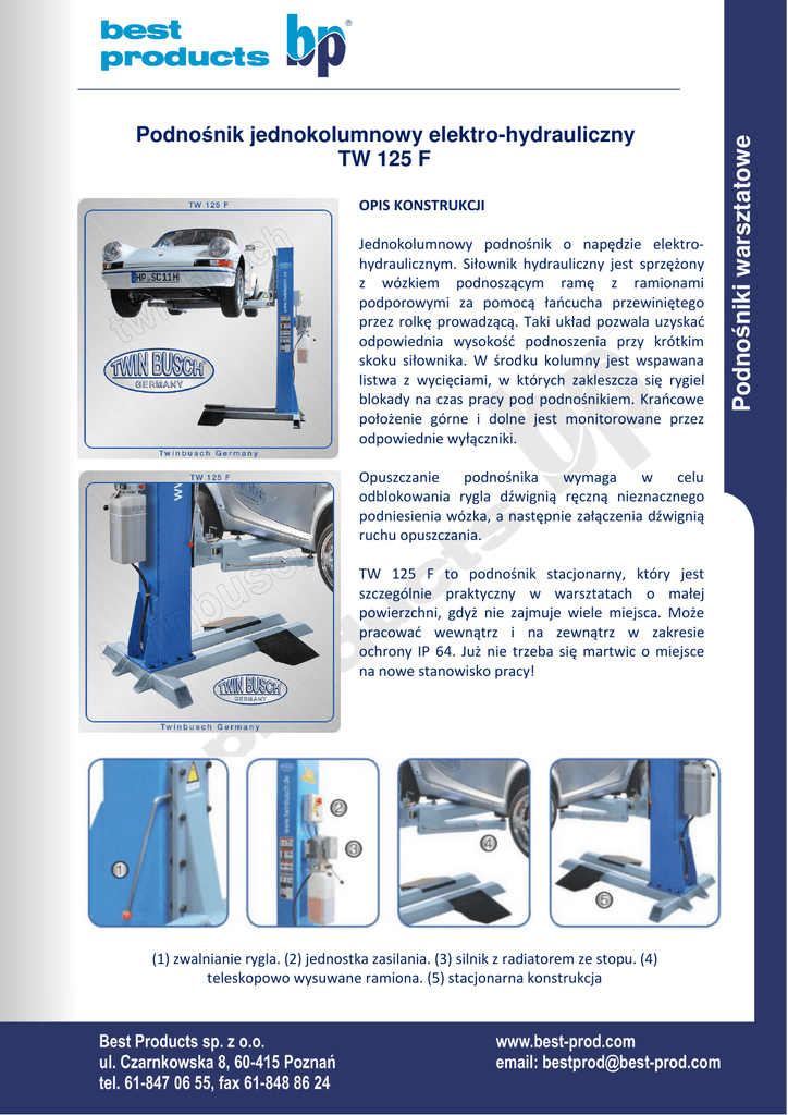 OPIS KONSTRUKCJI Jednokolumnowy podnośnik o napędzie elektrohydraulicznym. Siłownik hydrauliczny jest sprzężony z wózkiem podnoszącym ramę z ramionami podporowymi za pomocą łańcucha przewiniętego przez rolkę prowadzącą. Taki układ pozwala uzyskać odpowiednia wysokość podnoszenia przy krótkim skoku siłownika. W środku kolumny jest wspawana listwa z wycięciami, w których zakleszcza się rygiel blokady na czas pracy pod podnośnikiem. Krańcowe położenie górne i dolne jest monitorowane przez odpowiednie wyłączniki. Opuszczanie podnośnika wymaga w celu odblokowania rygla dźwignią ręczną nieznacznego podniesienia wózka, a następnie załączenia dźwignią ruchu opuszczania. TW 125 F to podnośnik stacjonarny, który jest szczególnie praktyczny w warsztatach o małej powierzchni, gdyż nie zajmuje wiele miejsca. Może pracować wewnątrz i na zewnątrz w zakresie ochrony IP 64. Już nie trzeba się martwic o miejsce na nowe stanowisko pracy! (1) zwalnianie rygla. (2) jednostka zasilania. (3) silnik z radiatorem ze stopu. (4) teleskopowo wysuwane ramiona. (5) stacjonarna konstrukcja Podnośniki warsztatowe Podnośnik jednokolumnowy elektro-hydrauliczny TW 125 F • • • • • • • • • • • • • udźwig: 2500 kg max wysokość unoszenia: 1800-2000 mm max szerokość pojazdu: 1800mm napęd elektrohydrauliczny, blokady położenia wózków - rygle sterowane ręcznie, teleskopowe ramiona, czas podnoszenia: 35 s napięcie zasilania: 400 V, 50Hz moc silnika: 2,2 kW poziom hałasu: <60dB wymiary całkowite : 2470 x 2030 x 2600 mm temperatura środowiska pracy -5°/+40° stopień izolacji: IP64 waga: 720 kg deklaracja CE Wymiary podnośnika w wersji stacjonarnej TW 125F Podnośniki warsztatowe DANE TECHNICZNE