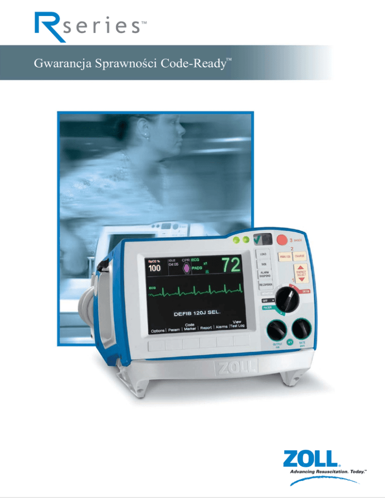 Gwarancja Sprawności Code-Ready™ Specyfikacja ogólna: Wymiary: wys. 20,8 cm x szer. 26.7 cm x głęb. 31,7 cm Masa:6,2 kg z przewodem OneStep i akumulatorem SurePower™ Battery. Dodatkowo z łyżkami 6,9 kg Zasilanie: zintegrowany zasilacz:220-240V, 50Hz Standardy: spełnia lub przewyższa wymogi standardów UL 60601, AAMI DF 80, IEC 60601-2-4, EN 60601-2-25, EN 60601-2-27. Klasa ochronności Klasa I zgodnie z EN 60601-1 Zabezpieczenie: wszystkie połączenia pacjenta elektrycznie izolowane Warunki pracy: Temperatura pracy: 0 °C do 40 °C Temperatura przechowywania: -20 °C do + 60 °C. Wilgotność: względna, bez kondensacji: 5% – 95% .Wibracje: 68-2-6 IEC i 68-2-34 IEC;. Stopień ochrony: IEC 529, IP22. Wstrząsy: 68-2-27 IEC , 50 g 6mS; . Ciśnienie : 594 do 1060 milibarów; Zgodność Elektromagnetyczna (EMC): CISPR 11 Klasa B Promieniowania i Emisji Odporność Elektromagnetyczna: AAMI DF80, EN 61000-4-3 do 10 V/m. Wyładowanie Elektrostatyczne: AAMI DF80, EN 61000-4-2. Odporność na zakłócenia: 61000-4-4 EN , 61000-45, 61000-4-6. Liniowa dwufazowa krzywa defibrylacji Monitorowanie CPR Dashboard ZOLL Medical Corporation Worldwide Headquarters 269 Mill Road Chelmsford, MA 01824 978-421-9655 800-348-9011 www.zoll.com/contacts. Defibrylator Typ impulsu : dwufazowy prostokątny Zakres impedancji pacjenta : 15 -300Ω Energia defibrylacji zakres: dorośli : 1,2,3,4,5,6,7,8,9,10, 15, 20, 30,50, 75,100, 120, 150, 200 J dzieci: 1,2,3,4,5,6,7,8,9,10, 15, 20, 30,50, 70,85,100, 120, 150, 200 J z kompensacją impedancji pacjenta z użyciem łyżek i elektrod przyklejanych. Automatyczne ustawienie energii dla protokołu dziecięcego i dla dorosłych Czas ładowania: poniżej 7 s z nowym, naładowanym akumulatorem Kardiowersja: impuls defibrylacyjny synchronizowany załamkiem R, komunikat SYNC na monitorze, znacznik na krzywej EKG (na ekranie i wydruku) Elektrody: Łyżki zintegrowane dla dorosłych i dzieci; z przyciskami wyboru energii, ładowania, rozładowania, defibrylacji i wydruku Test automatyczny : weryfikuje elektronikę defibrylatora , przewody, elektrody i ich stan, bez konieczności dodatkowych czynności Funkcja doradcza defibrylacji Analiza prawidłowości podłączenia elektrod oraz zapisu EKG, określa konieczność / brak potrzeby defibrylacji. Konfigurowany protokół CPR i sekwencje energii. Monitorowanie EKG: Przewód 3 lub 5 elektrodowy, łyżki lub elektrody przyklejane. Zabezpieczenie wewnętrzne: Całkowita ochrona defibrylatora . Przewody z zabezpieczeniem sygnału EKG przed impulsem stymulatora. Pasmo przenoszenia: standardowe 0,5–21 Hz, diagnostyczne 0,05–150 Hz, opcjonalnie 0.5–40 Hz i 1–21 Hz programowane przez użytkownika Wybór odprowadzeń: I, II, III aVR, aVL, aVF, V,P1,P2,P3, łyżki lub elektrody przyklejane OneStep. Wzmocnienie sygnalu EKG: 0.5, 1.0, 1.5, 2.0 3.0 cm/mV wyświetlane na ekranie. Zakres pomiarowy częstości: 0-300 1/min. Alarm częstości rytmu: programowany automatycznie lub przez użytkownika: tachykardia 60–280 1/min., bradykardia 20–100 1/min., włączenie/wyłączenie alarmu sygnalizowane na ekranie Monitorowanie CPR (opcja) Aktywuje się po podłączeniu elektrod OneStep CPR lub OneStep Complete. Wyświetla: Głębokość nacisku: 1,9-7,6 cm ± 0,6 cm Częstość nacisku: 50-150 1/min. Czas od ostatniego nacisku Wykres słupkowy zwolnienia ucisku Wskażnik Wydajności Perfuzji WWP(PPI) Integruje głębokość i częstość kompresji obrazując prawidłowości RKO CPR™ Filter (opcja) filtr sygnału EKG eliminuje artefakty związane z uciskiem klatki piersiowej Ekran Typ: kolorowy, LCD Wielkość ekranu: przekątna 16,5 cm (6,5” ) Rozdzielczość : 640 x 480 Ilość kanałów maksymalnie 3 krzywe dynamiczne Prędkość przesuwu 25 mm/s Akumulator : 10.8 V litowo-jonowy Pojemność 5,8 Ah Czas ładowania: <5 godz. z wewnętrznej ładowarki. Czas pracy naładowanego nowego akumulatora w temp.20ºC: > 4 godz. monitorowania EKG 100 defibrylacji z maksymalną energią 200 J 3,5 godz. stymulacji i monitorowania prądem 60 mA z częstością 80 /min. Funkcje komunikacji Wejście synchronizacji 0–5V (TTL) Wyjście synchronizacji 0–5V (TTL) Wyjście EKG 1V/cm Karta pamięci Compact flash Gniazdo USB (opcja) Komunikacja bezprzewodowa kompatybilna ze standardami 802.11b, 802.11g Pamięć wewnętrzna: 350 epizodów lub 350 odcinków EKG Drukarka Papier termiczny, szerokość 90 mm, szerokość siatki 80 mm Opóźnienie 6 sekund Metoda wydruku: głowica termiczna wysokiej rozdzielczości Dystrybutor : Lifemed Poland Sp.z o.o. ul. Cybernetyki 19b 02-677 Warszawa Tel. 0 22 862 83 75/76 Tryb pracy: ręczny lub automatyczny, konfigurowany przez użytkownika Wydruk automatyczny 15 sekund zapisu inicjowane alarmem lub zabiegiem defibrylacji EKG Szybkość wydruku 25 mm/s Stymulator (opcja) Tryb pracy: synchroniczny i asynchroniczny. Impuls: prostokątny stałoprądowy Czas trwania impulsu:40 ms dokładność ± 2 ms Prąd stymulacji :0 - 140 mA dokładność±5% lub 5 mA Częstość stymulacji:30- 180 1/min. ±1,5% Zabezpieczenie wyjścia: Całkowita izolacja, zabezpieczenie przed impulsem defibrylacyjnym Pulsoksymetr Masimo SET (opcja) Zakres saturacji: 1–100% rozdzielczość 1% Zakres pulsu: 25–240 1/min rozdzielczość 1/min Dokładność pomiaru SpO2: w spoczynku dorośli +/-2% noworodki +/-3% w ruchu +/-3% Dokładność pomiaru pulsu: w spoczynku ± 3 /min w ruchu ± 5 /min Kapnograf CO2 (opcja) Przetwornik : ze strumienia głównego CAPNOSTAT 5 Czas rozgrzewania komory poniżej 2 min. do osiągnięcia pełnego zakresu pomiarowego, wykres po 15 s. Temperatura: pracy: 0°C - 40°C przechowywania: -40°C to 70°C. NIBP (opcja) Zastosowanie: dorośli , dzieci, noworodki Metoda pomiaru: oscylometryczna Sterowanie: automatyczne i ręczne Pomiar automatyczny co:2.5, 3, 4, 5, 6, 7, 8, 9, 10, 15, 20, 30, 45, 60, 90, 120 min. Tryb STAT Wyświetlanie: Ciśnienie skurczowe, rozkurczowe, średnie w mmHg lub kPa Zakres pomiarowy: sk