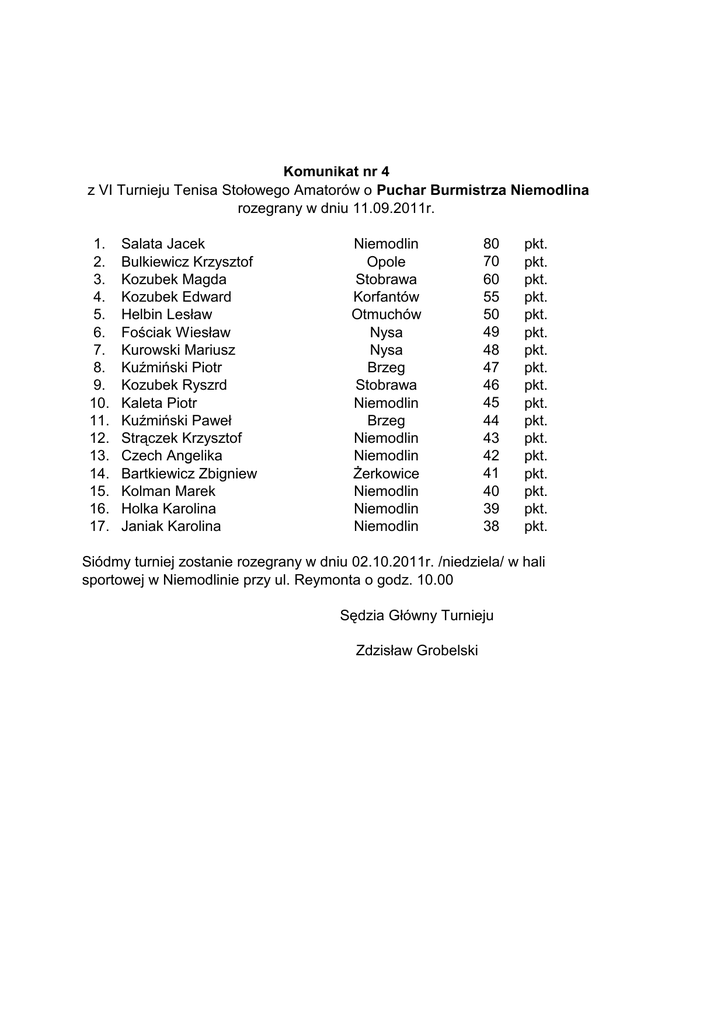 Komunikat nr 4 z VI Turnieju Tenisa Stołowego Amatorów o Puchar Burmistrza Niemodlina rozegrany w dniu 11.09.2011r. 1. 2. 3. 4. 5. 6. 7. 8. 9. 10. 11. 12. 13. 14. 15. 16. 17. Salata Jacek Bulkiewicz Krzysztof Kozubek Magda Kozubek Edward Helbin Lesław Fościak Wiesław Kurowski Mariusz Kuźmiński Piotr Kozubek Ryszrd Kaleta Piotr Kuźmiński Paweł Strączek Krzysztof Czech Angelika Bartkiewicz Zbigniew Kolman Marek Holka Karolina Janiak Karolina Niemodlin Opole Stobrawa Korfantów Otmuchów Nysa Nysa Brzeg Stobrawa Niemodlin Brzeg Niemodlin Niemodlin Żerkowice Niemodlin Niemodlin Niemodlin 80 70 60 55 50 49 48 47 46 45 44 43 42 41 40 39 38 pkt. pkt. pkt. pkt. pkt. pkt. pkt. pkt. pkt. pkt. pkt. pkt. pkt. pkt. pkt. pkt. pkt. Siódmy turniej zostanie rozegrany w dniu 02.10.2011r. /niedziela/ w hali sportowej w Niemodlinie przy ul. Reymonta o godz. 10.00 Sędzia Główny Turnieju Zdzisław Grobelski Klasyfikacja po turniejach rozegranych w 2011r. 1. 2. 3. 4. 5. 6. 7. 8. 9. 10. 11. 12. 13. 14. 15. 16. 17. 18. 19. 20. 21. 22. 23. 24. 25. 26. 27. 28. 29. 30. 31. 32-33. 34. 35. 36-37. 38. 39. 40-41. 42. 43-44. Pacek Marek Helbin Lesław Kozubek Magda Bulkiewicz Krzysztof Gall Sebastian Patrys Jan Fościak Wiesław Jabłoński Paweł Micuń Edward Kozubek Ryszrd Salata Jacek Kuźmiński Piotr Połoszczański Dawid Kozubek Edward Kurowski Mariusz Kuźmiński Paweł Strączek Krzysztof Miarecki Jędrzej Kaleta Piotr Krzyżanowski Wojciech Bartkiewicz Zbigniew Jaraszek Sanjaya Marchalewicz Wacław Czech Angelika Janiak Karolina Holka Karolina Pastuszczak Patryk Kolman Marek Kliś Marta Szymeczko Wiesław Pastuszczak Karolina Bajor Natalia Nowak Aleksandra Struzikiewicz Jerzy Warzycha Dominika Frączek Zbigniew Siwek Adam Łach Jakub Połoszczański Marek Gall Jakub Bawełkiewicz Marta Angerman Janusz Izydorczyk Jan I 55 42 43 34 60 49 41 50 44 30 II 60 46 41 43 80 45 38 70 44 40 27 30 37 49 37 39 31 26 14 29 21 35 26 32 34 14 47 42 38 20 10 25 12 17 28 33 13 22 36 33 28 21 III 60 48 43 38 50 46 28 55 45 37 49 34 35 29 36 32 39 41 32 30 24 42 44 26 13 10 40 12 33 22 25 80 IV 80 55 47 40 70 46 45 60 41 42 50 39 48 44 38 33 32 49 V 80 55 48 46 50 60 70 70 49 49 60 37 50 42 47 45 43 36 34 39 35 43 44 31 31 46 80 47 55 48 44 43 45 41 38 30 29 27 42 38 39 28 40 36 80 37 41 27 21 26 70 70 35 32 34 30 19 12 27 16 24 18 13 20 23 55 VI VII VIII S 335 296 282 271 260 256 250 235 234 232 229 219 216 210 204 202 191 185 170 151 141 131 120 118 115 105 101 93 91 83 82 80 80 78 74 70 70 67 64 58 58 56 55 45. 46. 47-48. 49-50. 51-52. 53. 54. 55-57. 58-59. 60. 61. 62-63. 64. 65. 66. 67. 68. 69. 70. 71. 72. Bartoszek Dominik Telatyński Paweł Łojek Bogusław Gołębiowski Zygmunt Drzozga Julia Ardel Franciszek Swałtek Bogusław Szmitowicz Edward Wieland Jan Kabza Daniel Angerman Anna Łach Janusz Walków Oktawia Gosztyła Anna Bartoszek Julia Wójcik Julia Kozubek Rafał Duda Jarosław Łyszczarczyk Dominik Ostrowski Maciej Figlewicz Jan Szlempo Zbigniew Urban Andrzej Zyzic Nicole Cycoń Ewelina Sołtys Anna Jasiński Mateusz Zieliński Wojciech Rusin Tomasz 24 31 18 19 14 50 48 48 47 47 23 23 46 45 15 11 15 40 11 18 11 40 17 22 39 9 36 16 19 35 29 33 32 29 25 20 17 16 15 9 Sędzia Główny Turnieju Zdzisław Grobelski 55 51 50 48 48 47 47 46 46 45 41 40 40 40 39 39 38 36 35 35 33 32 29 25 20 17 16 15 9