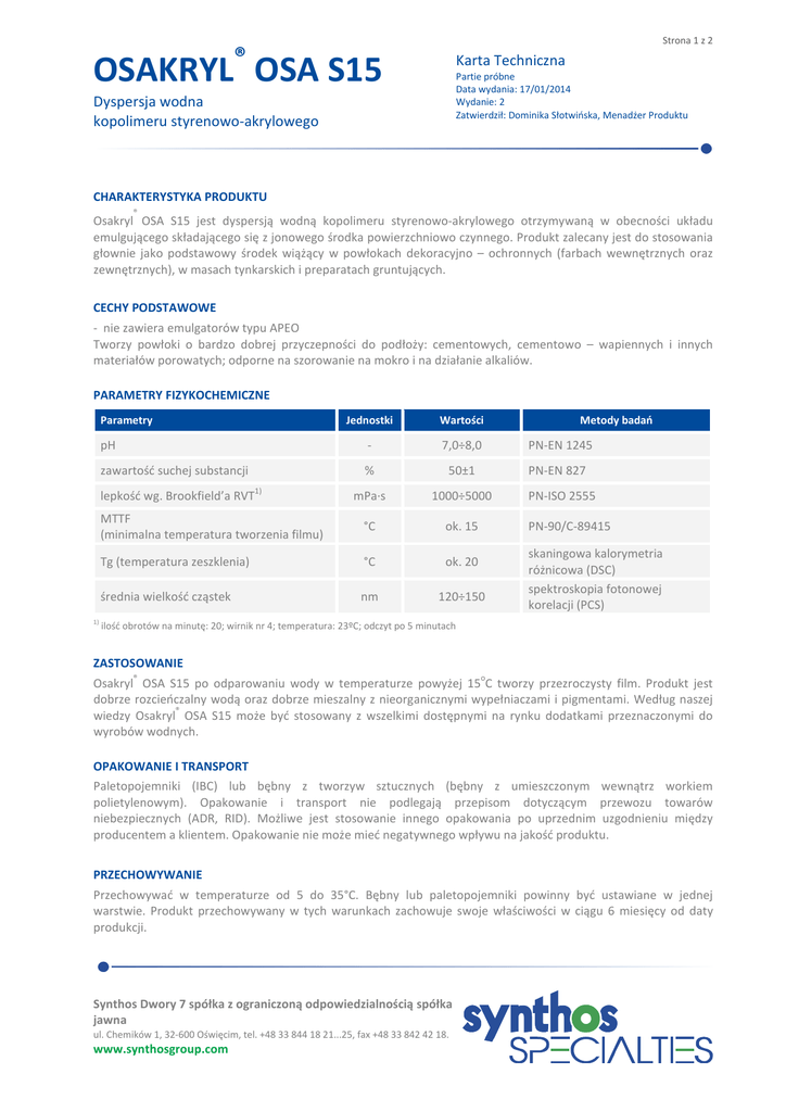 Strona 1 z 2 OSAKRYL® OSA S15 Karta Techniczna Partie próbne Data wydania: 17/01/2014 Wydanie: 2 Zatwierdził: Dominika Słotwińska, Menadżer Produktu Dyspersja wodna kopolimeru styrenowo-akrylowego CHARAKTERYSTYKA PRODUKTU ® Osakryl OSA S15 jest dyspersją wodną kopolimeru styrenowo-akrylowego otrzymywaną w obecności układu emulgującego składającego się z jonowego środka powierzchniowo czynnego. Produkt zalecany jest do stosowania głownie jako podstawowy środek wiążący w powłokach dekoracyjno – ochronnych (farbach wewnętrznych oraz zewnętrznych), w masach tynkarskich i preparatach gruntujących. CECHY PODSTAWOWE - nie zawiera emulgatorów typu APEO Tworzy powłoki o bardzo dobrej przyczepności do podłoży: cementowych, cementowo – wapiennych i innych materiałów porowatych; odporne na szorowanie na mokro i na działanie alkaliów. PARAMETRY FIZYKOCHEMICZNE Parametry Jednostki Wartości pH - 7,0÷8,0 PN-EN 1245 zawartość suchej substancji % 50±1 PN-EN 827 mPa∙s 1000÷5000 MTTF (minimalna temperatura tworzenia filmu) °C ok. 15 Tg (temperatura zeszklenia) °C ok. 20 średnia wielkość cząstek nm 120÷150 lepkość wg. Brookfield’a RVT 1) 1) Metody badań PN-ISO 2555 PN-90/C-89415 skaningowa kalorymetria różnicowa (DSC) spektroskopia fotonowej korelacji (PCS) ilość obrotów na minutę: 20; wirnik nr 4; temperatura: 23ºC; odczyt po 5 minutach ZASTOSOWANIE ® o Osakryl OSA S15 po odparowaniu wody w temperaturze powyżej 15 C tworzy przezroczysty film. Produkt jest dobrze rozcieńczalny wodą oraz dobrze mieszalny z nieorganicznymi wypełniaczami i pigmentami. Według naszej ® wiedzy Osakryl OSA S15 może być stosowany z wszelkimi dostępnymi na rynku dodatkami przeznaczonymi do wyrobów wodnych. OPAKOWANIE I TRANSPORT Paletopojemniki (IBC) lub bębny z tworzyw sztucznych (bębny z umieszczonym wewnątrz workiem polietylenowym). Opakowanie i transport nie podlegają przepisom dotyczącym przewozu towarów niebezpiecznych (ADR, RID). Możliwe jest stosowanie innego opakowania po uprzednim uzgodnieniu między producentem a klientem. Opakowanie nie może mieć negatywnego wpływu na jakość produktu. PRZECHOWYWANIE Przechowywać w temperaturze od 5 do 35°C. Bębny lub paletopojemniki powinny być ustawiane w jednej warstwie. Produkt przechowywany w tych warunkach zachowuje swoje właściwości w ciągu 6 miesięcy od daty produkcji. Synthos Dwory 7 spółka z ograniczoną odpowiedzialnością spółka jawna ul. Chemików 1, 32-600 Oświęcim, tel. +48 33 844 18 21...25, fax +48 33 842 42 18. www.synthosgroup.com Strona 2 z 2 Niniejszy dokument ma charakter informacyjny. Informacje w nim podane opierają się na aktualnym stanie naszej wiedzy i doświadczeniu. Nie stanowią one gwarancji właściwości produktu ani specyfikacji jakościowej i nie mogą być podstawą do reklamacji. Przedstawione informacje nie mogą mieć zastosowania dla mieszanin produktu z innymi substancjami. Produkt powinien być transportowany, magazynowany i stosowany zgodnie z obowiązującymi przepisami oraz dobrymi praktykami higieny pracy. Wykorzystanie podanych informacji, jak i stosowanie produktu, nie są kontrolowane przez producenta, a zatem określenie warunków bezpieczeństwa stosowania jest obowiązkiem użytkownika. Synthos Dwory 7 spółka z ograniczoną odpowiedzialnością spółka jawna ul. Chemików 1, 32-600 Oświęcim, tel. +48 33 844 18 21...25, fax +48 33 842 42 18. www.synthosgroup.com