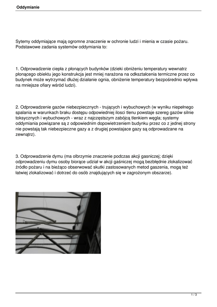 Oddymianie Sytemy oddymiające mają ogromne znaczenie w ochronie ludzi i mienia w czasie pożaru. Podstawowe zadania systemów oddymiania to: 1. Odprowadzenie ciepła z płonących budynków (dzieki obniżeniu temperatury wewnatrz płonącego obiektu jego konstrukcja jest mniej narażona na odkształcenia termiczne przez co budynek może wytrzymać dłużej działanie ognia, obniżenie temperatury bezpośrednio wpływa na mniejsze ofiary wśród ludzi). 2. Odprowadzenie gazów niebezpiecznych - trujących i wybuchowych (w wyniku niepełnego spalania w warunkach braku dostępu odpowiedniej ilosci tlenu powstaje szereg gazów silnie toksycznych i wybuchowych - wraz z najczęstszym zabójcą tlenkiem węgla; systemy oddymiania powiązane są z odpowiednim dopowietrzeniem budynku przez co z jednej strony nie powstają tak niebezpieczne gazy a z drugiej powstajace gazy są odprowadzane na zewnątrz). 3. Odprowadzenie dymu (ma olbrzymie znaczenie podczas akcji gasniczej; dzięki odprowadzeniu dymu osoby biorące udział w akcji gaśniczej mogą bezbłędnie zlokalizować źródło pożaru i na bieżąco obserwować skutki zastosowanych metod gaszenia, mogą też łatwiej zlokalizować i dotrzeć do osób znajdujących się w zagrożonym obszarze). 1/3 Oddymianie Sposoby odprowadzania dymu obiektów: 1. gazowej odblokowywaną odblokowania utrzymywana zapadki). ręcznie; mechanicznie w pozycji zadziałanie zamkniętej (klapa następuje uruchamiana za pomocą w momencie za pomocą stopienia i/lub linki termolutu stalowej mechanicznej zapadką lub węgla). 2. zasilanego wpływem wyzwalania instalacji SAP poprzez sterowane sprężonego temperatury sprężonym ręcznego; uruchomienie pneumatycznie powietrza; pęka następuje dwutlenkiem elektromagnesu szklany system wtedy (klapa bezpiecznik węgla przebicie może uruchamiana lub lub powietrzem; być pironaboju temperaturowy butli wysterowywany dwutlenku za pomocą uruchomienie przebijającego lub węgla elektrycznie siłownika po przyciśnięciu lub następuje butlę otwarcie pneumatycznego np. zlub dwutlenkiem zaworu przycisku systemu pod 3. Klapy sterowanego zinstalacje czujki elektrycznie izpołączeniem przycisku (klapa otwierana ROP lub za centrali pomocą SAP). siłownika elektrycznego 4. Okna oddymiające (stosuje się systemy podobne jak w przypadku klap oddymiających). 5. wentylatory odprowadzają Wentylatory oddymiające gazy oddymiające nadymowej zewnątrz; to oddymianie (cztery sterowanie poprzednie wymuszone; najczęściej punkty wentylatory totermolutu odbywa oddymianie się osprężyny dużej poprzez grawitacyjne wydajności centralę aozzgdy SAP). Istnieją elektryczno-pneumatycznym. także będące różnego typu sterowań, np. instalacje sterowaniu 2/3 Oddymianie Przeglądy systemów oddymiania: 1. szczególności linki, rygli,sterujących, próby mechaniczne stanu zadziałania. srężyn, -zsprawdzenie bezpiecznika wszystkich temperaturowego, elementów mocowania mechanicznych, rolek prowadzących wROP, 2. pneumatycznej, wyzwalaczy pneumatyczne ręcznych. wagi butli - dwutlenkiem węgla, rygli, stanu bezpieczników szczelności temperaturowych, instalacji 3. centralek Systemy elektryczne stanu - sprawdzenie zasilania awaryjnego, siłowników, czujek próby zadziałania. dymowych, przycisków zadziałania. 4. wentylatorów, Wentylatory pomiar oddymiające wydajności -sprawdzenie sprawdzenie wentylatorów, klapsiłowników, oddymiających, sprawdzenie/smarowanie pomiary elektryczne łożysk, próby silników 3/3