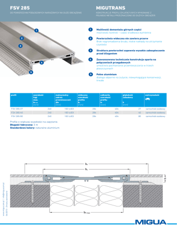 FSV 285 MIGUTRANS DO POWIERZCHNI PODŁOGOWYCH NARAŻONYCH NA DUŻE OBCIĄŻENIE KONSTRUKCJE PROFILI DYLATACYJNYCH WYKONANE Z PEŁNEGO METALU PRZEZNACZONE DO DUŻYCH OBCIĄŻEŃ Możliwość demontażu górnych części możliwość kontroli – część środkowa wymienna Powierzchnia widoczna nie zawiera przerw Brak nagromadzenia brudu, niskie nakłady na utrzymanie czystości Struktura powierzchni zapewnia wysokie zabezpieczenie przed ślizganiem Zaawansowana technicznie konstrukcja oparta na połączeniach przegubowych umożliwia pochłanianie przemieszczania w trzech płaszczyznach Pełne aluminium dlatego odporne na zużycie, niewymagające konserwacji, trwałe profil FSV 285/27 szerokość fugi max. bf max [mm] maksymalny zakres przemieszczeń ∆bf [mm] 240 widoczna szerokość profilu bs [mm] 100 (±50) całkowita szerokość profilu bt [mm] 284 głębokość zabudowy wytrzymałość h [mm] 404 27 samochód osobowy FSV 285/40 240 100 (±50) 284 404 40 samochód osobowy FSV 285/80 240 100 (±50) 284 404 80 samochód osobowy Profile o większej wysokości na zapytanie. Długość fabryczna: 3 m Standardowe kolory: naturalne aluminium b tt b 06/2015 – Zmiany zastrzeżone www.migua.com.pl | [email protected] hh bs b max bb ff max