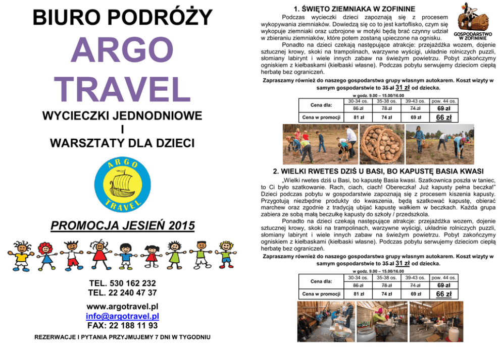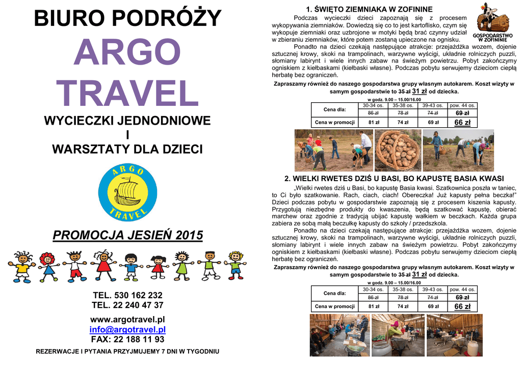 BIURO PODRÓŻY ARGO TRAVEL WYCIECZKI JEDNODNIOWE I WARSZTATY DLA DZIECI 1. ŚWIĘTO ZIEMNIAKA W ZOFININE Podczas wycieczki dzieci zapoznają się z procesem wykopywania ziemniaków. Dowiedzą się co to jest kartoflisko, czym się wykopuje ziemniaki oraz uzbrojone w motyki będą brać czynny udział w zbieraniu ziemniaków, które potem zostaną upieczone na ognisku. Ponadto na dzieci czekają następujące atrakcje: przejażdżka wozem, dojenie sztucznej krowy, skoki na trampolinach, warzywne wyścigi, układnie rolniczych puzzli, słomiany labirynt i wiele innych zabaw na świeżym powietrzu. Pobyt zakończymy ogniskiem z kiełbaskami (kiełbaski własne). Podczas pobytu serwujemy dzieciom ciepłą herbatę bez ograniczeń. Zapraszamy również do naszego gospodarstwa grupy własnym autokarem. Koszt wizyty w samym gospodarstwie to 35 zł 31 zł od dziecka. w godz. 9.00 – 15.00/16.00 Cena dla: 30-34 os. 86 zł 35-38 os. 78 zł 39-43 os. 74 zł pow. 44 os. Cena w promocji 81 zł 74 zł 69 zł 66 zł 69 zł 2. WIELKI RWETES DZIŚ U BASI, BO KAPUSTĘ BASIA KWASI PROMOCJA JESIEŃ 2015 „Wielki rwetes dziś u Basi, bo kapustę Basia kwasi. Szatkownica poszła w taniec, to Ci było szatkowanie. Rach, ciach, ciach! Obereczka! Już kapusty pełna beczka!” Dzieci podczas pobytu w gospodarstwie zapoznają się z procesem kiszenia kapusty. Przygotują niezbędne produkty do kwaszenia, będą szatkować kapustę, obierać marchew oraz zgodnie z tradycją ubijać kapustę wałkiem w beczkach. Każda grupa zabiera ze sobą małą beczułkę kapusty do szkoły / przedszkola. Ponadto na dzieci czekają następujące atrakcje: przejażdżka wozem, dojenie sztucznej krowy, skoki na trampolinach, warzywne wyścigi, układnie rolniczych puzzli, słomiany labirynt i wiele innych zabaw na świeżym powietrzu. Pobyt zakończymy ogniskiem z kiełbaskami (kiełbaski własne). Podczas pobytu serwujemy dzieciom ciepłą herbatę bez ograniczeń. Zapraszamy również do naszego gospodarstwa grupy własnym autokarem. Koszt wizyty w samym gospodarstwie to 35 zł 31 zł od dziecka. w godz. 9.00 – 15.00/16.00 TEL. 530 162 232 TEL. 22 240 47 37 www.argotravel.pl [email protected] FAX: 22 188 11 93 REZERWACJE I PYTANIA PRZYJMUJEMY 7 DNI W TYGODNIU Cena dla: Cena w promocji 30-34 os. 35-38 os. 39-43 os. pow. 44 os. 86 zł 78 zł 74 zł 69 zł 81 zł 74 zł 69 zł 66 zł 3. SAVOIR VIVRE NA WESOŁO – POLECANA NOWOŚĆ!!! 5. OD KAMIENIA DO CHLEBA – MAZOWIECKI GOŚCINIEC Co to jest savoir-vivre? Wiedza o tym, jak dobrze wychowany człowiek zachowuje się w różnych życiowych sytuacjach. Nasze warsztaty mają na celu w zabawny sposób przedstawić przyjęte normy poprawnego zachowania się przy stole i nie tylko. Dowiemy się co kryje się pod pojęciem SAVOIR VIVRE oraz będziemy potrafili zastosować w przyszłości zasady dobrego wychowania. Na wesoło zostanie omówiony protokół dyplomatyczny, dlaczego warto zadbać o swój wizerunek oraz jak dobrać strój na szczególne okazje. W czasie prelekcji dzieci utrwalą sobie poprawne ułożenie sztućców podczas posiłków, poprawne korzystanie z zastawy stołowej oraz gdzie należy usiąść przy stole. Na koniec wszyscy uczestnicy warsztatów zjedzą pyszny dwudaniowy obiad, podczas którego wykorzystamy zdobyte wiadomości. Do wyboru mamy bogate menu potraw (również wegetariańskich). Zapraszamy na wycieczkę do Mazowieckiego Gościńca gdzie dzieci zapoznają się z procesem pieczenia chleba. Dowiemy się na czym polega praca rolnika, młynarza i piekarza. Poznamy niezwykłą historię chleba i posłuchamy o wierzeniach ludowych związanych z jego wypiekiem. Nauczymy się rozróżniać zboża, pracy na żarnach, wyrobimy ciasto, uformujemy bochenki, które następnie umieścimy w piecu chlebowym. W oczekiwaniu na wypieki czekają na nas następujące atrakcje: ognisko z pieczeniem kiełbasek (kiełbaski własne), drewniany tor przeszkód, przejażdżka wozem po okolicy, skoki na trampolinie, wyścigi drewnianymi taczkami, wyścigi na grupowych nartach oraz wiele innych ciekawych atrakcji. . W trakcie pobytu wszystkim uczestnikom serwujemy ciepłą herbatę bez ograniczeń. Na terenie Mazowieckiego Gościńca jest sklepik w którym można kupić różne pamiątki związane z wycieczką. W razie niepogody program jest modyfikowany i dopasowany tak by zajęcia odbywały w zadaszonych miejscach. w godz. 9.00 – 14.00 Cena dla: Cena w promocji 30-34 os. 35-38 os. 39-43 os. pow. 44 os. 90 zł 81zł 75 zł 69 zł 83 zł 75 zł 69 zł 66 zł w godz. 9.00 – 15.00/16.00 Cena dla: 30-34 os. 88 zł 35-38 os. 78 zł 39-43 os. 72 zł pow. 44 os. Cena w promocji 83 zł 74 zł 68 zł 62 zł 4. FARMA ILUZJI Farma Iluzji to miejsce wypełnione atrakcjami, które sprawiają że aktywny wypoczynek nabiera nowego wymiaru. Znajdują się tu zarówno eksponaty ze świata iluzji, duże budowle, które zmieniają prawa grawitacji, jak i miejsca do zabawy i wypoczynku. Podczas pobytu na farmie czekają na nas następujące atrakcje: - zwiedzanie Muzeum Iluzji oraz Latającej Chaty Tajemnic, - zabawa przy lewitujących kuleczkach, zdjęcia przy głowie na talerzu, - szukanie rozwiązań zagadki Lewitującego Kranu i zabawa w poszukiwaczy przygód w Wiklinowym Labiryncie, - przygoda na Szlaku Trapera i zabawa na polu dmuchańców, - wrażenie lewitacji w Tunelu Zapomnienia oraz spacer przez Lasek Doświadczeń, - wizyta w mini-zoo, gdzie znajduje się unikatowa Zagroda Króliczków, posterunek kucyka Czarusia, wybieg dla mini-kózek oraz kraina żółwi, - wspólne ćwiczenia wraz z brzozowymi ludkami na Zielonej Ścieżce Zdrowia, - świat do góry nogami, czyli przygoda w Zakręconym Domku lub zagubienie się w Lustrzanym Labiryncie W trakcie wycieczki wizyta w leśniczówce – zobaczymy tu takie zwierzęta jak: jelenie, sarny, daniele oraz dziki. Zwierzęta bardzo lubią marchewki, zachęcamy by każdy uczestnik zabrał ze sobą kilka takich smakołyków. w godz. 8.00 / 9.0
