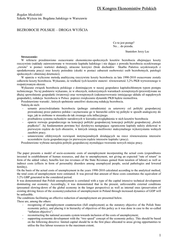 IX Kongres Ekonomistów Polskich Bogdan Miedziński Szkoła Wyższa im. Bogdana Jańskiego w Warszawie BEZROBOCIE POLSKIE – DROGA WYJŚCIA Co to jest postęp? No… do przodu. Stanisław Jerzy Lec Streszczenie: W referacie przedstawiono oszacowanie ekonomiczno-społecznych kosztów bezrobocia obejmujące koszty rzeczywiste (nakłady zainwestowane w tworzenie kapitału ludzkiego i nie dające z powodu bezrobocia oczekiwanego „zwrotu” w postaci wartości dodanej), utracone korzyści (brak dochodów Skarbu Państwa uzyskiwanych z opodatkowania pracy) oraz koszty pośrednie (skutki w postaci zaburzeń osobowości osób bezrobotnych, patologii społecznych i obniżonej dzietności). W oparciu o wyliczone metodą analityczną rzeczywiste koszty bezrobocia za lata 1990-2010 oszacowane zostały całkowite koszty bezrobocia. Wykazano, że wielkość tych kosztów stanowi równowartość 3,2% PKB wytworzonego w rozpatrywanym okresie. Wykazano związek bezrobocia polskiego z dominującym w naszej gospodarce kapitałochłonnym typem postępu technicznego. Na tej podstawie wykazano, że w obecnych, niekorzystnych warunkach zewnętrznych (przewidywane na dłużej spowolnienie gospodarki światowej) oraz wewnętrznych (zakonserwowanie istniejącego układu sił napędowych gospodarki), redukcja bezrobocia w Polsce poprzez zwiększanie dynamiki PKB będzie niemożliwa. Przedstawiono warunki , których spełnienie umożliwi skuteczną redukcję bezrobocia. Należą do nich: - uznanie przeciwdziałania bezrobociu (pełnego zatrudnienia) za ustawowy cel polityki gospodarczej prowadzonej przez państwo polskie i usytuowanie go w hierarchii celów tej polityki w sposób analogiczny do tego, jak to zrobiono w stosunku do tak zwanego celu inflacyjnego. - przebudowa systemu rachunków narodowych w kierunku uwzględnienia w nich kosztów bezrobocia - oparcie rozwoju gospodarczego na koncepcji polityki gospodarczej koncepcji polityki gospodarczej „dwóch prędkości”. Jej fundamentem powinna być dyrektywa następująca: ograniczone kapitały należy alokować w pierwszym rzędzie do tych obszarów, w których istnieją możliwości maksymalnego wykorzystania wolnych zasobów pracy. - ustanowienie efektywnych rozwiązań instytucjonalnych działających na rzecz równoważenia interesów uczestników życia gospodarczego (w pierwszym rzędzie interesów kapitału i pracy). Przedstawiono wybrane narzędzia polityki gospodarczej stymulujące tworzenie nowych miejsc pracy. The paper presents a model of socio-economic costs of unemployment incorporating the actual costs (expenditures invested in establishment of human resources, and due to unemployment, not giving an expected “rate of return” in form of the added value), benefits lost (no revenues of the State Revenues gained from taxation of labour) as well as indirect costs (effects in form of personality disorders among unemployed people, social pathologies and lowered fertility). On the basis of the actual costs of unemployment in the years 1990-2010 calculated according to the analytical method, the total costs of unemployment were estimated. It was proved that amount of these costs constitutes the equivalent of 3.2% GBP generated in the considered period. It was demonstrated that Polish unemployment is correlated with a type of the capital intensive technical development dominating our economy. Accordingly, it was demonstrated that in the present, unfavourable external conditions (presumed slowing-down of the global economy in the longer perspective) as well as internal ones (preservation of existing driving forces of the economy),reduction of unemployment in Poland through increased dynamics of GDP will be unfeasible. The conditions facilitating an effective reduction of unemployment are presented below. These are, among the others: - recognising of unemployment counteraction (full employment) as the statutory objective of the Polish State economic policy, and placing it in hierarchy of objectives of this policy as it was done in case to the so-called “inflation objective”; - reconstructing the national accounts system towards inclusion of the costs of unemployment; - supporting economic development with the “two speed” concept of the economic policy. This should be based on the following directive: limited capital should be in the first place allocated to areas giving opportunities to utilise the free labour resources to the maximum extent; 1 - establishing the effective institutional solutions for the benefit of sustainability of interests of participants of economic life (the capital and labour in the first instance). The paper presents the selected tools of economic policy stimulating creation of the new jobs. Słowa kluczowe: Bezrobocie, koszty bezrobocia, wzrost gospodarczy, praca, kapitał, kapitał ludzki, postęp techniczny, PKB. Unemployment, costs of unemployment, economic growth, labor, capital, human capital, technical progress, GDP. 1 Skala problemu Spośród licznych problemów, z którymi zmaga się dziś Polska, na czoło wysuwa się bezrobocie. Jego destrukcyjny wpływ na materialne i duchowe fundamenty egzystencji Polaków wynika nie tylko z rozmiarów tego zjawiska, ale także z jego uporczywości – już przez okres całego pokolenia borykamy się z bezrobociem kilkunastoprocentowym, przekraczającym niekiedy 20%. Ekonomiczno-społeczne koszty bezrobocia to nie tylko obniżony status materialny i społeczny osób pozbawionych pracy (ich rodzin) oraz zasiłki wypłacane na ich rzecz, ale także bezprzykładne marnotrawienie zainwestowanych w tworzenie kapitału ludzkiego nakładów, nie dających oczekiwanego „zwrotu” w postaci wartości dodanej, która jest wkładem każdego zatrudnionego w PKB. Do kosztów tych doliczyć należy koszty utraconych korzyści (dochody Skarbu Państwa z opodatkowania pracy), a także trudno wymierne, ale jakże dotkliwe skutki pośrednie bezrobocia w postaci zaburzeń osobowości os