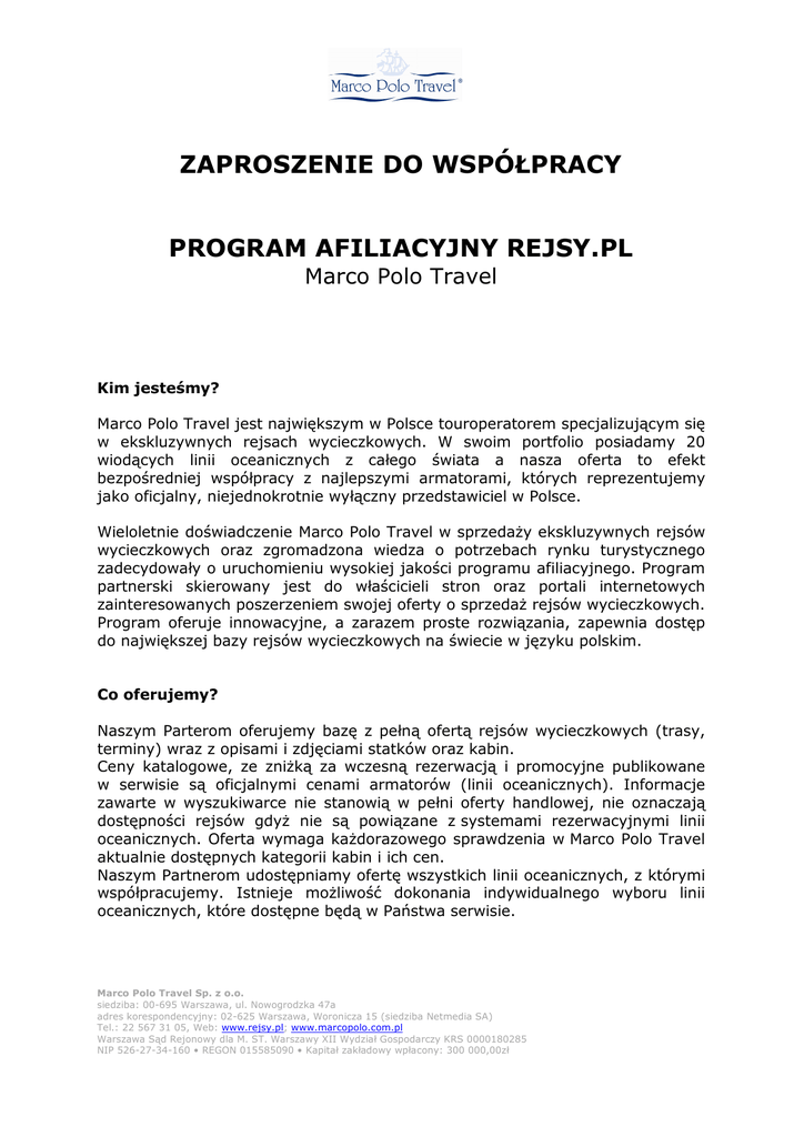 ZAPROSZENIE DO WSPÓŁPRACY PROGRAM AFILIACYJNY REJSY.PL Marco Polo Travel Kim jesteśmy? Marco Polo Travel jest największym w Polsce touroperatorem specjalizującym się w ekskluzywnych rejsach wycieczkowych. W swoim portfolio posiadamy 20 wiodących linii oceanicznych z całego świata a nasza oferta to efekt bezpośredniej współpracy z najlepszymi armatorami, których reprezentujemy jako oficjalny, niejednokrotnie wyłączny przedstawiciel w Polsce. Wieloletnie doświadczenie Marco Polo Travel w sprzedaży ekskluzywnych rejsów wycieczkowych oraz zgromadzona wiedza o potrzebach rynku turystycznego zadecydowały o uruchomieniu wysokiej jakości programu afiliacyjnego. Program partnerski skierowany jest do właścicieli stron oraz portali internetowych zainteresowanych poszerzeniem swojej oferty o sprzedaż rejsów wycieczkowych. Program oferuje innowacyjne, a zarazem proste rozwiązania, zapewnia dostęp do największej bazy rejsów wycieczkowych na świecie w języku polskim. Co oferujemy? Naszym Parterom oferujemy bazę z pełną ofertą rejsów wycieczkowych (trasy, terminy) wraz z opisami i zdjęciami statków oraz kabin. Ceny katalogowe, ze zniżką za wczesną rezerwacją i promocyjne publikowane w serwisie są oficjalnymi cenami armatorów (linii oceanicznych). Informacje zawarte w wyszukiwarce nie stanowią w pełni oferty handlowej, nie oznaczają dostępności rejsów gdyż nie są powiązane z systemami rezerwacyjnymi linii oceanicznych. Oferta wymaga każdorazowego sprawdzenia w Marco Polo Travel aktualnie dostępnych kategorii kabin i ich cen. Naszym Partnerom udostępniamy ofertę wszystkich linii oceanicznych, z którymi współpracujemy. Istnieje możliwość dokonania indywidualnego wyboru linii oceanicznych, które dostępne będą w Państwa serwisie. Marco Polo Travel Sp. z o.o. siedziba: 00-695 Warszawa, ul. Nowogrodzka 47a adres korespondencyjny: 02-625 Warszawa, Woronicza 15 (siedziba Netmedia SA) Tel.: 22 567 31 05, Web: www.rejsy.pl; www.marcopolo.com.pl Warszawa Sąd Rejonowy dla M. ST. Warszawy XII Wydział Gospodarczy KRS 0000180285 NIP 526-27-34-160 • REGON 015585090 • Kapitał zakładowy wpłacony: 300 000,00zł Zasady współpracy Implementacja oraz użytkowanie systemu WhiteLabel jest bezpłatne. Zasady współpracy określone są szczegółowo w załączonej umowie agencyjnej (dla biur podróży) oraz afiliacyjnej (dla portali internetowych). Na czym polega afiliacja? Na umieszczeniu w Państwa witrynie linku do wyszukiwarki rejsów lub samej wyszukiwarki serwisu whitelabel.rejsy.pl Naszym Parterom proponujemy następujące rozwiązania: 1. System WhiteLabel dla biur podróży Proponujemy go naszym Agentom, którzy sami obsługują rezerwację. Partner otrzymuje do skonfigurowania wyszukiwarkę (whitelabel.rejsy.pl), którą umieszcza w swojej subdomenie lub ramce. Integracja ta jest bardzo prosta we wdrożeniu, umożliwia personalizacje niektórych elementów takich jak kolory wyszukiwarki, stopka, nagłówek, dane teleadresowe. Na stronie nie pojawia się logo Marco Polo. W pasku adresu zostaje jedynie adres strony Agenta. Zapytanie wysłane przez Klienta spływa bezpośrednio do Agenta. Wysłanie zapytania nie jest równoznaczne z założeniem rezerwacji. Agent obsługuje zapytanie tak jak podczas tradycyjnej sprzedaży i otrzymuje standardową prowizję. 2. System WhiteLabel dla właścicieli portali internetowych Proponujemy go właścicielom głównie turystycznych portali internetowych (ale nie tylko), którzy nie będą obsługiwać rezerwacji. Partner otrzymuje do skonfigurowania wyszukiwarkę (whitelabel.rejsy.pl) którą umieszcza w swojej subdomenie lub ramce. Integracja ta jest bardzo prosta we wdrożeniu, umożliwia personalizacje niektórych elementów takich jak kolory wyszukiwarki, stopka, nagłówek, dane teleadresowe. Informacja o Marco Polo pojawia się podczas etapu wysyłania zapytania o rejs. W pasku adresu pojawia się adres whitelabel.rejsy.pl. Zapytanie wysłane przez Klienta spływa bezpośrednio do Marco Polo. Marco Polo obsługuje rezerwację, dla Partnera jest to program bezobsługowy. Partner otrzymuje prowizję od sprzedaży, jest ona niższa niż w wariancie 1. Prowizja wypłacana jest raz w miesiącu, w ciągu 7 dniu od otrzymania faktury prowizyjnej. Marco Polo Travel Sp. z o.o. siedziba: 00-695 Warszawa, ul. Nowogrodzka 47a adres korespondencyjny: 02-625 Warszawa, Woronicza 15 (siedziba Netmedia SA) Tel.: 22 567 31 05, Web: www.rejsy.pl; www.marcopolo.com.pl Warszawa Sąd Rejonowy dla M. ST. Warszawy XII Wydział Gospodarczy KRS 0000180285 NIP 526-27-34-160 • REGON 015585090 • Kapitał zakładowy wpłacony: 300 000,00zł Jak zostać Partnerem? 1. Rejestracja na stronie www.rejsy.pl -> menu „Współpraca” 2. Kontakt ze strony Marco Polo Travel w celu ustalenia typu afiliacji, linii oceanicznych, których ma dotyczyć. 3. Przygotowanie i przesłanie umowy (ew. aneksu do obowiązującej Umowy Agencyjnej) 4. Po podpisaniu umowy: o zatwierdzenie Państwa loginu w systemie CSRO o przekazanie instrukcji wdrożenia systemu afiliacyjnego o pomoc we wdrażaniu Systemu na Państwa witrynę Jak monitorować efekty afiliacji (prowizję) Specjalnie przygotowany w CSRO moduł „raporty sprzedaży” z zapytaniami dokonanymi przez Państwa serwis, pozwoli osobie z Państwa firmy, posiadającej login i hasło, na bieżąco monitorować wyniki sprzedaży. System prowizji Prowizja naliczana jest od ceny sprzedanego rejsu, nie jest liczona od opłat portowych, zapytań, które nie zakończyły się sprzedażą lub rejsów anulowanych. Rozliczenie prowizji następuje po rozpoczęciu rejsu, raz w miesiącu, na podstawie faktury prowizyjnej. Stawki prowizyjne znajdują się w podpisanym aneksie prowizyjnym. W przypadku jakichkolwiek pytań lub wątpliwości proszę o kontakt bezpośredni. Pozdrawiam, Agnieszka Kłopocińska Project Manager Marco Polo Travel Sp. z o.o. Tel.: 22 567 31 05 e-mail: [email protected] Marco Polo T