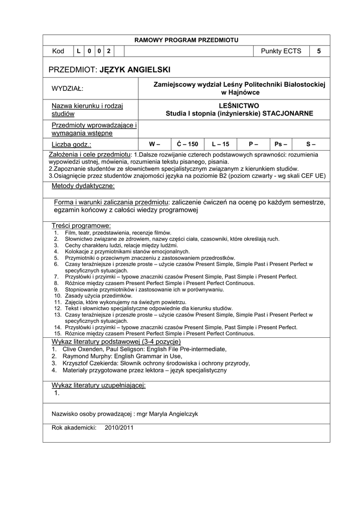 RAMOWY PROGRAM PRZEDMIOTU Kod L 0 0 5 Punkty ECTS 2 PRZEDMIOT: JĘZYK ANGIELSKI Zamiejscowy wydział Leśny Politechniki Białostockiej w Hajnówce WYDZIAŁ: LEŚNICTWO Studia I stopnia (inżynierskie) STACJONARNE Nazwa kierunku i rodzaj studiów Przedmioty wprowadzające i wymagania wstępne Liczba godz.: W– Ć – 150 L – 15 P– Ps – S– Założenia i cele przedmiotu: 1.Dalsze rozwijanie czterech podstawowych sprawności: rozumienia wypowiedzi ustnej, mówienia, rozumienia tekstu pisanego, pisania. 2.Zapoznanie studentów ze słownictwem specjalistycznym związanym z kierunkiem studiów. 3.Osiągnięcie przez studentów znajomości języka na poziomie B2 (poziom czwarty - wg skali CEF UE) Metody dydaktyczne: Forma i warunki zaliczania przedmiotu: zaliczenie ćwiczeń na ocenę po każdym semestrze, egzamin końcowy z całości wiedzy programowej Treści programowe: 1. 2. 3. 4. 5. 6. 7. 8. 9. 10. 11. 12. 13. 14. 15. Film, teatr, przedstawienia, recenzje filmów. Słownictwo związane ze zdrowiem, nazwy części ciała, czasowniki, które określają ruch. Cechy charakteru ludzi, relacje między ludźmi. Kolokacje z przymiotnikami stanów emocjonalnych. Przymiotniki o przeciwnym znaczeniu z zastosowaniem przedrostków. Czasy teraźniejsze i przeszłe proste – użycie czasów Present Simple, Simple Past i Present Perfect w specyficznych sytuacjach. Przysłówki i przyimki – typowe znaczniki czasów Present Simple, Past Simple i Present Perfect. Różnice między czasem Present Perfect Simple i Present Perfect Continuous. Stopniowanie przymiotników i zastosowanie ich w porównywaniu. Zasady użycia przedimków. Zajęcia, które wykonujemy na świeżym powietrzu. Tekst i słownictwo specjalistyczne odpowiednie dla kierunku studiów. Czasy teraźniejsze i przeszłe proste – użycie czasów Present Simple, Simple Past i Present Perfect w specyficznych sytuacjach. Przysłówki i przyimki – typowe znaczniki czasów Present Simple, Past Simple i Present Perfect. Róznice między czasem Present Perfect Simple i Present Perfect Continuous. 16. Współczesne sposoby komunikacji – sms, email,... Wykaz literatury podstawowej (3-4 pozycje) 1. 2. 3. 4. Clive Oxenden, Paul Seligson: English File Pre-intermediate, Raymond Murphy: English Grammar in Use, Krzysztof Czekierda: Słownik ochrony środowiska i ochrony przyrody, Materiały przygotowane przez lektora – język specjalistyczny Wykaz literatury uzupełniającej: 1. Nazwisko osoby prowadzącej : mgr Maryla Angielczyk Rok akademicki: 2010/2011 SZCZEGÓŁOWY PROGRAM PRZEDMIOTU Kod L 0 0 Punkty ECTS 2 1 PRZEDMIOT: JĘZYK ANGIELSKI 4 Nazwa jednostki prowadzącej kierunek: Zamiejscowy Wydział Leśny Politechniki Białostockiej w Hajnówce LEŚNICTWO Studia I stopnia (inżynierskie) stacjonarne Nazwa kierunku i rodzaj studiów Liczba godz.: W– Ć – 30 L– P– Ps – S– Ćwiczenia: Semestr IV Tematyka i słownictwo: 1. Życie w epoce żelaza. 2. Naukowe odkrycia przyszłości. 3. Energia elektryczna w naszym życiu. 4. Wynalezienie pasty do zębów, spadochronu, chipsów. 5. Relacje między ludźmi. 6. Ślub. 7. Członkowie rodziny. 8. Kolokacje. 9. Tekst i słownictwo specjalistyczne odpowiednie dla kierunku studiów. Ćwiczenia w pisaniu: 1. List motywacyjny. 2. Wypracowanie przedstawiające naszą opinię na jakiś temat. Gramatyka: 1. Zdania względne z who, which, whose... 2. Zdania warunkowe. 3. Rzeczownik odsłowny (gerund) lub bezokolicznik (infinitive) używany po określonych czasownikach. 4. Przyrostki i końcówki przymiotników. 5. Konstrukcja I wish. Forma i warunki zaliczania: 1.Ocena prac pisemnych. 2. Sprawdziany pisemne w ciągu każdego semestru. 3. Ocena dłuższych wypowiedzi / prezentacji przygotowanych przez studentów. Wykaz literatury podstawowej (3-4 pozycje) 1. Clive Oxenden, Paul Seligson: English File Pre-intermediate, 2. Raymond Murphy: English Grammar in Use, 3. Krzysztof Czekierda: Słownik ochrony środowiska i ochrony przyrody, 4. Materiały przygotowane przez lektora – język specjalistyczny Wykaz literatury uzupełniającej: Nazwisko osoby prowadzącej : mgr Maryla Angielczyk Rok akademicki 2010/2011