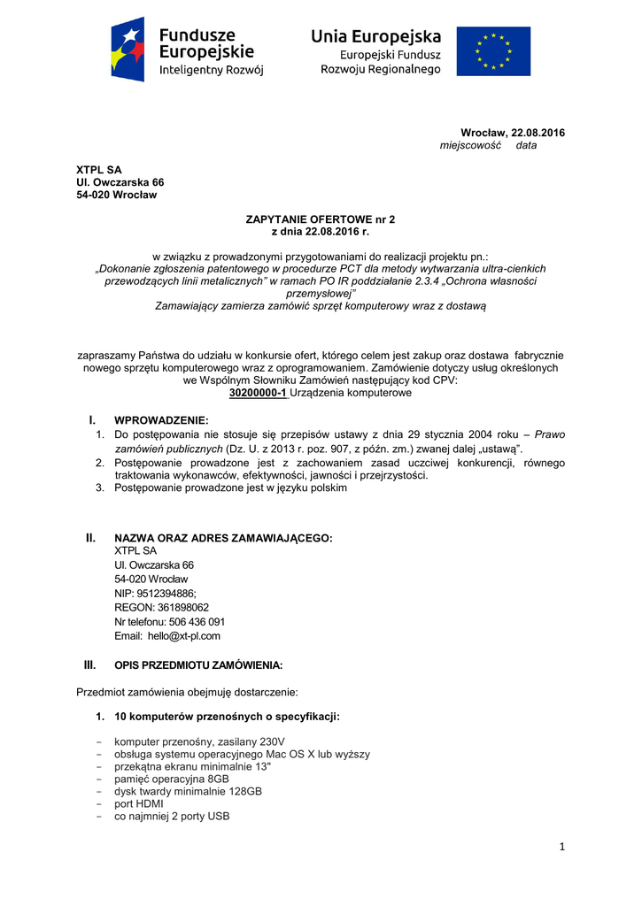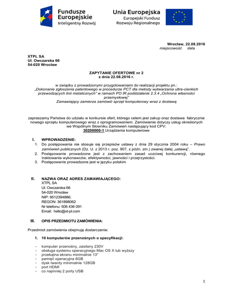 Wrocław, 22.08.2016 miejscowość data XTPL SA Ul. Owczarska 66 54-020 Wrocław ZAPYTANIE OFERTOWE nr 2 z dnia 22.08.2016 r. w związku z prowadzonymi przygotowaniami do realizacji projektu pn.: „Dokonanie zgłoszenia patentowego w procedurze PCT dla metody wytwarzania ultra-cienkich przewodzących linii metalicznych” w ramach PO IR poddziałanie 2.3.4 „Ochrona własności przemysłowej” Zamawiający zamierza zamówić sprzęt komputerowy wraz z dostawą zapraszamy Państwa do udziału w konkursie ofert, którego celem jest zakup oraz dostawa fabrycznie nowego sprzętu komputerowego wraz z oprogramowaniem. Zamówienie dotyczy usług określonych we Wspólnym Słowniku Zamówień następujący kod CPV: 30200000-1 Urządzenia komputerowe I. WPROWADZENIE: 1. Do postępowania nie stosuje się przepisów ustawy z dnia 29 stycznia 2004 roku – Prawo zamówień publicznych (Dz. U. z 2013 r. poz. 907, z późn. zm.) zwanej dalej „ustawą”. 2. Postępowanie prowadzone jest z zachowaniem zasad uczciwej konkurencji, równego traktowania wykonawców, efektywności, jawności i przejrzystości. 3. Postępowanie prowadzone jest w języku polskim II. NAZWA ORAZ ADRES ZAMAWIAJĄCEGO: XTPL SA Ul. Owczarska 66 54-020 Wrocław NIP: 9512394886; REGON: 361898062 Nr telefonu: 506 436 091 Email: [email protected] III. OPIS PRZEDMIOTU ZAMÓWIENIA: Przedmiot zamówienia obejmuję dostarczenie: 1. 10 komputerów przenośnych o specyfikacji: - komputer przenośny, zasilany 230V obsługa systemu operacyjnego Mac OS X lub wyższy przekątna ekranu minimalnie 13" pamięć operacyjna 8GB dysk twardy minimalnie 128GB port HDMI co najmniej 2 porty USB 1 2. 1 komputer stacjonarny o specyfikacji: - komputer stacjonarny, zasilany 230V obsługa systemu operacyjnego Mac OS X lub wyższy przekątna ekranu minimalnie 21,5" pamięć operacyjna 8GB dysk twardy 1TB IV. TERMIN WYKONANIA ZAMÓWIENIA: Realizacja zamówienia ma odbyć się jednorazowo, całościowo do dnia 1.09.2016r V. WARUNKI UDZIAŁU W POSTĘPOWANIU: 1) O udzielenie zamówienia może ubiegać się Oferent spełniający następujące warunki: a. oferent zrealizuję zamówienie całościowo 2) Z postępowania o udzielenie zamówienia wykluczeniu podlega również Oferent, który: - Jest podmiotem powiązanym z Zamawiającym osobowo lub kapitałowo. Przez powiązania kapitałowe lub osobowe rozumie się wzajemne powiązania między Zamawiającym lub osobami upoważnionymi do zaciągania zobowiązań w imieniu Zamawiającego lub osobami wykonującymi w imieniu Zamawiającego czynności związane z przygotowaniem i przeprowadzeniem procedury wyboru Wykonawcy a Wykonawcą, polegające w szczególności na: a) uczestniczeniu w spółce jako wspólnik spółki cywilnej lub spółki osobowej, b) posiadaniu co najmniej 10 % udziałów lub akcji, c) pełnieniu funkcji członka organu nadzorczego lub zarządzającego, prokurenta, pełnomocnika, d) pozostawaniu w takim stosunku prawnym lub faktycznym, który może budzić uzasadnione wątpliwości, co do bezstronności w wyborze wykonawcy, w szczególności pozostawaniu w związku małżeńskim, w stosunku pokrewieństwa lub powinowactwa w linii prostej, pokrewieństwa drugiego stopnia lub powinowactwa drugiego stopnia w linii bocznej lub w stosunku przysposobienia, opieki lub kurateli; Powyższy warunek weryfikowany będzie na podstawie Oświadczenia Oferenta. 3) W toku badania i oceny ofert Zamawiający może żądać od Oferentów wyjaśnień dotyczących treści złożonych ofert. 4) Oferent poniesie wszelkie koszty związane z przygotowaniem i złożeniem oferty. 5) Okres związania ofertą wynosi 30 dni od daty złożenia oferty. 6) Oferent może złożyć tylko jedną ofertę. 7) Rozliczenia między Zamawiającymi, a wybranym Oferentem będą prowadzone w złotych polskich (PLN). WSKAZANIE OSÓB UPRAWNIONYCH DO POROZUMIEWANIA SIĘ Z OFERENTAMI: Do porozumiewania się z Oferentami w sprawach związanych z postępowaniem upoważniona jest Klaudia Zelek Tel.: 506436091 e-mail: [email protected] VI. VII. MIEJSCE I TERMIN SKŁADANIA OFERTY: 2 Ofertę należy przesłać w formie podpisanego skanu wraz z niezbędnymi załącznikami na następujący adres poczty elektronicznej: [email protected] lub dostarczyć w oryginale w zamkniętej kopercie do siedziby Zamawiającego. W obu przypadkach decyduje data wpływu oferty. Termin składania ofert wynosi 7 dni kalendarzowych licząc od dnia następnego po dniu upublicznienia zapytania ofertowego i kończy się 30.08.2016 r. o godzinie 15:00 Otwarcie ofert odbędzie się w dniu 30.08.2016r. o godzinie 16:00 w siedzibie Zamawiającego VIII. OPIS SPOSOBU PRZYGOTOWANIA OFERTY: 1. Oferta powinna zostać przygotowana w języku polskim. 2. Oferta winna być sporządzona w jednym egzemplarzu. 3. Oferta winna być zgodna ze szczegółowym opisem przedmiotu zamówienia oraz zawierać: a) cenę netto i brutto realizacji usługi. 4. Oferta winna być podpisana przez osobę upoważnioną do reprezentowania Oferenta. 5. Oferta powinna zawierać dane teleadresowe Oferenta pozwalające na jednoznaczną identyfikację Oferenta 6. Oferta winna być podpisana przez osobę upoważnioną do reprezentowania Oferenta, zgodnie z formą reprezentacji określoną w krajowym rejestrze sądowym lub innym dokumencie, właściwym dla danej formy organizacyjnej Oferenta albo przez osobę umocowaną przez osobę uprawnioną, przy czym pełnomocnictwo musi być załączone do oferty. 5. Do oferty należy dołączyć: - pełnomocnictwo do działania w imieniu Oferenta, o ile prawo do reprezentowania Oferenta w powyższym zakresie nie wynika wprost z dokumentu rejestrowego; - Oświadczenie dotyczące spełnienia warunków udziału w postępowaniu. - Oświadczenie o braku powiązań z Zamawiającym. IX. OPIS KRYTERIÓW, KTÓRYMI ZAMAWIAJĄCY BĘDZIE SIĘ KIEROWAŁ PRZY WYBORZE OFERTY WRAZ Z PODANIEM ZNACZENIA TYCH KRYTERIÓW Przy wyborze najkorzystniejszej oferty wzięta pod uwagę zostanie cena. Spośr
