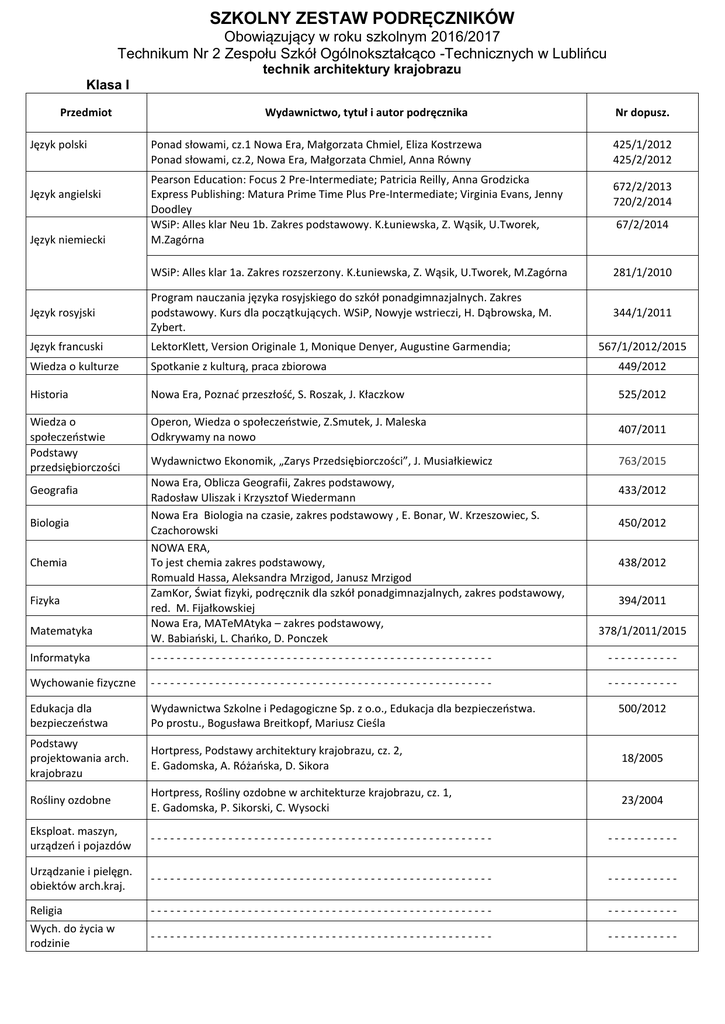SZKOLNY ZESTAW PODRĘCZNIKÓW Obowiązujący w roku szkolnym 2016/2017 Technikum Nr 2 Zespołu Szkół Ogólnokształcąco -Technicznych w Lublińcu technik architektury krajobrazu Klasa I Przedmiot Język polski Język angielski Język niemiecki Wydawnictwo, tytuł i autor podręcznika Ponad słowami, cz.1 Nowa Era, Małgorzata Chmiel, Eliza Kostrzewa Ponad słowami, cz.2, Nowa Era, Małgorzata Chmiel, Anna Równy Pearson Education: Focus 2 Pre-Intermediate; Patricia Reilly, Anna Grodzicka Express Publishing: Matura Prime Time Plus Pre-Intermediate; Virginia Evans, Jenny Doodley WSiP: Alles klar Neu 1b. Zakres podstawowy. K.Łuniewska, Z. Wąsik, U.Tworek, M.Zagórna Nr dopusz. 425/1/2012 425/2/2012 672/2/2013 720/2/2014 67/2/2014 WSiP: Alles klar 1a. Zakres rozszerzony. K.Łuniewska, Z. Wąsik, U.Tworek, M.Zagórna 281/1/2010 Język rosyjski Program nauczania języka rosyjskiego do szkół ponadgimnazjalnych. Zakres podstawowy. Kurs dla początkujących. WSiP, Nowyje wstrieczi, H. Dąbrowska, M. Zybert. 344/1/2011 Język francuski LektorKlett, Version Originale 1, Monique Denyer, Augustine Garmendia; Wiedza o kulturze Spotkanie z kulturą, praca zbiorowa 449/2012 Historia Nowa Era, Poznać przeszłość, S. Roszak, J. Kłaczkow 525/2012 Wiedza o społeczeństwie Podstawy przedsiębiorczości Operon, Wiedza o społeczeństwie, Z.Smutek, J. Maleska Odkrywamy na nowo 407/2011 Wydawnictwo Ekonomik, „Zarys Przedsiębiorczości”, J. Musiałkiewicz 763/2015 Geografia Biologia Chemia Fizyka Matematyka Nowa Era, Oblicza Geografii, Zakres podstawowy, Radosław Uliszak i Krzysztof Wiedermann Nowa Era Biologia na czasie, zakres podstawowy , E. Bonar, W. Krzeszowiec, S. Czachorowski NOWA ERA, To jest chemia zakres podstawowy, Romuald Hassa, Aleksandra Mrzigod, Janusz Mrzigod ZamKor, Świat fizyki, podręcznik dla szkół ponadgimnazjalnych, zakres podstawowy, red. M. Fijałkowskiej Nowa Era, MATeMAtyka – zakres podstawowy, W. Babiański, L. Chańko, D. Ponczek 567/1/2012/2015 433/2012 450/2012 438/2012 394/2011 378/1/2011/2015 Informatyka ----------------------------------------------------- ----------- Wychowanie fizyczne ----------------------------------------------------- ----------- Edukacja dla bezpieczeństwa Wydawnictwa Szkolne i Pedagogiczne Sp. z o.o., Edukacja dla bezpieczeństwa. Po prostu., Bogusława Breitkopf, Mariusz Cieśla Podstawy projektowania arch. krajobrazu Hortpress, Podstawy architektury krajobrazu, cz. 2, E. Gadomska, A. Różańska, D. Sikora 18/2005 Rośliny ozdobne Hortpress, Rośliny ozdobne w architekturze krajobrazu, cz. 1, E. Gadomska, P. Sikorski, C. Wysocki 23/2004 Eksploat. maszyn, urządzeń i pojazdów ----------------------------------------------------- ----------- Urządzanie i pielęgn. obiektów arch.kraj. ----------------------------------------------------- ----------- ----------------------------------------------------- ----------- ----------------------------------------------------- ----------- Religia Wych. do życia w rodzinie 500/2012 SZKOLNY ZESTAW PODRĘCZNIKÓW Obowiązujący w roku szkolnym 2016/2017 Technikum Nr 2 Zespołu Szkół Ogólnokształcąco -Technicznych w Lublińcu technik architektury krajobrazu Klasa II Przedmiot Język polski Język angielski Język niemiecki Historia Matematyka Wydawnictwo, tytuł i autor podręcznika Nowa Era, Ponad słowami, cz.1, kl.2, Małgorzata Chmiel, Anna Równy Express Publishing; Matura Prime Time Pre-Intermediate, Virginia Evans, Jenny Doodley Macmillan, Matura 2015 repetytorium (pp I pr), M. Rosińska, Lynda Edwards Pearson Education: Focus 2 Pre-Intermediate; Patricia Reilly, Anna Grodzicka WSiP: Alles klar Neu 2a. Zakres podstawowy. K.Łuniewska, Z. Wąsik, U.Tworek, M.Zagórna WSiP: Alles klar 1b. Zakres rozszerzony. K.Łuniewska, Z. Wąsik, U.Tworek, M.Zagórna Nowa Era, Poznać przeszłość, S. Roszak, J. Kłaczkow Nowa Era, MATeMAtyka – zakres podstawowy, W. Babiański, L. Chańko, D. Ponczek Nr dopusz. 425/3/2013 720/2/2014 710/2014 672/2/2013 679/3/2014 281/2/2010 525/2012 378/1/2011/2015 378/2/2013 biologia Nowa Era Biologia na czasie, zakres rozszerzony , M. Guzik, E. Jastrzębska, Rośliny ozdobne ----------------------------------------------------- ----------- ----------------------------------------------------- ----------- ----------------------------------------------------- ----------- ----------------------------------------------------- ----------- Eksploat. maszyn, urządzeń i pojazdów Urządzanie i pielęgn. obiektów arch.kraj. Projekty obiektów architektury krajobrazu Prace w obiektach architektury krajobrazu Religia Wych. do życia w rodzinie Hortpress, Urządzanie i pielegnacja terenów zieleni, cz. 3, E. Gadomska, K. Gadomski, B. Fortuna - Antoszkiewicz 564/1/2012 11/2007 ----------------------------------------------------- ----------- ----------------------------------------------------- ----------- SZKOLNY ZESTAW PODRĘCZNIKÓW Obowiązujący w roku szkolnym 2016/2017 Technikum Nr 2 Zespołu Szkół Ogólnokształcąco -Technicznych w Lublińcu technik architektury krajobrazu Klasa III Przedmiot Język polski Wydawnictwo, tytuł i autor podręcznika Nowa Era, Ponad słowami, cz.2, kl.2, Małgorzata Chmiel, E. Mirkowska-Treugut Nr dopusz. 425/4/2013 Język angielski Język niemiecki WSiP: Alles klar 2a, 2b. Zakres podstawowy. K.Łuniewska, Z. Wąsik, U.Tworek, M.Zagórna WSiP: Alles klar 2a, 2b. Zakres rozszerzony. K.Łuniewska, Z. Wąsik, U.Tworek, M.Zagórna 679/2014 281/2/2010 Matematyka Nowa Era, MATeMAtyka – zakres podstawowy, W. Babiański, L. Chańko, D. Ponczek 378/2/2013 378/3/2014 Historia i społeczenstwo Nowa Era, Ojczysty Panteon i ojczyste spory 659/1/2013 Biologia Nowa Era, Biologia na czasie, zakres rozszerzony. F. Dubert, R. Kozik, S. Krawczyk 659/1/2013