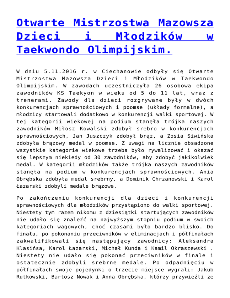Otwarte Mistrzostwa Mazowsza Dzieci i Młodzików w Taekwondo Olimpijskim. W dniu 5.11.2016 r. w Ciechanowie odbyły się Otwarte Mistrzostwa Mazowsza Dzieci i Młodzików w Taekwondo Olimpijskim. W zawodach uczestniczyła 26 osobowa ekipa zawodników KS Taekyon w wieku od 5 do 11 lat, wraz z trenerami. Zawody dla dzieci rozgrywane były w dwóch konkurencjach sprawnościowych i poomse (układy formalne), a młodzicy startowali dodatkowo w konkurencji walki sportowej. W tej kategorii wiekowej na podium stanęła trójka naszych zawodników Miłosz Kowalski zdobył srebro w konkurencjach sprawnościowych, Jan Juszczyk zdobył brąz, a Zosia Siwińska zdobyła brązowy medal w poomse. Z uwagi na licznie obsadzone wszystkie kategorie wiekowe trzeba było rywalizować i okazać się lepszym niekiedy od 30 zawodników, aby zdobyć jakikolwiek medal. W kategorii młodzików także trójka naszych zawodników stanęła na podium w konkurencjach sprawnościowych. Ania Obrębska zdobyła medal srebrny, a Dominik Chrzanowski i Karol Łazarski zdobyli medale brązowe. Po zakończeniu konkurencji dla dzieci i konkurencji sprawnościowych dla młodzików przystąpiono do walki sportowej. Niestety tym razem nikomu z dziesiątki startujących zawodników nie udało się znaleźć na najwyższym stopniu podium w swoich kategoriach wagowych, choć czasami było bardzo blisko. Do finału, po pokonaniu przeciwników w eliminacjach i półfinałach zakwalifikowali się następujący zawodnicy: Aleksandra Klasińsa, Karol Łazarski, Michał Kunda i Kamil Okraszewski . Niestety nie udało się pokonać przeciwników w finale i ostatecznie zdobyli srebrne medale. Po odpadnięciu w półfinałach swoje pojedynki o trzecie miejsce wygrali: Jakub Rutkowski, Bartosz Nowak i Anna Obrębska, którzy przywieźli ze sobą medale brązowe. Bardzo blisko medalu był Patryk Stachowicz, który pojedynek o brązowy medal przegrał w dodatkowej rundzie „złotym punktem”. Mistrzostwa Mazowsza kończyły istny maraton jaki nasi zawodnicy mieli do przebycia, jeżeli chodzi o starty w zawodach sportowych na przełomie października i listopada, szczególnie w kategorii młodzików. Dziesiątka naszych młodzikach począwszy od 23 października, od Warszawskiej Olimpiadzie Młodzieży, poprzez Międzywojewódzkie Mistrzostwa Młodzików, aż do Mistrzostw Mazowsza, co tydzień walczyła w turniejach rangi mistrzowskiej w kraju lub w województwie. Przez te 3 tygodnie nasi zawodnicy zdobyli 6 złotych, 7 srebrnych i 7 brązowych medali. Najlepszy dorobek medalowy zdobyła Aleksandra Klasińska, która zdobyła dwa medale złote i jeden srebrny. Bardzo cieszy powtarzalność w zdobywaniu medali przez konkretnych zawodników, co świadczy o nieprzypadkowości i pewnym poziomie sportowym. Aleksandra Klasińska, Ania Obrębska, Bartek Nowak, Kamil Okraszewski przywozili medale z każdej ww imprezy.