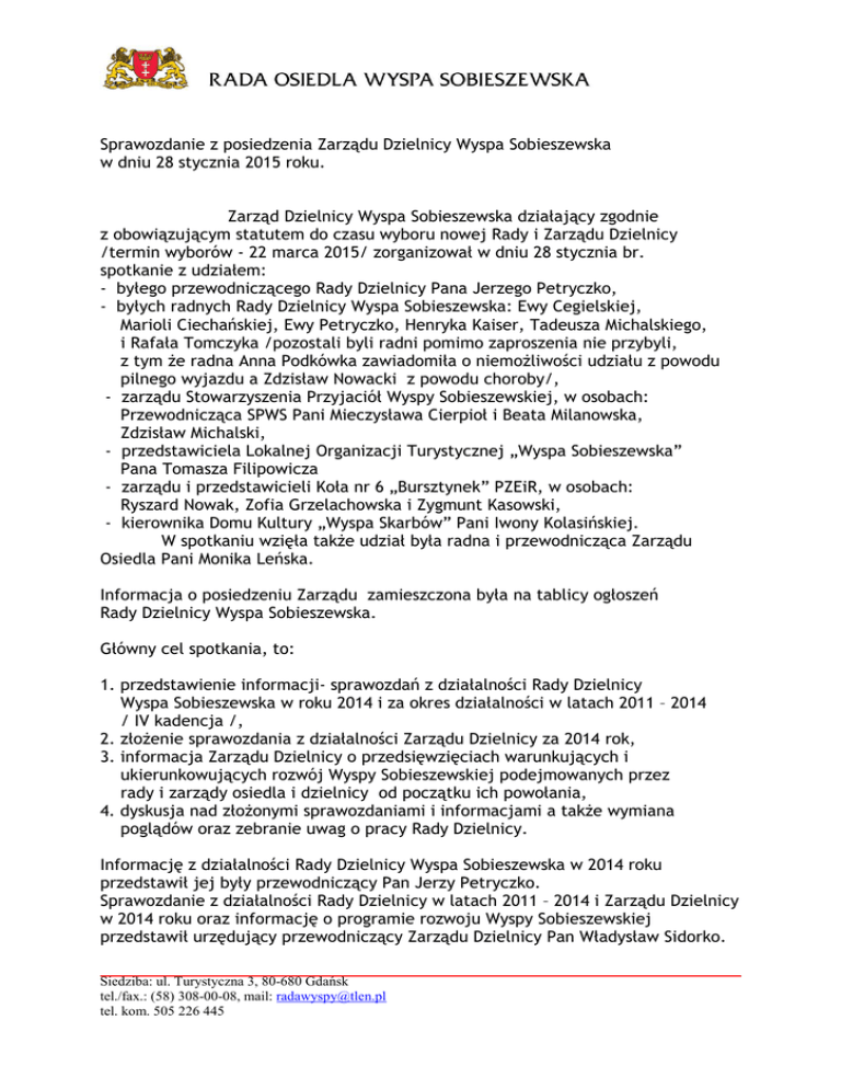 Sprawozdanie z posiedzenia Zarządu Dzielnicy Wyspa Sobieszewska w dniu 28 stycznia 2015 roku. Zarząd Dzielnicy Wyspa Sobieszewska działający zgodnie z obowiązującym statutem do czasu wyboru nowej Rady i Zarządu Dzielnicy /termin wyborów - 22 marca 2015/ zorganizował w dniu 28 stycznia br. spotkanie z udziałem: - byłego przewodniczącego Rady Dzielnicy Pana Jerzego Petryczko, - byłych radnych Rady Dzielnicy Wyspa Sobieszewska: Ewy Cegielskiej, Marioli Ciechańskiej, Ewy Petryczko, Henryka Kaiser, Tadeusza Michalskiego, i Rafała Tomczyka /pozostali byli radni pomimo zaproszenia nie przybyli, z tym że radna Anna Podkówka zawiadomiła o niemożliwości udziału z powodu pilnego wyjazdu a Zdzisław Nowacki z powodu choroby/, - zarządu Stowarzyszenia Przyjaciół Wyspy Sobieszewskiej, w osobach: Przewodnicząca SPWS Pani Mieczysława Cierpioł i Beata Milanowska, Zdzisław Michalski, - przedstawiciela Lokalnej Organizacji Turystycznej „Wyspa Sobieszewska” Pana Tomasza Filipowicza - zarządu i przedstawicieli Koła nr 6 „Bursztynek” PZEiR, w osobach: Ryszard Nowak, Zofia Grzelachowska i Zygmunt Kasowski, - kierownika Domu Kultury „Wyspa Skarbów” Pani Iwony Kolasińskiej. W spotkaniu wzięła także udział była radna i przewodnicząca Zarządu Osiedla Pani Monika Leńska. Informacja o posiedzeniu Zarządu zamieszczona była na tablicy ogłoszeń Rady Dzielnicy Wyspa Sobieszewska. Główny cel spotkania, to: 1. przedstawienie informacji- sprawozdań z działalności Rady Dzielnicy Wyspa Sobieszewska w roku 2014 i za okres działalności w latach 2011 – 2014 / IV kadencja /, 2. złożenie sprawozdania z działalności Zarządu Dzielnicy za 2014 rok, 3. informacja Zarządu Dzielnicy o przedsięwzięciach warunkujących i ukierunkowujących rozwój Wyspy Sobieszewskiej podejmowanych przez rady i zarządy osiedla i dzielnicy od początku ich powołania, 4. dyskusja nad złożonymi sprawozdaniami i informacjami a także wymiana poglądów oraz zebranie uwag o pracy Rady Dzielnicy. Informację z działalności Rady Dzielnicy Wyspa Sobieszewska w 2014 roku przedstawił jej były przewodniczący Pan Jerzy Petryczko. Sprawozdanie z działalności Rady Dzielnicy w latach 2011 – 2014 i Zarządu Dzielnicy w 2014 roku oraz informację o programie rozwoju Wyspy Sobieszewskiej przedstawił urzędujący przewodniczący Zarządu Dzielnicy Pan Władysław Sidorko. Siedziba: ul. Turystyczna 3, 80-680 Gdańsk tel./fax.: (58) 308-00-08, mail: [email protected] tel. kom. 505 226 445 -2– Zarząd Dzielnicy zobowiązał się do zamieszczenia wszystkich informacji i sprawozdań na stronie internetowej Rady. Po prezentacji odbyła się dyskusja, w której udział wzięli praktycznie wszyscy uczestnicy spotkania. Prezes SPWS Pani Mieczysława Cierpioł oraz kierownik Domu Kultury „Wyspa Skarbów” Pani Iwona Kolasińska zabierając głos w dyskusji przedstawiły pokrótce Informacje z działalności i planach pracy reprezentowanych organizacji i instytucji. Do zawartości merytorycznej sprawozdań i informacji w tym informacji o planach działania rad dzielnicy uczestnicy spotkania uwag nie wnieśli. Zgłoszono natomiast zastrzeżenia do organizacji pracy Rady Dzielnicy i małego zaangażowania wielu radnych. W tej kwestii najwięcej zastrzeżeń miała Pani Monika Leńska oraz reprezentujący Koło Emerytów i Rencistów Nr 6 „Bursztynek” Pan Ryszard Nowak. Zastrzeżenia częściowo podtrzymały prezes SPWS i kierowniczka GAK „Wyspa Skarbów”. Z kolei przedstawiciel LOT „Wyspa Sobieszewska” zaapelował o więcej jednomyślności w działaniach przedstawicieli poszczególnych organizacji i ukierunkowanie działań na załatwianie rzeczywistych problemów Wyspy. Zwrócił także uwagę na potrzebę częstszych kontaktów z mieszkańcami. W dyskusji głos zabrał także reprezentujący Stowarzyszenie Przyjaciół Wyspy Sobieszewskiej, nie mieszkający na Wyspie lecz, jak podkreślił, jej wielki miłośnik od kilkudziesięciu lat, Pan Zdzisław Michalski. Zwrócił uwagę na konieczność rozwiązywania problemów poprzez wypracowywanie wspólnych stanowisk na spotkaniach, w dyskusji publicznej i dialogu stron prezentujących w tej samej sprawie inne stanowiska i emocje. Zastrzeżenia dotyczyły: 1. nie organizowania przez Radę Dzielnicy organizacji spotkań z mieszkańcami - kontakty poprzez dyżury i informacje na stronie internetowej uznano jako nie wystarczające, 2. zbyt skromnego działania komisji stałych Rady, 3. małego zaangażowania lub zupełnej bierności części radnych. Uczestnicy spotkania dużo uwagi poświęcili planom zamknięcia dla ruchu turystycznego kamiennej grobli w Górkach Wschodnich. Przyjęto wspólne stanowisko co do dalszych działań zmierzających do zmiany decyzji władz administracyjnych Gdańska i woj. pomorskiego w tej sprawie. Wszystkie uwagi, zastrzeżenia i wnioski z spotkania Zarząd Dzielnicy przekaże Radzie i Zarządowi Dzielnicy nowej kadencji. Władysław Sidorko Przewodniczący Zarządu