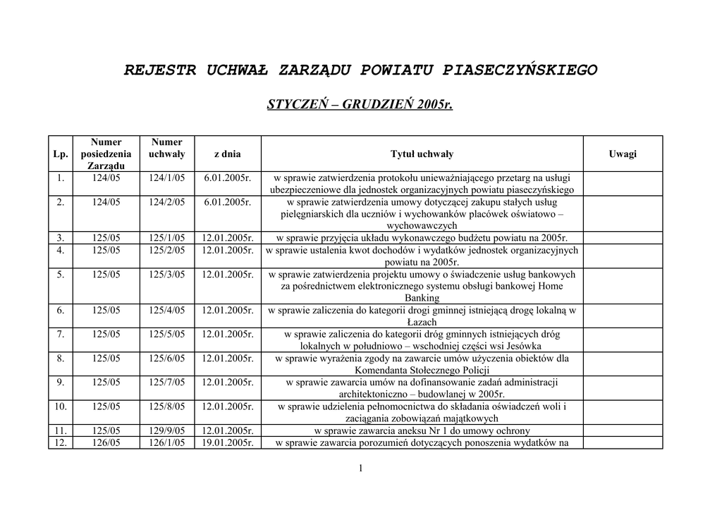 REJESTR UCHWAŁ ZARZĄDU POWIATU PIASECZYŃSKIEGO STYCZEŃ – GRUDZIEŃ 2005r. Numer uchwały z dnia Tytuł uchwały 1. Numer posiedzenia Zarządu 124/05 124/1/05 6.01.2005r. 2. 124/05 124/2/05 6.01.2005r. 3. 4. 125/05 125/05 125/1/05 125/2/05 12.01.2005r. 12.01.2005r. 5. 125/05 125/3/05 12.01.2005r. 6. 125/05 125/4/05 12.01.2005r. 7. 125/05 125/5/05 12.01.2005r. 8. 125/05 125/6/05 12.01.2005r. 9. 125/05 125/7/05 12.01.2005r. 10. 125/05 125/8/05 12.01.2005r. 11. 12. 125/05 126/05 129/9/05 126/1/05 12.01.2005r. 19.01.2005r. w sprawie zatwierdzenia protokołu unieważniającego przetarg na usługi ubezpieczeniowe dla jednostek organizacyjnych powiatu piaseczyńskiego w sprawie zatwierdzenia umowy dotyczącej zakupu stałych usług pielęgniarskich dla uczniów i wychowanków placówek oświatowo – wychowawczych w sprawie przyjęcia układu wykonawczego budżetu powiatu na 2005r. w sprawie ustalenia kwot dochodów i wydatków jednostek organizacyjnych powiatu na 2005r. w sprawie zatwierdzenia projektu umowy o świadczenie usług bankowych za pośrednictwem elektronicznego systemu obsługi bankowej Home Banking w sprawie zaliczenia do kategorii drogi gminnej istniejącą drogę lokalną w Łazach w sprawie zaliczenia do kategorii dróg gminnych istniejących dróg lokalnych w południowo – wschodniej części wsi Jesówka w sprawie wyrażenia zgody na zawarcie umów użyczenia obiektów dla Komendanta Stołecznego Policji w sprawie zawarcia umów na dofinansowanie zadań administracji architektoniczno – budowlanej w 2005r. w sprawie udzielenia pełnomocnictwa do składania oświadczeń woli i zaciągania zobowiązań majątkowych w sprawie zawarcia aneksu Nr 1 do umowy ochrony w sprawie zawarcia porozumień dotyczących ponoszenia wydatków na Lp. 1 Uwagi 13. 126/05 126/2/05 19.01.2005r. 14. 126/05 126/3/05 19.01.2005r. 15. 126/05 126/4/05 19.01.2005r. 16. 17. 126/05 126/05 126/5/05 126/6/05 19.01.2005r. 19.01.2005r. 18. 127/05 127/1/05 26.01.2005r. 19. 127/05 127/2/05 26.01.2005r. 20. 127/05 127/3/05 26.01.2005r. 21. 127/05 127/4/05 26.01.2005r. 22. 128/05 128/1/05 2.02.2005r. 23. 128/05 128/2/05 2.02.2005r. 24. 128/05 128/3/05 2.02.2005r. 25. 129/05 129/1/05 8.02.2005r. utrzymanie dziecka w placówce opiekuńczo – wychowawczej w sprawie zaliczenia do kategorii dróg gminnych istniejących i projektowanych dróg lokalnych w części wsi Głosków, Runów i Robercin w sprawie zaliczenia do kategorii dróg gminnych istniejące drogi lokalne w części wsi Siedliska w sprawie udzielenia pomocy finansowej na pokrycie kosztów działalności Piaseczyńskiej Powiatowej Komisji Urbanistyczno – Architektonicznej w sprawie przyjęcia darowizny w sprawie wszczęcia postępowania o zamówienie publiczne na usługi ubezpieczeniowe jednostek organizacyjnych powiatu piaseczyńskiego w sprawie powołania Dyrektora Samodzielnego Zespołu Publicznych Zakładów Opieki Zdrowotnej w Piasecznie w sprawie upoważnienia do składania oświadczeń woli w sprawach przekraczających bieżącą działalność Domu Pomocy Społecznej w Górze Kalwarii w sprawie wyrażenia zgody na zawarcie aneksu nr 1 do porozumienia z dnia 5.09.2003r. w sprawie użyczenia pomieszczeń internatu Zespołu Szkół Rolnicze Centrum Kształcenia Ustawicznego w Piasecznie na potrzeby Poradni Psychologiczno – Pedagogicznej w sprawie powołania komisji do oceny oferty na przebudowę strony internetowej powiatu w sprawie przedłużenia powierzenia stanowiska dyrektora Poradni Psychologiczno – Pedagogicznej w Piasecznie przy ul.Chyliczkowskiej 20 w sprawie wszczęcia postępowania o zamówienie publiczne na dobudowę hali warsztatów w Zespole Szkół Nr 1 w Piasecznie – II etap w sprawie podpisania umowy na dofinansowanie projektu nr Z/2.14/II/2.2/632/04 „Program stypendialny dla uczniów szkół ponadgimnazjalnych Powiatu Piaseczyńskiego na rok szkolny 2004/2005” oraz projektu nr Z/2.14/II/2.2/631/04 „Program stypendialny dla studentów z terenu Powiatu Piaseczyńskiego na rok akademicki 2004/2005” w sprawie upoważnienia osoby do reprezentowania Powiatu Piaseczyńskiego na Walnym Zgromadzeniu Członków Stowarzyszenia 2 26. 129/05 129/2/05 8.02.2005r. 27. 130/05 130/1/05 11.02.2005r. 28. 130/05 130/2/05 11.02.2005r. 29 30. 130/05 130/05 130/3/05 130/4/05 11.02.2005r. 11.02.2005r. 31. 130/05 130/5/05 11.02.2005r. 32. 130/05 130/6/05 11.02.2005r. 33. 130/05 130/7/05 11.02.2005r. 34. 130/05 130/8/05 11.02.2005r. 35. 131/05 131/1/05 23.02.2005r. 36. 131/05 131/2/05 23.02.2005r. 37. 131/05 131/3/05 23.02.2005r. 38. 131/05 131/4/05 23.02.2005r. Gmin i Powiatów Zlewni Rzeki Jeziorki w sprawie upoważnienia osoby do oddania głosu na Walnym Zgromadzeniu Członków Stowarzyszenia Gmin i Powiatów Zlewni Rzeki Jeziorki w sprawie wprowadzenia zmian w planie dochodów i wydatków budżetu powiatu na 2005r. w sprawie wprowadzenia zmian wysokości planowanych kwot wydatków jednostek organizacyjnych powiatu na 2005r. w sprawie przyjęcia darowizny w sprawie wyrażenia zgody na zawarcie porozumienia o przekazaniu środków finansowych na rekompensaty pieniężne na czas służb ponadnormatywnych w sprawie wszczęcia postępowania o zamówienie publiczne oraz zatwierdzenie specyfikacji na dostosowanie samochodu Mercedes Sprinter do wymagań ambulansu przewozowego w sprawie akceptacji treści aneksu do umowy nr 60/04 WPR z dnia 20 grudnia 2004r. na „Wykonanie termomodernizacji polegającej na wymianie okien w budynku hali remontowej kolejki wąskotorowej w Piasecznie” w sprawie wyrażenia zgody na zawarcie aneksu nr 2 do umowy najmu pomieszczeń byłego internatu w budynku Zespołu Szkół im.Wł.St.Reymonta w Konstancinie – Jeziornie przy ul.Mirkowskiej 39 w sprawie wyrażenia zgody na poddzierżawienie ośrodka sportowo – rekreacyjnego w Zalesiu Górnym w sprawie przyznania dotacji Zgromadzeniu Sióstr Franciszkanek Rodziny Maryi w Warszawie ul.Hoża 53 na prowadzenie Domu Pomocy Społecznej w Robercinie, ul.Gościniec 