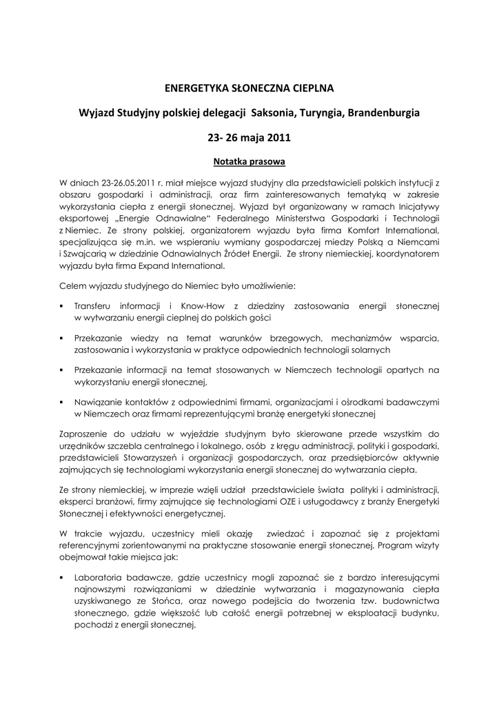 ENERGETYKA SŁONECZNA CIEPLNA Wyjazd Studyjny polskiej delegacji Saksonia, Turyngia, Brandenburgia 23‐ 26 maja 2011 Notatka prasowa W dniach 23-26.05.2011 r. miał miejsce wyjazd studyjny dla przedstawicieli polskich instytucji z obszaru gospodarki i administracji, oraz firm zainteresowanych tematyką w zakresie wykorzystania ciepła z energii słonecznej. Wyjazd był organizowany w ramach Inicjatywy eksportowej „Energie Odnawialne“ Federalnego Ministerstwa Gospodarki i Technologii z Niemiec. Ze strony polskiej, organizatorem wyjazdu była firma Komfort International, specjalizująca się m.in. we wspieraniu wymiany gospodarczej miedzy Polską a Niemcami i Szwajcarią w dziedzinie Odnawialnych Źródeł Energii. Ze strony niemieckiej, koordynatorem wyjazdu była firma Expand International. Celem wyjazdu studyjnego do Niemiec było umożliwienie: Transferu informacji i Know-How z dziedziny w wytwarzaniu energii cieplnej do polskich gości zastosowania energii słonecznej Przekazanie wiedzy na temat warunków brzegowych, mechanizmów zastosowania i wykorzystania w praktyce odpowiednich technologii solarnych Przekazanie informacji na temat stosowanych w Niemczech technologii opartych na wykorzystaniu energii słonecznej, Nawiązanie kontaktów z odpowiednimi firmami, organizacjami i ośrodkami badawczymi w Niemczech oraz firmami reprezentującymi branżę energetyki słonecznej wsparcia, Zaproszenie do udziału w wyjeździe studyjnym było skierowane przede wszystkim do urzędników szczebla centralnego i lokalnego, osób z kręgu administracji, polityki i gospodarki, przedstawicieli Stowarzyszeń i organizacji gospodarczych, oraz przedsiębiorców aktywnie zajmujących się technologiami wykorzystania energii słonecznej do wytwarzania ciepła. Ze strony niemieckiej, w imprezie wzięli udział przedstawiciele świata polityki i administracji, eksperci branżowi, firmy zajmujące się technologiami OZE i usługodawcy z branży Energetyki Słonecznej i efektywności energetycznej. W trakcie wyjazdu, uczestnicy mieli okazję zwiedzać i zapoznać się z projektami referencyjnymi zorientowanymi na praktyczne stosowanie energii słonecznej. Program wizyty obejmował takie miejsca jak: Laboratoria badawcze, gdzie uczestnicy mogli zapoznać sie z bardzo interesującymi najnowszymi rozwiązaniami w dziedzinie wytwarzania i magazynowania ciepła uzyskiwanego ze Słońca, oraz nowego podejścia do tworzenia tzw. budownictwa słonecznego, gdzie większość lub całość energii potrzebnej w eksploatacji budynku, pochodzi z energii słonecznej. Obiekty referencyjne z praktycznymi przykładami zastosowań instalacji wykorzystujących promieniowanie słoneczne do wytwarzania ciepła Firmy produkujące elementy składowe instalacji solarnych Pozyskiwanie ciepła z promieni słonecznych jest jednym z najbardziej obiecujących zastosowań z zakresu Odnawialnych Źródeł Energii. W tym zakresie Niemcy zajmują wiodącą rolę. Republika Federalna Niemiec zajmuje trzecie miejsce w Europie pod względem wykorzystanej mocy energii słonecznej na cele wytwarzania ciepła na głowę mieszkańca. Naszych zachodnich sąsiadów wyprzedzają pod tym względem jedynie Austria i Grecja. Pod koniec 2009 roku, całkowita moc zainstalowana instalacji słonecznych do wytwarzania ciepła wyniosła w Niemczech 9 GWth. Dzięki temu, Niemcy pokazały się jako absolutnie największy potencjalnie rynek dla tego typu zastosowań w Europie. Dzięki lokalnym firmom i instytutom z branży grzewczej, daje sie zauważyć coraz większy rozwój obszaru instalacji związanych z technologia wykorzystania energii słonecznej. Przez to rozwój takich technologii, charakteryzuje się dobrą ekonomią i przez to konkurencyjnością. Ten proces jest wspierany przez stworzone wsparcia politycznego w postaci Warunków ramowych, których przykładem jest Program Pobudzania Rynku (Marktanreizprogramm (MAP) ) oraz ustawa dot. ciepła z energii odnawialnych (Erneuerbare-Energien-WärmeGesetz (EEWärmeG)). Dla polskiej delegacji, region środkowych i wschodnich Niemiec był naturalnym celem tego typu wyjazdu studyjnego, z uwagi na bliskie sąsiedztwo i podobne warunki nasłonecznienia co w Polsce. Ponadto, na terenie trzech sąsiadujących z Polską landów niemieckich znajdują się znaczące na skalę światową ośrodki produkcji i badań kolektorów słonecznych. Reprezentowany tam potencjał, dzięki licznym wytwórcom, firmom usługowym i ośrodkom badawczym jest w stanie pokryć cały obieg zwiany z wytwarzaniem urządzeń dla energetyki słonecznej – od produkcji krzemu do recyclingu. Dlatego ten obszar jest nazywany SolarValley Mitteldeutschland. Uczestnicy wyjazdu , znaleźli tam optymalne warunki i możliwości do wyczerpujących informacji i nawiązania kontaktów w interesującej ich dziedzinie. uzyskania Jednym z punktów programu wyjazdu buło Forum Ekspertów, które zostało zorganizowane na terenie Saksońskiej Izby Przemysłowo-Handlowej w Dreźnie. Podczas spotkania wygłoszone zostały referaty które pociągnęły za sobą bardzo interesujące dyskusje. Referowano m.in. takie zagadnienia jak: - Sytuacja rynkowa niemieckiej branży energetyki słonecznej z ukierunkowaniem na ciepło - Energetyka Słoneczna Cieplna – projekty Saksońskiej Agencji Energetycznej - Energetyka słoneczna cieplna w Polsce – Prawne warunki ramowe, Obecny rozwój i perspektywy, Instrumenty wsparcia - Cluster energetyki odnawialnej w Saksonii – EESA Ponadto miały miejsce prezentacje firm pokazujących tzw. „Best practice” - Praktyczne przykłady firm i ośrodków w Niemczech które odniosły sukces w zakresie energetyki słonecznej cieplnej, gdzie omawiane były m.in. takie rozwiązania jak: - Projektowanie i wykonywanie alternatywnych systemów grzewczych, Pozyskiwanie energii - Badanie, rozwój oraz produkcja kolektorów o wysokiej mocy - Budowa zbiorników, urządzeń i kształtek z tworzywa wzmacnianego włóknem szklanym – r