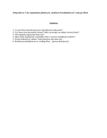 Załącznik nr 3 do regulaminu plebiscytu „Kobieta Przedsiębiorcza” (edycja 2014) Ankieta 1. Co jest Pani dotychczasowym największym sukcesem? 2. Czy łatwo jest prowadzić biznes? Jakie są recepty na udany rozwój firmy? 3. Jak najlepiej regeneruje Pani siły? 4. Jaką zaletę najchętniej widziałaby Pani u swoich współpracowników? 5. Proszę dokończyć zdanie: Najważniejsze dla mnie jest… 6. Kobieta przedsiębiorcza to, według Pani... (proszę dokończyć)