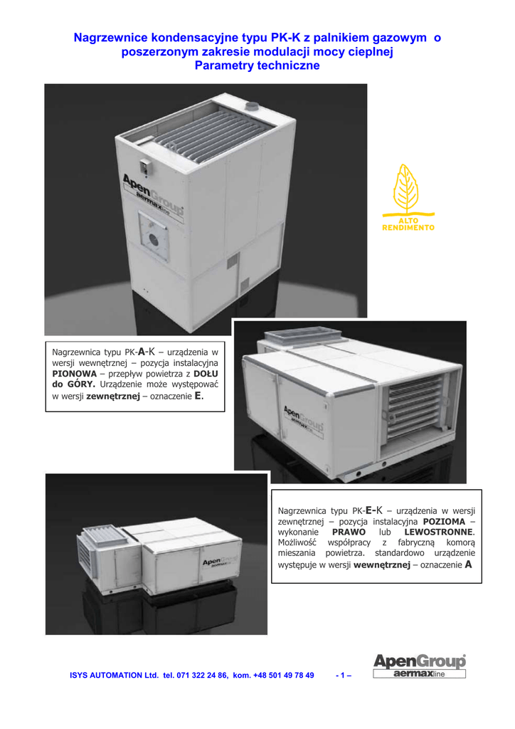 Nagrzewnice kondensacyjne typu PK-K z palnikiem gazowym o poszerzonym zakresie modulacji mocy cieplnej Parametry techniczne Nagrzewnica typu PK-A-K – urządzenia w wersji wewnętrznej – pozycja instalacyjna PIONOWA – przepływ powietrza z DOŁU do GÓRY. Urządzenie może występować w wersji zewnętrznej – oznaczenie E. Nagrzewnica typu PK-E-K – urządzenia w wersji zewnętrznej – pozycja instalacyjna POZIOMA – wykonanie PRAWO lub LEWOSTRONNE. Możliwość współpracy z fabryczną komorą mieszania powietrza. standardowo urządzenie występuje w wersji wewnętrznej – oznaczenie A ISYS AUTOMATION Ltd. tel. 071 322 24 86, kom. +48 501 49 78 49 -1– Nagrzewnice kondensacyjne typu PK-K z palnikiem gazowym o poszerzonym zakresie modulacji mocy cieplnej Parametry techniczne Sekcja Grzewcza Nagrzewnicy Powietrza - Komora Spalania i Wymiennik Ciepła: Komora spalania wykonana ze stali szlachetnej AISI 430, ze zwiększoną powierzchnią wymiany ciepła. Jej kształt oraz sposób aranżacji przepływu powietrza kierowanego na wymiennik ciepła zapewnia prawidłowy rozpływ powietrza z optymalnym odbiorem ciepła z jej gorących powierzchni. Komora spalania i wymiennik ciepła w wersji pionowej Przepływ spalin w układzie trzy-ciągowym, w połączeniu z wymiennikiem ciepła typu spalinypowietrze. Sam wymiennik wykonany ze stali szlachetnej AISI 304, wyposażony w zespół przepłaszczonych płomieniówek. Ich kształt (patent nr MI94U00269), ukierunkowanie oraz aerodynamiczne wyprofilowanie zapewnia optymalny odbiór ciepła przez przepływające przez sekcję wymiennika powietrze. Płomieniówki wymiennika zespolone są z kolektorami spalin spawaniem - metoda TIG. Przedni panel inspekcyjny oraz cztery panele tylne wymiennika ciepła, wykonane są ze stali AISI 430. Kondensat wykraplający się w wymienniku ciepła odprowadzany jest na zewnątrz. Komora spalania i wymiennik ciepła w wersji poziomej Izolacja paneli inspekcyjnych oraz izolacja płyty montażowej palnika wykonana jest z wełny mineralnej. Na wyposażeniu urządzenia znajduje się wziernik obserwacji płomienia palnika oraz króciec pomiaru ciśnienia w komorze spalania. ISYS AUTOMATION Ltd. tel. 071 322 24 86, kom. +48 501 49 78 49 -2– Nagrzewnice kondensacyjne typu PK-K z palnikiem gazowym o poszerzonym zakresie modulacji mocy cieplnej Parametry techniczne Komora spalania i wymiennik ciepła osadzone wewnątrz ram nośnych, wykonanych z aluminium. Ścianami konstrukcji są płyty typu „sandwich” z izolacją termiczną z wełny mineralnej o grubości 25 mm (32 kg/m³), z kompletem uszczelek. Zewnętrzna strona płyty wykonana z blachy galwanizowanej z 1 mm uplastycznioną powłoką. Strona wewnętrzna to blacha jak wyżej o grubości 0,6 mm. Wlot powietrza zabezpieczony siatką ze stali galwanizowanej o grubości 1,5 mm. Palnik – typu PREMIX z kompozytową głowicą firmy BEKAERT, zapewnia płynne sterowanie mocą ciepłą ze współczynnikiem modulacji 10 : 1. Palnik jest urządzeniem zintegrowanym z komorą spalania. Wykonanie – strona obsługowa: Standardowe wykonanie urządzeń w wersji poziomej, to wykonanie PRAWOSTRONNE (wlot powietrza ze strony lewej – wyrzut ze strony PRAWEJ patrząc na urządzenie od strony palnika). Konieczność wykonania LEWOSTRONNEGO wymaga wyszczególnienia w zamówieniu i nie pociąga za sobą jakichkolwiek dopłat finansowych. Wszystkie urządzenia mają na wyposażeniu uchwyty transportowe, umożliwiające łatwe przenoszenie urządzeniami dźwignicowymi lub podnośnikami. Na wyposażeniu urządzeń w wersji instalacyjnej POZIOMEJ, znajdują się również podstawy montażowe. ISYS AUTOMATION Ltd. tel. 071 322 24 86, kom. +48 501 49 78 49 -3– Nagrzewnice kondensacyjne typu PK-K z palnikiem gazowym o poszerzonym zakresie modulacji mocy cieplnej Parametry techniczne Podstawowe elementy wyposażenia – podsumowanie: Aluminiowe ramy nośne Filtry powietrza Płomieniówki wymiennika ciepła Wentylator. wentylatory odśrodkowe Króciec spalinowy z tyłu urządzenia Podstawa montażowa Komora spalania Płyta montażowa palnika Drzwiczki inspekcyjne Sekcja wentylacyjna – jej wyposażenie stanowi jeden lub więcej wentylatorów odśrodkowych. Są one wolnoobrotowe o stałym wydatku powietrza, zapewniające pracę urządzenia na niskim poziomie hałasu użytkowego. Wentylatory napędzane są silnikami z przekładnią pasową – wyjątek stanowią nagrzewnice najmniejsze (PK-N032 i 035) z napędem bezpośrednim. Silniki wykonane w klasie zabezpieczenia IP 54 są osadzone na postumencie aluminiowym. Urządzenia z silnikami wentylatorów od 5,5 kW wzwyż uruchomiane są w układzie gwiazda/trójkąt. Zabezpieczenia: Termostat pracy wentylatora oraz termostat krańcowy, z ręczną deblokadą. Zewnętrzna szafka sterownicza wykonana ze stali z powłoką farby epoksydowej – klasa zabezpieczenia IP 44, zgodnie z normą EN60335-1 ma na wyposażeniu: • • • • • • Wyłącznik główny połączony z blokadą drzwiczek Przełącznik LATO/OFF/ZIMA Bezpiecznik, stycznik i przekaźnik termiczny dla każdego wentylatora nagrzewnicy Przekaźnik zapasowy Lampkę sygnalizacyjną zasilania Lampkę sygnalizacyjną braku zadziałania przekaźnika termicznego ISYS AUTOMATION Ltd. tel. 071 322 24 86, kom. +48 501 49 78 49 -4– Nagrzewnice kondensacyjne typu PK-K z palnikiem gazowym o poszerzonym zakresie modulacji mocy cieplnej Parametry techniczne Zespoły i Elementy Wyposażenia Dodatkowego: Za dodatkowym zamówieniem, nagrzewnica powietrza może zostać wyposażona w dodatkowe elementy takie jak: Wyrzutnia powietrza ukierunkowująca jego wypływ. Standardowo, powietrze wypływa w trzech kierunkach – dwa kierunki o krótszym zasięgu strugi powietrza i jeden kierunek o zasięgu dłuższym. Na życzenie, można zmienić organizację wypływu powietrza na jeden krótszy zasięg strugi powietrza i dwa dłuższe. Wentylatory o podwyższonym sprężu. Ciśnienie wentylatora stanowi