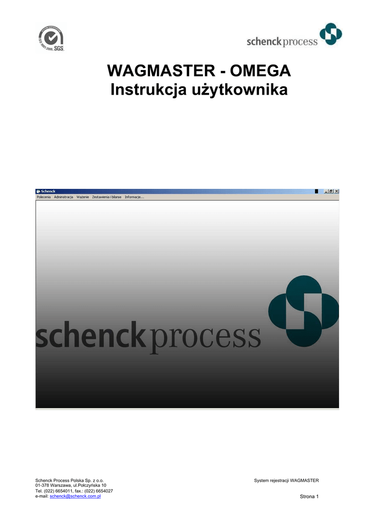 WAGMASTER - OMEGA Instrukcja użytkownika Schenck Process Polska Sp. z o.o. 01-378 Warszawa, ul.Połczyńska 10 Tel. (022) 6654011, fax.: (022) 6654027 e-mail: [email protected] System rejestracji WAGMASTER Strona 1 O programie... Program WAGMASTER-OMEGA służy do obsługi procesu ważenia w systemie wag zbiornikowych, rejestrowania danych z ważenia w lokalnej bazie MS ACCESS, wydruku raportów wagowych w formie zestawień lub bilansów, eksportu danych do plików XLS, generowania dokumentów WZ. W ramach standardowych właściwości programu jest również tworzenie kopii bezpieczeństwa danych oraz ich odtwarzanie z kopii bezpieczeństwa. Wymagania: komputer klasy PC z systemem operacyjnym Windows 98/XP/Vista, 64 MB RAM, 20MB wolnej przestrzeni na dysku HDD, porty szeregowe RS-232, ustawienie w sterowniku wagowym, procedury komunikacyjnej DDP8785. Schenck Process Polska Sp. z o.o. 01-378 Warszawa, ul.Połczyńska 10 Tel. (022) 6654011, fax.: (022) 6654027 e-mail: [email protected] System rejestracji WAGMASTER Strona 2 Uruchamianie programu Po uruchomieniu programu WAGMASTER – OMEGA należy wprowadzić nazwę logowania nadaną przez administratora oraz hasło, które użytkownik otrzymuje od administratora lub ustala podczas procedury definiowania użytkownika. Pole do wprowadzenia nazwy użytkownika Pole do wprowadzenia hasła użytkownika Schenck Process Polska Sp. z o.o. 01-378 Warszawa, ul.Połczyńska 10 Tel. (022) 6654011, fax.: (022) 6654027 e-mail: [email protected] System rejestracji WAGMASTER Strona 3 Ważenie Wybranie pozycji „Ważenie” na głównym ekranie programu spowoduje uruchomienie okna przedstawiającego aktualny stan procesu ważenia. Uruchomienie podglądu ważenia Sumaryczny ciężar dla danej wagi i dla danego przesyłu Prezentacja wejść sterownika wagowego. Kolor czerwony oznacza „aktywną” funkcję (zainicjowanie procesu „przesyłu”, osiągnięcie maksimum napełnienia itp...) Aktualny ciężar Status procesu Dane ostatniego cyklu Aktualny numer przesyłu Sumaryczny ciężar w ramach danego przesyłu Uruchomienie modułu dodawania / usuwania kontrahentów Schenck Process Polska Sp. z o.o. 01-378 Warszawa, ul.Połczyńska 10 Tel. (022) 6654011, fax.: (022) 6654027 e-mail: [email protected] System rejestracji WAGMASTER Strona 4 Zestawienie i bilanse ważeń Na przedstawionym poniżej ekranie, użytkownik może określić parametry zestawienia lub bilansu ważeń. Sposób prezentowania danych zależy od wybranego znacznika „Zestawienie” lub „Bilans”. W przypadku wybrania pozycji „Bilans”, nastąpi pogrupowanie wyników ważenia w ramach określonych kryteriów. Tabela zestawienia i bilansów jest aktualizowana bezpośrednio po określeniu parametru lub po wybraniu przycisku „Szukaj” Wydruk zestawienia lub bilansu Schenck Process Polska Sp. z o.o. 01-378 Warszawa, ul.Połczyńska 10 Tel. (022) 6654011, fax.: (022) 6654027 e-mail: [email protected] Zapisanie wyników ważenia do pliku w formacie Microsoft Excel System rejestracji WAGMASTER Strona 5 Wygląd ekranu bilansu ważeń UWAGA • • Po wybraniu przycisku „Eksport XLS” pojawi się okno , umożliwiające podanie lokalizacji i nazwy pliku z danymi. W przypadku wybrania przycisku „Eksport XLS” , selekcja danych odbywa się tylko na podstawie parametrów czasowych („data, czas od” i „data, czas do”) Schenck Process Polska Sp. z o.o. 01-378 Warszawa, ul.Połczyńska 10 Tel. (022) 6654011, fax.: (022) 6654027 e-mail: [email protected] System rejestracji WAGMASTER Strona 6 Wystawianie dokumentów WZ Nr WZ (nadawany przez system) Pola określające parametry dla dokumentu WZ Schenck Process Polska Sp. z o.o. 01-378 Warszawa, ul.Połczyńska 10 Tel. (022) 6654011, fax.: (022) 6654027 e-mail: [email protected] System rejestracji WAGMASTER Strona 7