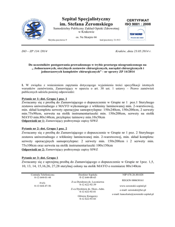 Szpital Specjalistyczny im. Stefana Żeromskiego CERTYFIKAT ISO 9001 : 2008 Samodzielny Publiczny Zakład Opieki Zdrowotnej w Krakowie os. Na Skarpie 66 Skrytka pocztowa 9 kod pocztowy 31-913 DO – ZP 134 /2014 Kraków, dnia 23.05.2014 r. Do uczestników postępowania prowadzonego w trybie przetargu nieograniczonego na „ Jednorazowych, sterylnych zestawów chirurgicznych, narzędzi chirurgicznych i jednorazowych kompletów chirurgicznych” - nr sprawy ZP 14/2014 I. W związku z wniesieniem zapytania dotyczącego wyjaśnienia treści specyfikacji istotnych warunków zamówienia, Zamawiający w oparciu o art. 38 ust. 1 ustawy – Prawo zamówień publicznych udziela poniżej odpowiedzi: Pytanie nr 1: dot. Grupa 1 poz. 1 Zwracamy się z prośbą do Zamawiającego o dopuszczenie w Grupie nr 1 poz.1 Sterylnego zestawu uniwersalnego z MAYO wykonanego z włókniny laminowanej min. 2-warstwowej, min. skład kompletu serwety operacyjne samoprzylepne: 150x240cm, 150x200cm, 2 serwety min.75x90cm, serweta na stolik instrumentariuszki min. 150x200cm, serwety na stolik MAYO min.80x140cm, przylepiec taśmowy min.10x50cm Odpowiedź nr 1: Zamawiający podtrzymuje zapisy SIWZ Pytanie nr 2: dot. Grupa 1 poz. 2 Zwracamy się z prośbą do Zamawiającego o dopuszczenie w Grupie nr 1 poz. 2 Sterylnego zestawu uniwersalnego z włókniny laminowanej min. 2-warstwowej, min. skład kompletu: serwety operacyjnych samoprzylepne: 2 serwety min. 150x200cm i 2 serwety min. 75x100cm oraz serweta na stolik instrumentariuszki 100x150cm Odpowiedź nr 2: Zamawiający podtrzymuje zapisy SIWZ Pytanie nr 3: dot. Grupa 1 Zwracamy się z uprzejmą prośbą do Zamawiającego o dopuszczenie w Grupie nr 1poz. 1,5, 10, 13, 14, 15,16,26, 27,28 sterylnej osłony na stolik MAYO o rozmiarze 80x140cm Centrala Telefoniczna 0-12 644-01-44 FAX: 0-12 644-47-56 Dyrektor Szpitala 0-12 644-08-65 Z-ca Dyrektora ds. Lecznictwa 0-12 622-92-39 Z-ca Dyrektora ds. Ekon.-Adm. 0-12 622-92-81 Główny Księgowy 0-12 622-93-83 NIP 678-26-80-028 REGON 000630161 www.zeromski-szpital.pl e-mail: [email protected] e-mail: [email protected] Szpital Specjalistyczny im. Stefana Żeromskiego CERTYFIKAT ISO 9001 : 2008 Samodzielny Publiczny Zakład Opieki Zdrowotnej w Krakowie os. Na Skarpie 66 Skrytka pocztowa 9 kod pocztowy 31-913 Odpowiedź nr 3: Zamawiający dopuszcza w grupie 1 poz. 1,5, 10, 13, 14, 15,16,26, 27,28 sterylnej osłony na stolik MAYO o rozmiarze 80x140cm, pod warunkiem spełnienia pozostałych wymogów zawartych w SIWZ. Pytanie nr 4; dot. Grupa 1 poz. 5. Zwracamy się do Zamawiającego o dopuszczenie w Grupie nr 1 poz. 5 Sterylnego zestawu do dłoni i stopy z MAYO o minimalnym składzie: serweta do zabiegów dłoni i stopy min. 200x320cm z elastycznym samouszczelniającym się otworem, serweta na stolik instrumentariuszki min. 140x190cm, serweta na stolik MAYO 80x140cm. Odpowiedź nr 4. Zamawiający dopuszcza w Grupie nr 1 poz. 5 Sterylny zestaw do dłoni i stopy z MAYO o minimalnym składzie: serweta do zabiegów dłoni i stopy min. 200x320cm z elastycznym samouszczelniającym się otworem, serweta na stolik instrumentariuszki min. 140x190cm, serweta na stolik MAYO 80x140cm, pod warunkiem spełnienia pozostałych wymogów zawartych w SIWZ. Pytanie nr 5: dot. Grupa 1 poz. 8. Zwracamy się do Zamawiającego o dopuszczenie w Grupie nr 1 poz.8 Sterylnego zestawu do małej chirurgii wykonanego z włókniny laminowanej min. 2-warstwowej o min. składzie serweta z samoprzylepnym otworem o śr. Min. 15cm min.200x240cm,serweta na stolik instrumentariuszki min.140x190cm. Odpowiedź nr 5. Zamawiający dopuszcza w Grupie nr 1 poz.8 Sterylny zestaw do małej chirurgii wykonanego z włókniny laminowanej min. 2-warstwowej o min. składzie serweta z samoprzylepnym otworem o śr. Min. 15cm min.200x240cm,serweta na stolik instrumentariuszki min.140x190cm, pod warunkiem spelnienia pozostałych wymogów zawartych w SIWZ. Centrala Telefoniczna 0-12 644-01-44 FAX: 0-12 644-47-56 Dyrektor Szpitala 0-12 644-08-65 Z-ca Dyrektora ds. Lecznictwa 0-12 622-92-39 Z-ca Dyrektora ds. Ekon.-Adm. 0-12 622-92-81 Główny Księgowy 0-12 622-93-83 NIP 678-26-80-028 REGON 000630161 www.zeromski-szpital.pl e-mail: [email protected] e-mail: [email protected] Szpital Specjalistyczny im. Stefana Żeromskiego CERTYFIKAT ISO 9001 : 2008 Samodzielny Publiczny Zakład Opieki Zdrowotnej w Krakowie os. Na Skarpie 66 Skrytka pocztowa 9 kod pocztowy 31-913 Pytanie nr 6: dot. Grupa 1 poz. 9 Zwracamy się do Zamawiającego o dopuszczenie w Grupie nr 1 poz. 9 Sterylnego zestawu do ginekologii wykonanego z włókniny laminowanej min.2-warstwowej. Skład zestawu: serweta na stolik instrumentariuszki min. 100x150cm, serweta z oknem samoprzylepnym o wym. 6x8cm w roz. 100x200cm, 2 osłony na kończyny o wym. 75x120cm. Odpowiedź nr 6. Zamawiający podtrzymuje zapisy SIWZ Pytanie nr 7: dot. Grupa 1 poz. 13 Zwracamy się do Zamawiającego o dopuszczenie w Grupie nr 1 poz. 13 Zestawu do operacji oczu wykonanego z włókniny laminowanej o następującym składzie: osłona na stolik MAYO 80x140cm, serweta okulistyczna o wym. Serweta okulistyczna o rozmiarze 120x160cm wykonana, z paroprzepuszczalnej włókniny trójwarstwowej typu SMS o gramaturze 51g/m2. Serweta jest zintegrowana z dwiema kieszeniami foliowymi do przechwytywania płynów o rozmiarach 25x26cm z usztywnionymi brzegami do formowania, otwór 10x10cm wypełniony folią chirurgiczną o wysokiej paroprzepuszczaloności min.1500g/m2/24h potwierdzone dokumentacją producenta folii, na wysokości nosa pacjenta wbudowana elastyczna kształtka umożliwiająca dopasowanie serwety do kształtu twarzy pacjenta, serweta 2-warstwowa 75x100cm, 2 pokrowce na podłokietniki 35x75cmz przylepcami. Sterylizacja tlenkiem etylenu Klasa sterylności Is Odpowiedź nr 7: Zamawiający podtrzymuje zapisy SIWZ Pytanie nr 8: dot. Grupa 1, poz. 16 Zwracamy się do Zamawiającego o dopuszczenie w Grupie nr 1 poz. 16 Zestawu do cięcia cesarskiego wykonanego z laminat
