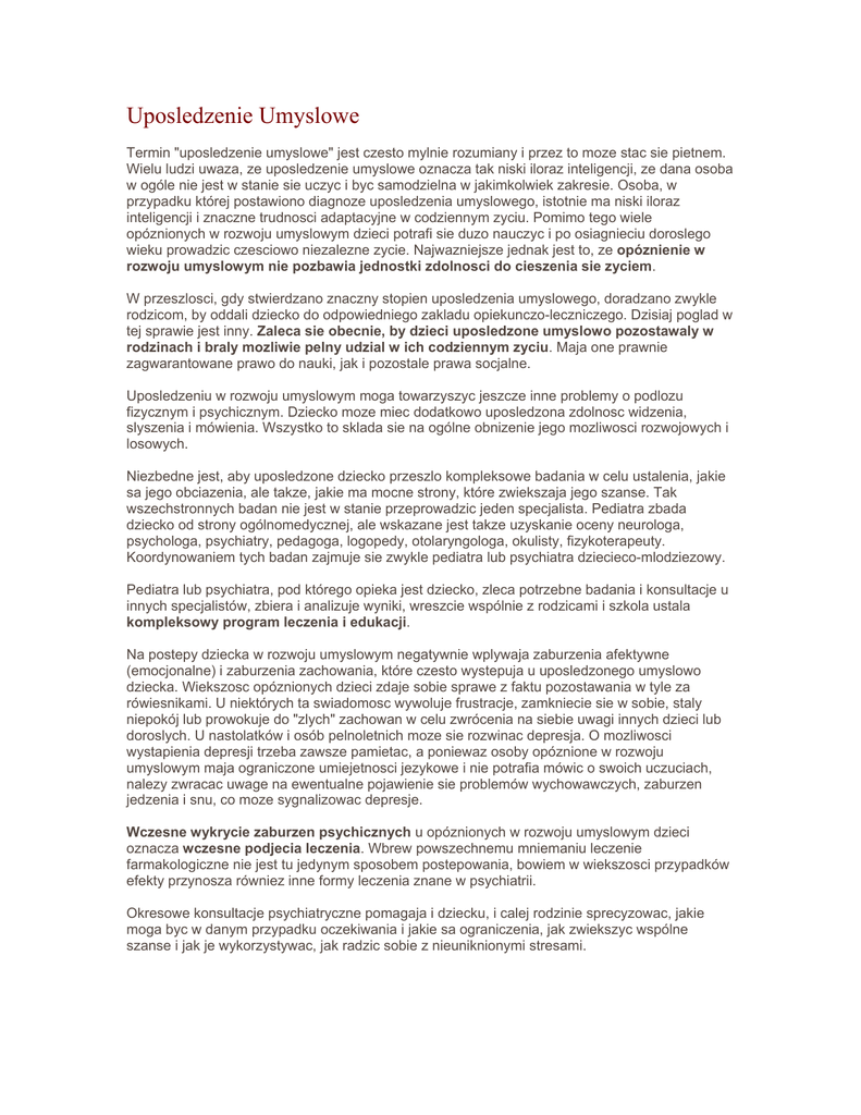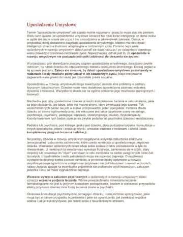Uposledzenie Umyslowe Termin "uposledzenie umyslowe" jest czesto mylnie rozumiany i przez to moze stac sie pietnem. Wielu ludzi uwaza, ze uposledzenie umyslowe oznacza tak niski iloraz inteligencji, ze dana osoba w ogóle nie jest w stanie sie uczyc i byc samodzielna w jakimkolwiek zakresie. Osoba, w przypadku której postawiono diagnoze uposledzenia umyslowego, istotnie ma niski iloraz inteligencji i znaczne trudnosci adaptacyjne w codziennym zyciu. Pomimo tego wiele opóznionych w rozwoju umyslowym dzieci potrafi sie duzo nauczyc i po osiagnieciu doroslego wieku prowadzic czesciowo niezalezne zycie. Najwazniejsze jednak jest to, ze opóznienie w rozwoju umyslowym nie pozbawia jednostki zdolnosci do cieszenia sie zyciem. W przeszlosci, gdy stwierdzano znaczny stopien uposledzenia umyslowego, doradzano zwykle rodzicom, by oddali dziecko do odpowiedniego zakladu opiekunczo-leczniczego. Dzisiaj poglad w tej sprawie jest inny. Zaleca sie obecnie, by dzieci uposledzone umyslowo pozostawaly w rodzinach i braly mozliwie pelny udzial w ich codziennym zyciu. Maja one prawnie zagwarantowane prawo do nauki, jak i pozostale prawa socjalne. Uposledzeniu w rozwoju umyslowym moga towarzyszyc jeszcze inne problemy o podlozu fizycznym i psychicznym. Dziecko moze miec dodatkowo uposledzona zdolnosc widzenia, slyszenia i mówienia. Wszystko to sklada sie na ogólne obnizenie jego mozliwosci rozwojowych i losowych. Niezbedne jest, aby uposledzone dziecko przeszlo kompleksowe badania w celu ustalenia, jakie sa jego obciazenia, ale takze, jakie ma mocne strony, które zwiekszaja jego szanse. Tak wszechstronnych badan nie jest w stanie przeprowadzic jeden specjalista. Pediatra zbada dziecko od strony ogólnomedycznej, ale wskazane jest takze uzyskanie oceny neurologa, psychologa, psychiatry, pedagoga, logopedy, otolaryngologa, okulisty, fizykoterapeuty. Koordynowaniem tych badan zajmuje sie zwykle pediatra lub psychiatra dziecieco-mlodziezowy. Pediatra lub psychiatra, pod którego opieka jest dziecko, zleca potrzebne badania i konsultacje u innych specjalistów, zbiera i analizuje wyniki, wreszcie wspólnie z rodzicami i szkola ustala kompleksowy program leczenia i edukacji. Na postepy dziecka w rozwoju umyslowym negatywnie wplywaja zaburzenia afektywne (emocjonalne) i zaburzenia zachowania, które czesto wystepuja u uposledzonego umyslowo dziecka. Wiekszosc opóznionych dzieci zdaje sobie sprawe z faktu pozostawania w tyle za rówiesnikami. U niektórych ta swiadomosc wywoluje frustracje, zamkniecie sie w sobie, staly niepokój lub prowokuje do "zlych" zachowan w celu zwrócenia na siebie uwagi innych dzieci lub doroslych. U nastolatków i osób pelnoletnich moze sie rozwinac depresja. O mozliwosci wystapienia depresji trzeba zawsze pamietac, a poniewaz osoby opóznione w rozwoju umyslowym maja ograniczone umiejetnosci jezykowe i nie potrafia mówic o swoich uczuciach, nalezy zwracac uwage na ewentualne pojawienie sie problemów wychowawczych, zaburzen jedzenia i snu, co moze sygnalizowac depresje. Wczesne wykrycie zaburzen psychicznych u opóznionych w rozwoju umyslowym dzieci oznacza wczesne podjecia leczenia. Wbrew powszechnemu mniemaniu leczenie farmakologiczne nie jest tu jedynym sposobem postepowania, bowiem w wiekszosci przypadków efekty przynosza równiez inne formy leczenia znane w psychiatrii. Okresowe konsultacje psychiatryczne pomagaja i dziecku, i calej rodzinie sprecyzowac, jakie moga byc w danym przypadku oczekiwania i jakie sa ograniczenia, jak zwiekszyc wspólne szanse i jak je wykorzystywac, jak radzic sobie z nieuniknionymi stresami.