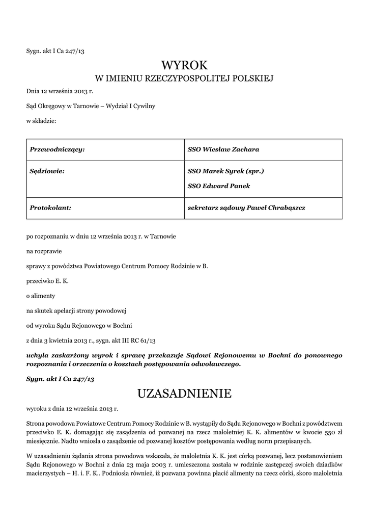 Sygn. akt I Ca 247/13 WYROK W IMIENIU RZECZYPOSPOLITEJ POLSKIEJ Dnia 12 września 2013 r. Sąd Okręgowy w Tarnowie – Wydział I Cywilny w składzie: Przewodniczący: SSO Wiesław Zachara Sędziowie: SSO Marek Syrek (spr.) SSO Edward Panek Protokolant: sekretarz sądowy Paweł Chrabąszcz po rozpoznaniu w dniu 12 września 2013 r. w Tarnowie na rozprawie sprawy z powództwa Powiatowego Centrum Pomocy Rodzinie w B. przeciwko E. K. o alimenty na skutek apelacji strony powodowej od wyroku Sądu Rejonowego w Bochni z dnia 3 kwietnia 2013 r., sygn. akt III RC 61/13 uchyla zaskarżony wyrok i sprawę przekazuje Sądowi Rejonowemu w Bochni do ponownego rozpoznania i orzeczenia o kosztach postępowania odwoławczego. Sygn. akt I Ca 247/13 UZASADNIENIE wyroku z dnia 12 września 2013 r. Strona powodowa Powiatowe Centrum Pomocy Rodzinie w B. wystąpiły do Sądu Rejonowego w Bochni z powództwem przeciwko E. K. domagając się zasądzenia od pozwanej na rzecz małoletniej K. K. alimentów w kwocie 550 zł miesięcznie. Nadto wniosła o zasądzenie od pozwanej kosztów postępowania według norm przepisanych. W uzasadnieniu żądania strona powodowa wskazała, że małoletnia K. K. jest córką pozwanej, lecz postanowieniem Sądu Rejonowego w Bochni z dnia 23 maja 2003 r. umieszczona została w rodzinie zastępczej swoich dziadków macierzystych – H. i. F. K.. Podniosła również, iż pozwana powinna płacić alimenty na rzecz córki, skoro małoletnia jest uczennicą III klasy szkoły podstawowej, nie posiada dochodów ani majątku, z którego mogłaby się utrzymywać, zaś H. i. F. K., choć pracują, to jednak nie pobierają świadczeń z tytułu pełnienia funkcji rodziny zastępczej. Dodała również, iż pozwana jest w stanie płacić żądaną tytułem alimentów kwotę, gdyż osiąga dochody z tytułu pracy i poza małoletnią nie ma innych osób na utrzymaniu. Jako podstawę prawną powództwa strona powodowa wskazała przepis art. 38 ust. 2 ustawy z dnia 9 czerwca 2011 r. o wspieraniu rodziny i systemie pieczy zastępczej i art. 333 k.r.o. Pozwana E. K. wniosła o oddalenie powództwa. Podniosła, iż nie jest w stanie płacić alimentów na rzecz córki, gdyż nie pracuje i dopiero w przyszłości zamierza prowadzić działalność gospodarczą, na rozpoczęcie której uzyskała pieniądze od swoich rodziców i od konkubenta. Wskazała również, iż w miarę możliwości przyczynia się do utrzymania córki. Wyrokiem z dnia 3 kwietnia 2013 r., sygn. akt III RC 61/13, Sąd Rejonowy w Bochni oddalił powództwo. W pisemnych motywach tego rozstrzygnięcia Sąd Rejonowy podniósł, iż powództwo jest niezasadne, gdyż pozwana nie uzyskuje dochodów i pozostaje na utrzymaniu swoich rodziców, pełniących funkcję rodziny zastępczej dla jej córki, zaś H. i. F. K.utrzymują małoletnią z własnych środków i nie domagają się zasądzenia od pozwanej alimentów. Zdaniem Sądu Rejonowego uwzględnienie powództwa doprowadziłoby do sytuacji, w której alimenty na rzecz małoletniej w rzeczywistości byłyby płacone przez jej dziadków macierzystych. Z powyższym rozstrzygnięciem nie zgodziła się strona powodowa zaskarżając je w całości i zarzucając mu błędną wykładnię i niewłaściwe zastosowanie przepisów art. 133 § 1 k.r.o. w zw. z art. 96 k.r.o. poprzez uznanie, że pozwana nie jest obowiązana do świadczenia alimentacyjnego na rzecz swojej małoletniej córki, pomimo tego, że małoletnia nie jest w stanie samodzielnie się utrzymać, a dochody z jej majątku nie wystarczają na pokrycie kosztów jej utrzymania i wychowania. Formułując tej treści zarzuty skarżąca wniosła o zmianę zaskarżonego wyroku poprzez uwzględnienie powództwa w całości i zasądzenie na jej rzecz kosztów procesu według norm przepisanych, ewentualnie o uchylenie zaskarżonego wyroku i przekazanie sprawy do ponownego rozpoznania Sądowi I instancji. W uzasadnieniu środka odwoławczego skarżąca zarzuciła, iż Sąd Rejonowy bezpodstawnie oddalił jej powództwo, gdyż – zgodnie z ugruntowanymi w judykaturze poglądami - na rodzicach z mocy samego prawa ciąży obowiązek łożenia na utrzymanie dziecka i żadne z rodziców, a tym bardziej rodzic zastępczy, nie może zrzec się w imieniu dziecka przysługujących mu świadczeń alimentacyjnych. F. K. w odpowiedzi na apelację wniósł o jej oddalenie. Podniósł, iż żądanie strony powodowej jest bezzasadne, skoro na nim i na jego żonie również ciąży obowiązek alimentacyjny względem małoletniej K. i obowiązek ten w pełni realizują, zaspakajając wszystkie potrzeby małoletniej wnuczki, pozwana zaś nie jest w stanie łożyć na utrzymanie córki, gdyż prowadzi działalność gospodarczą dopiero od maja 2013 r. i nie przynosi ona jeszcze dochodów. Wskazał także, iż za niezasadnością żądania strony powodowej przemawia dodatkowo fakt, iż od lutego 2013 r. nie pobiera świadczeń z tytuły pełnienia funkcji rodziny zastępczej. Sąd Okręgowy zważył, co następuje. Apelacja strony powodowej zasługuje na uwzględnienie w zakresie w jakim wnosi o uchylenie zaskarżonego wyroku i przekazanie sprawy do ponownego rozpoznania Sądowi I instancji. Zgodnie z art. 133 § 1 k.r.o. rodzice obowiązani są do świadczeń alimentacyjnych względem dziecka, które nie jest w stanie utrzymać się samodzielnie, chyba że dochody z majątku dziecka wystarczają na pokrycie kosztów jego utrzymania i wychowania. Z przepisu tego wynika, że rodzice mogą być zwolnieni od świadczeń alimentacyjnych w stosunku do dziecka tylko wtedy, gdy dziecko posiada własny majątek, a dochody z tego majątku wystarczają na pokrycie kosztów jego utrzymania i wychowania. We wszystkich innych wypadkach na rodzicach ciąży obowiązek alimentacyjny względem dziecka, ograniczony tylko – stosownie do art. 135 § 1 k.r.o. – do usprawiedliwionych potrzeb uprawnionego oraz zarobkowych i majątkowych możliwości zobowiązanego. Zob