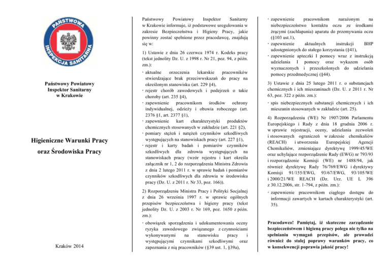 Państwowy Powiatowy Inspektor Sanitarny w Krakowie informuje, iż podstawowe uregulowania w zakresie Bezpieczeństwa i Higieny Pracy, jakie powinny zostać spełnione przez pracodawcę, znajdują się w: 1) Ustawie z dnia 26 czerwca 1974 r. Kodeks pracy (tekst jednolity Dz. U. z 1998 r. Nr 21, poz. 94, z późn. zm.): Państwowy Powiatowy Inspektor Sanitarny w Krakowie Higieniczne Warunki Pracy oraz Środowiska Pracy Kraków 2014 aktualne orzeczenia lekarskie pracowników stwierdzające brak przeciwwskazań do pracy na określonym stanowisku (art. 229 §4), rejestr chorób zawodowych i podejrzeń o takie choroby (art. 235 §4), zapewnienie pracownikom środków ochrony indywidualnej, odzieży i obuwia roboczego (art. 2376 §1, art. 2377 §1), zapewnienie kart charakterystyki produktów chemicznych stosowanych w zakładzie (art. 221 §2), pomiary stężeń i natężeń czynników szkodliwych występujących na stanowiskach pracy (art. 227 §1), rejestr i karty badań i pomiarów czynników szkodliwych dla zdrowia występujących na stanowiskach pracy (wzór rejestru i kart określa załącznik nr 1, 2 do rozporządzenia Ministra Zdrowia z dnia 2 lutego 2011 r. w sprawie badań i pomiarów czynników szkodliwych dla zdrowia w środowisku pracy (Dz. U. z 2011 r. Nr 33, poz. 166)). zapewnienie pracownikom narażonym na niebezpieczeństwo kontaktu oczu ze środkami żrącymi (zachlapania) aparatu do przemywania oczu (§103 ust.1), zapewnienie aktualnych instrukcji BHP udostępnionych do stałego korzystania (§41), zapewnienie apteczki I pomocy wraz z instrukcją udzielania I pomocy oraz wykazem osób wyznaczonych i przeszkolonych do udzielania pomocy przedmedycznej (§44). 3) Ustawie z dnia 25 lutego 2011 r. o substancjach chemicznych i ich mieszaninach (Dz. U. z 2011 r. Nr 63, poz. 322 z późn. zm.): spis niebezpiecznych substancji chemicznych i ich mieszanin stosowanych w zakładzie (art. 25). 4) Rozporządzeniu (WE) Nr 1907/2006 Parlamentu Europejskiego i Rady z dnia 18 grudnia 2006 r. w sprawie rejestracji, oceny, udzielania zezwoleń i stosowanych ograniczeń w zakresie chemikaliów (REACH) i utworzenia Europejskiej Agencji Chemikaliów, zmieniające dyrektywę 1999/45/WE oraz uchylające rozporządzenie Rady (EWG) nr 793/93 i rozporządzenie Komisji (WE) nr 1488/94, jak również dyrektywę Rady 76/769/EWG i dyrektywy Komisji 91/155/EWG, 93/67/EWG, 93/105/WE i 2000/21/WE REACH (Dz. Urz. UE L 396 z 30.12.2006, str. 1-794, z późn. zm.): 2) Rozporządzeniu Ministra Pracy i Polityki Socjalnej z dnia 26 września 1997 r. w sprawie ogólnych przepisów bezpieczeństwa i higieny pracy (tekst jednolity Dz. U. z 2003 r. Nr 169, poz. 1650 z późn. zm.): zapewnienie pracownikom ciągłego dostępu do informacji zawartych w kartach charakterystyki (art. 35). obowiązek sporządzenia i udokumentowania oceny ryzyka zawodowego związanego z czynnościami wykonywanymi na stanowisku pracy i występującymi czynnikami szkodliwymi oraz zapoznania z nią pracowników (§39 ust. 1, §39a), Pracodawco! Pamiętaj, iż skuteczne zarządzanie bezpieczeństwem i higieną pracy polega nie tylko na spełnianiu wymagań przepisów, ale prowadzi również do stałej poprawy warunków pracy, co w konsekwencji poprawia jakość pracy!