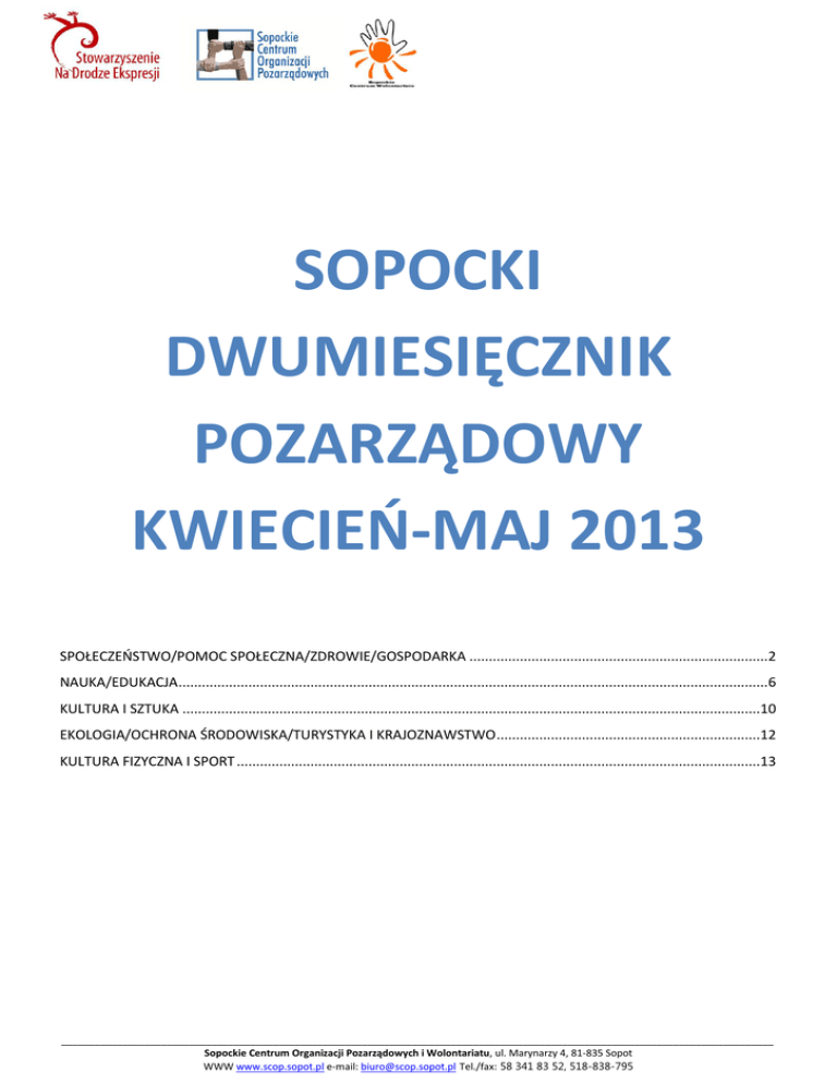 SOPOCKI DWUMIESIĘCZNIK POZARZĄDOWY KWIECIEŃ-MAJ 2013 SPOŁECZEŃSTWO/POMOC SPOŁECZNA/ZDROWIE/GOSPODARKA .............................................................................2 NAUKA/EDUKACJA ........................................................................................................................................................6 KULTURA I SZTUKA .....................................................................................................................................................10 EKOLOGIA/OCHRONA ŚRODOWISKA/TURYSTYKA I KRAJOZNAWSTWO ....................................................................12 KULTURA FIZYCZNA I SPORT .......................................................................................................................................13 ________________________________________________________________________________________________________________________________ Sopockie Centrum Organizacji Pozarządowych i Wolontariatu, ul. Marynarzy 4, 81-835 Sopot WWW www.scop.sopot.pl e-mail: [email protected] Tel./fax: 58 341 83 52, 518-838-795 SPOŁECZEŃSTWO/POMOC SPOŁECZNA/ZDROWIE/GOSPODARKA I. Program Bank Ambitnej Młodzieży Fundacja Banku Zachodniego WBK chce być partnerem dla instytucji wychowawczych i organizacji młodzieżowych, które skupiają ambitnych, twórczych i odpowiedzialnych młodych ludzi wokół inicjatyw edukacyjnych, obywatelskich i społecznych. 1. Rozwój i edukacja Wsparcie zadań w zakresie nauki, edukacji i oświaty, w tym projektów związanych z organizacją specjalistycznych kursów, szkoleń, staży naukowych i zawodowych w Polsce i za granicą; szczególnie z zakresu matematyki, informatyki, ekonomii. Różne formy interaktywnych zajęć promujących wiedzę, kształtujących umiejętności, rozwijających indywidualne talenty i zdolności. Główne przedmioty dofinansowania: Udział w ogólnopolskich i międzynarodowych olimpiadach przedmiotowych Organizacja warsztatów tematycznych Organizacja imprez edukacyjnych, szkoleń, konkursów Kursy dokształcające, etc. 2. Aktywność gospodarcza, obywatelska, społeczna Dofinansowanie działalności wspomagającej wkład młodzieży w rozwój wspólnot i społeczności lokalnych; upowszechnianie zasad określających prawa człowieka, swobody obywatelskie, a także działania wspomagające rozwój i rozumienie zasad demokracji. Ponadto działalność na rzecz integracji europejskiej oraz rozwijania kontaktów i współpracy młodzieży z różnych krajów. Kursy i warsztaty uczące młodych przedsiębiorczości i aktywności społecznej. Główne przedmioty dofinansowania: Warsztaty, projekty aktywizujące młodzież z małych miejscowości Współpraca młodzieży z lokalnymi samorządami Organizacja debat, spotkań, szkoleń Kursy, szkolenia, etc. 3. Kultura, historia i dziedzictwo narodowe Pomoc w sfinansowaniu przedsięwzięć służących wzmacnianiu więzi młodych ludzi z Ojczyzną, podtrzymywaniu i pielęgnowaniu polskich tradycji narodowych oraz przybliżaniu wiedzy historycznej. Promocja wybitnych postaci, zasłużonych dla polskiej kultury i ważnych wydarzeń, kształtujących dzieje Polski. Główne przedmioty dofinansowania: Koncerty, wystawy, spotkania Gry terenowe Inscenizacje i rekonstrukcje historyczne Tworzenie szkolnych izb pamięci, upamiętniające bohaterów naszych czasów Konkursy historyczne, etc. ________________________________________________________________________________________________________________________________ Sopockie Centrum Organizacji Pozarządowych i Wolontariatu, ul. Marynarzy 4, 81-835 Sopot WWW www.scop.sopot.pl e-mail: [email protected] Tel./fax: 58 341 83 52, 518-838-795 II. Instytucja ogłaszająca konkurs: Fundacja Banku Zachodniego WBK Termin składania wniosków: na bieżąco (!) Szczegóły:http://fundacja.bzwbk.pl/programy-grantowe/bank-ambitnej-mlodziezy/bank-ambitnejmlodziezy-o-programie.html Realizacja polsko – niemieckich inicjatyw z zakresu: Współpraca instytucjonalna Polsko-niemieckie przedsięwzięcia mające charakter spotkań oraz działania na rzecz partnerstwa (w szczególności partnerska współpraca samorządów i innych instytucji). Nauka, kształcenie Prace naukowe dotyczące Polski, Niemiec i Unii Europejskiej (w szczególności z zakresu wiedzy o Polsce i Niemczech), realizowane m.in. w formie projektów badawczych, konferencji, seminariów lub publikacji; kształcenie i wspieranie nauki języka polskiego i niemieckiego jako języków obcych oraz polonistyki i germanistyki w kraju sąsiada; konkursy wiedzy dotyczące Polski, Niemiec i Unii Europejskiej. Media Praca medialna realizowana poprzez: przyznawanie Polsko-Niemieckiej Nagrody Medialnej, oferty informacyjne oraz wydarzenia dla dziennikarzy i przedstawicieli mediów oraz poprzez własną działalność publiczną na rzecz poprawy wzajemnej percepcji Polaków i Niemców. Kultura Wspieranie wzajemnego porozumienia poprzez kulturę (w szczególności poprzez działalność literacką i artystyczną dotyczącą Polski, Niemiec i Unii Europejskiej) oraz działania na rzecz zachowania wspólnego dziedzictwa kulturowego. III. Instytucja ogłaszająca konkurs: Fundacja Współpracy Polsko - Niemieckiej Termin składania wniosków: do 10.000 PLN / 2.500 EUR można składać na bieżąco, jednak nie później niż 2 miesiące przed terminem rozpoczęcia projektu; UWAGA: Wnioskodawca, który nie rozliczył poprzedniego projektu, na który otrzymał dotację do 10.000 PLN / 2.500 EUR, nie może złożyć nowego wniosku. powyżej 10.000 PLN / 2.500 EUR można składać maks. raz na 3 miesiące, jednak nie później niż 4 miesiące przed terminem rozpoczęcia projektu; UWAGA: Wnioskodawca zalegający z rozliczeniem zrealizowanego projektu, na który otrzymał dotację powyżej 10.000 PLN / 2.500 EUR, nie może złożyć nowego wniosku. Szczegóły: http://fwpn.org.pl/wnioski/co-wspieramy- Darowizny Fundacji ENERGA Fundacja realizu