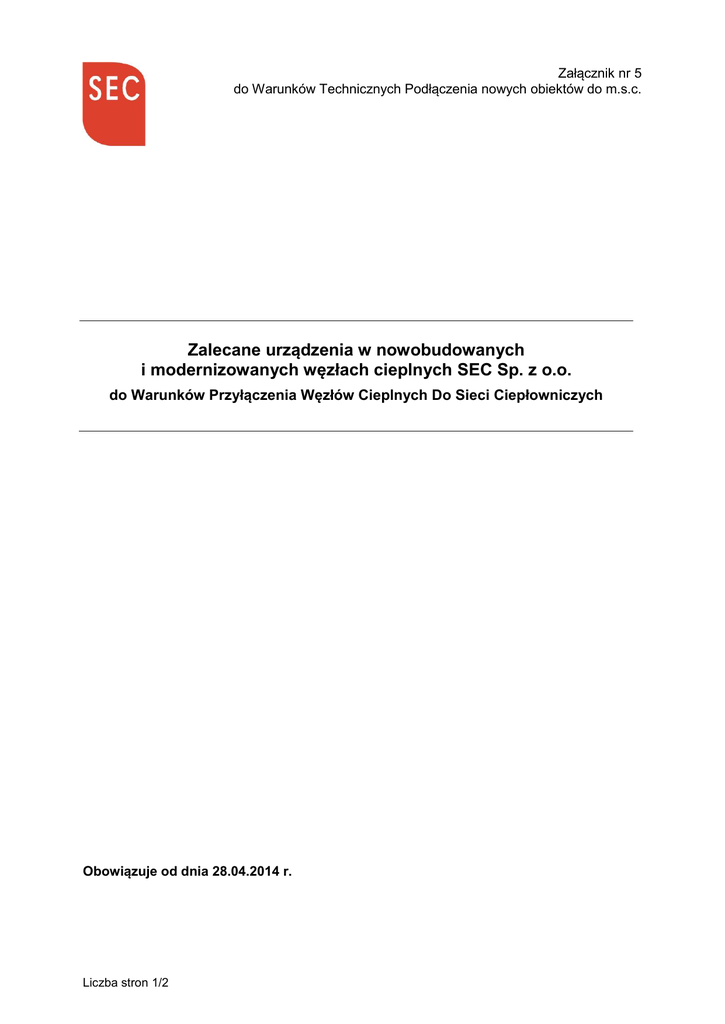 Załącznik nr 5 do Warunków Technicznych Podłączenia nowych obiektów do m.s.c. Zalecane urządzenia w nowobudowanych i modernizowanych węzłach cieplnych SEC Sp. z o.o. do Warunków Przyłączenia Węzłów Cieplnych Do Sieci Ciepłowniczych Obowiązuje od dnia 28.04.2014 r. Liczba stron 1/2 Załącznik nr 5 do Warunków Technicznych Podłączenia nowych obiektów do m.s.c. Lp. Podstawowe urządzenia węzła cieplnego Producent, typ 1. Automatyka w węzłach Samson Siemens 2. Zawory Δp/V, zawory ze stałą nastawą Δp i regulacją przepływu Regulatory przepływu i różnicy ciśnień Samson 3. Pompy LFP Leszno Grundfos Wilo 4. Wymienniki lutowane miedzią Alfa Laval Sondex, 5. Wymienniki skręcane Alfa Laval Sondex, 6. Wymienniki łączone stalą nierdzewną typu NS Alfa Laval 7. Naczynia wzbiorcze Reflex, Pneumatex, Flamco 8. Liczniki ciepła – ultradźwiękowe Mirometr 9. Filtroodmulniki Termen Wrocław, Thermo Poznań 10. Filtry z wkładem magnetycznym ZETKAMA, EFAR 11. Osadnik – filtry siatkowe ZETKAMA, EFAR 12. Wodomierze Powogaz, Aquarius, ITRON 13. Zawory mufowe (T 150°C, PN 1,6) Zawory zwrotne klapowe IDMAR, COMAP 14. Zawory Ballorex BROEN (Zawgaz, DZT) 15. Zawory bezpieczeństwa SYR (HUSTY S.C. Kraków), Flamco 16. Zawory, armatura odcinająca Naval, Broen (Zawgaz, DZT) W przypadku węzłów cieplnych, które będą własnością SEC Sp. z o.o. stosowanie innych urządzeń jest możliwe pod warunkiem, że: a. stosowanie urządzeń zostało uzgodnione z SEC Sp. z o.o., b. dopuszczone są do stosowania w kraju i posiadają wymagane certyfikaty. W przypadku węzłów cieplnych należących do odbiorcy ciepła, które w przyszłości odbiorca ciepła zamierza odsprzedać lub oddać w eksploatację służbom technicznym SEC Sp. z o.o. należy stosować urządzenia z listy zawartej w niniejszym załączniku. Liczba stron 2/2