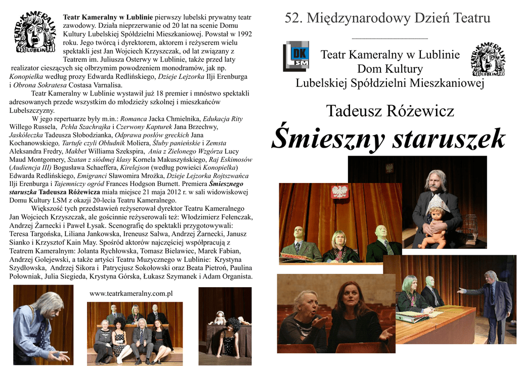 Teatr Kameralny w Lublinie pierwszy lubelski prywatny teatr zawodowy. Działa nieprzerwanie od 20 lat na scenie Domu Kultury Lubelskiej Spółdzielni Mieszkaniowej. Powstał w 1992 roku. Jego twórcą i dyrektorem, aktorem i reżyserem wielu spektakli jest Jan Wojciech Krzyszczak, od lat związany z Teatrem im. Juliusza Osterwy w Lublinie, także przed laty realizator cieszących się olbrzymim powodzeniem monodramów, jak np. Konopielka według prozy Edwarda Redlińskiego, Dzieje Lejzorka Ilji Erenburga i Obrona Sokratesa Costasa Varnalisa. Teatr Kameralny w Lublinie wystawił już 18 premier i mnóstwo spektakli adresowanych przede wszystkim do młodzieży szkolnej i mieszkańców Lubelszczyzny. W jego repertuarze były m.in.: Romanca Jacka Chmielnika, Edukacja Rity Willego Russela, Pchła Szachrajka i Czerwony Kapturek Jana Brzechwy, Jaskółeczka Tadeusza Słobodzianka, Odprawa posłów greckich Jana Kochanowskiego, Tartufe czyli Obłudnik Moliera, Śluby panieńskie i Zemsta Aleksandra Fredry, Makbet Williama Szekspira, Ania z Zielonego Wzgórza Lucy Maud Montgomery, Szatan z siódmej klasy Kornela Makuszyńskiego, Raj Eskimosów (Audiencja III) Bogusława Schaeffera, Kirelejson (według powieści Konopielka) Edwarda Redlińskiego, Emigranci Sławomira Mrożka, Dzieje Lejzorka Rojtszwańca Ilji Erenburga i Tajemniczy ogród Frances Hodgson Burnett. Premiera Śmiesznego staruszka Tadeusza Różewicza miała miejsce 21 maja 2012 r. w sali widowiskowej Domu Kultury LSM z okazji 20-lecia Teatru Kameralnego. Większość tych przedstawień reżyserował dyrektor Teatru Kameralnego Jan Wojciech Krzyszczak, ale gościnnie reżyserowali też: Włodzimierz Fełenczak, Andrzej Żarnecki i Paweł Łysak. Scenografię do spektakli przygotowywali: Teresa Targońska, Liliana Jankowska, Ireneusz Salwa, Andrzej Żarnecki, Janusz Sianko i Krzysztof Kain May. Spośród aktorów najczęściej współpracują z Teatrem Kameralnym: Jolanta Rychłowska, Tomasz Bielawiec, Marek Fabian, Andrzej Golejewski, a także artyści Teatru Muzycznego w Lublinie: Krystyna Szydłowska, Andrzej Sikora i Patrycjusz Sokołowski oraz Beata Pietroń, Paulina Połowniak, Julia Siegieda, Krystyna Górska, Łukasz Szymanek i Adam Organista. www.teatrkameralny.com.pl 52. Międzynarodowy Dzień Teatru -------------------------------------------------------------- Teatr Kameralny w Lublinie Dom Kultury Lubelskiej Spółdzielni Mieszkaniowej Tadeusz Różewicz Śmieszny staruszek Teatr Kameralny w Lublinie: Jak cierń Tadeusz Różewicz napisał „Śmiesznego staruszka” w 1963 roku i przypomnienie tego wydaje się istotne. Bowiem lata, które upłynęły od owego czasu oraz przemiany społeczne i obyczajowe, jakie zaszły w naszym kraju i w nas samych sprawiają, że inaczej dziś odczytujemy ów dramat, inaczej nań patrzymy. Wtedy ów tytułowy staruszek mógł rzeczywiście wydawać się śmieszny, dziwaczny, a opisana w sztuce sytuacja wręcz groteskowa. Dziś jednak, gdy obowiązuje wszechobecny kult młodości, a ludzie starzy spychani są już nawet nie na margines, lecz wręcz gdzieś jeszcze dalej, bohater sztuki jawi się nam jako postać bez mała tragiczna. Tym bardziej, że zdaje się nie rozumieć, o co właściwie jest oskarżany i za co postawiony przed sądem. Niejednoznaczny jest też nasz stosunek do niego. Z jednej strony możemy mu współczuć, bowiem samo życie podpowiada, jak łatwo dziś stać się ofiarą pomówień, nieuzasadnionych oskarżeń oraz prowokacji i jak złudne bywa poczucie prywatności. Z drugiej jednak towarzyszy nam wrażenie, iż być może rzeczywiście zbliżył się niebezpiecznie do cienkiej linii oddzielającej zachowania dopuszczalne od występku. Jan Wojciech Krzyszczak nie daje nam jednoznacznej odpowiedzi. Wyznacza publiczności rolę swego rodzaju ławy przysięgłych, która ma wydać werdykt. A każdy wchodzący w jej skład musi wcześniej rozważyć sprawę we własnym sumieniu. I nie będę udawał, że jest to proste. Długo po opadnięciu kurtyny zastanawiałem się nad tym, jak zagłosowałbym jako przysięgły i wciąż nie mam jeszcze stuprocentowej pewności. I to jest duży walor tej realizacji. Dobrze, że wciąż powstają spektakle, które nie ulatują ze świadomości natychmiast po zakończeniu, lecz tkwią w nas jak cierń. Również od strony artystycznej spektakl w pełni zadowala. Jan Wojciech Krzyszczak nie pozwala zapomnieć, że należy do elitarnego grona najlepszych polskich monodramistów. "Śmieszny staruszek" to bowiem w gruncie rzeczy monodram, czy - mówiąc inaczej - jeden długi monolog. Co prawda występują w nim inne postacie, że wspomnę o irytująco wiarygodnych Krystynie Szydłowskiej i Jolancie Deszcz-Pudzianowskiej czy imponującej ruchową sprawnością Julii Siegiedzie, ale ciężar spektaklu spoczywa jednak na postaci tytułowej. A Krzyszczak prowadzi ją wręcz znakomicie; świetnie oddając jej niejednoznaczność i nadzwyczaj umiejętnie różnicując nastroje. Przypomina - banalną skądinąd, ale zbyt często zapominaną prawdę - jak ważny w teatrze jest aktor. Także dlatego ten spektakl trzeba zobaczyć. Andrzej Z. Kowalczyk http://www.kurierlubelski.pl/ 52. Międzynarodowy Dzień Teatru Teatr Kameralny w Lublinie pod dyrekcją Jana Wojciecha Krzyszczaka Dom Kultury Lubelskiej Spółdzielni Mieszkaniowej serdecznie zapraszają na spektakl Tadeusza Różewicza Śmieszny staruszek Obsada: Śmieszny staruszek - Jan Wojciech Krzyszczak Sędzia - Beata Pietroń Lalka - Julia Siegieda Baby - Krystyna Szydłowska, - Jolanta Deszcz-Pudzianowska Strażnik - Mariusz Budkowski Reżyseria: Jan Wojciech Krzyszczak Muzyka: Tomasz Kobiela Scenografia: Ireneusz Salwa Przedstawienie odbędzie się w środę 27 marca 2013 r. o godz. 18.00 w sali widowiskowej Domu Kultury LSM w Lublinie, ul. K. Wallenroda 4a, tel. 81 743 48 29 www.domkulturylsm.pl Wstęp wolny Spektakl przeznaczony dla osób powyżej 16 lat