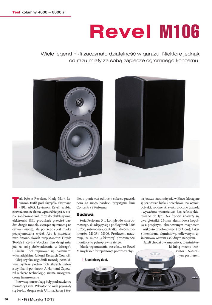 Test kolumny 4000 – 8000 zł Revel M106 Wiele legend hi-fi zaczynało działalność w garażu. Niektóre jednak od razu miały za sobą zaplecze ogromnego koncernu. T ak było z Revelem. Kiedy Mark Levinson trafił pod skrzydła Harmana (JBL, AKG, Levinson, Revel) szybko zauważono, że firma wprawdzie jest w stanie zaoferować kolumny do ekskluzywnej elektroniki (JBL produkuje przecież bardzo drogie modele, cieszące się renomą na całym świecie), ale potrzebna jest marka pozycjonowana wyżej. Aby ją stworzyć, zatrudniono dwóch projektantów: Floyda Toole’a i Kevina Voecksa. Ten drugi miał już za sobą doświadczenia w Mirage’u i Snellu. Tool zajmował się badaniami w kanadyjskim National Research Council. Obaj szybko uzgodnili metodę poszukiwań: syntezę podwójnych ślepych testów z wynikami pomiarów. A Harman? Zapewnił zaplecze, technologię i niemal nieograniczone finansowanie. Pierwszą konstrukcją były podstawkowe monitory Gem. Wkrótce po nich pokazały się bardzo drogie serie Ultima, Salon i Stu56 Hi•Fi i Muzyka 12/13 dio, a ponieważ odniosły sukces, przyszła pora na nieco bardziej przystępne linie Concentra i Performa. Budowa Seria Performa 3 to komplet do kina domowego, składający się z podłogówek F208 i F206, subwoofera, centralki i dwóch monitorów M105 i M106. Producent utrzymuje, że mimo „efektowej” proweniencji, monitory to pełnoprawne stereo. Jakość wykończenia, no cóż… to Revel. Mamy lakier fortepianowy, położony chyAluminiowy duet. ba jeszcze staranniej niż w Elacu (dostępne są też wersje biała i orzechowa, na wysoki połysk), solidne skrzynki, złocone gniazda i wyważone wzornictwo. Bas-refleks skierowano do tyłu. Na froncie znalazły się dwa głośniki: 25-mm aluminiowa kopułka z potężnym, ekranowanym magnesem i nisko-średniotonowiec (13,3 cm), także z membraną aluminiową, odlewanym ciśnieniowo koszem i solidnym napędem. Jeżeli chodzi o wzmacniacz, to miniaturki lubią mocny tranzystor. Naturalnym partnerem Test kolumny 4000 – 8000 zł byłby Levinson, ale zapewne pozostaniecie przy tańszych opcjach. Tak przynajmniej podpowiada rozsądek. Wrażenia odsłuchowe Revele zostały zaprojektowane tak, żeby się wszystkim podobać. Trudno się oprzeć wrażeniu, że z jednej strony zadbano o „efekty specjalne” w postaci głębokiego basu, z drugiej zaś dozowano je tak, by nie zakłócić średniej. Jeżeli już wspominamy o basie, to warto zaznaczyć, że większość konstrukcji w tym teście została wyposażona w dopalacz. W mniejszym lub większym stopniu, ale za każdym razem chodziło o ten sam efekt zaskoczenia, że małe skrzynki mogą grać jak podłogówki. Nie mam nic przeciwko temu, o ile nie zaburza to barwy. Prawie wszyscy lubią, gdy niskie tony masują żołądek. M106 nie wypisuje się z tej grupy, chociaż robi to delikatniej. Nie znajdziemy tu porażającego sola kotłów, jak w ATC, ani fali elektronicznego dołu, jak w Elacach. Revel jest odrobinę oszczędniejszy, a przez to bardziej wyważony. Góry nie brakuje, ale nie stara się ona narzucać. Ma pokazać wystarczającą jak na tę cenę ilość informacji, ale unikać wyostrzeń. Kopułki amerykańskich monitorów potrafią jednak cyknąć i nie jest to zawoalowane jak w Syntarach. Pasmo jest wolne od ostrości, ale i tak słychać wszystko, co trzeba. Średnica jest okrągła, lekko ocieplona i masywna. Od razu czujemy dociążenie jej dolnego zakresu, przez co dźwięk sprawia wrażenie potężniejszego, mocniejszego, jakby bardziej „poważnego”. W osiągnięciu masy brzmienia pomaga też sposób prezentacji przestrzeni. Głośniki koncentrują się na pierwszych planach, podając je lekko do przodu. Zyskują na tym soliści – w klasyce przeróżni, w rocku przeważnie wokaliści i gitarzyści. Koncertowe nagrania brzmią na Revelach przekonująco, zwłaszcza że Zwrotnica na jednej płytce, waciakowe wytłumienie. głośniki potrafią grać bardzo głośno. Osiąganie wysokich natężeń przychodzi im łatwo. Solidne magnesy i klasa głośników dają poczucie spokoju. Nic się nie powinno przepalić ani zepsuć, chyba że używacie słabego wzmacniacza, który przy takim traktowaniu zacznie generować zniekształcenia. Konkluzja Uniwersalny, wydajny monitor. Jak na swoje walory – dość drogi. Ale to w końcu Revel, brat Levinsona. Bi-wiringu nie przewidziano. Revel M106 Cena: 7978 zł Dane techniczne: Liczba dróg/głośników: 2/2 Skuteczność: 86 dB Impedancja: 8 omów Pasmo przenoszenia: 44 Hz – 28 kHz Rekomendowana moc wzmacniacza: 50 – 150 W Wymiary (w/s/g): 36/20/35 cm Waga: 7 kg (sztuka) Ocena: Neutralność: Dynamika: Stereofonia: Przejrzystość: Muzykalność: Bas: Brzmienie: Jakość/cena: §§§§¨ §§§§¨ §§§§¨ §§§§¨ §§§§¨ §§§§¨ §§§§¨ §§§§¨ Hi•Fi i Muzyka 12/13 57