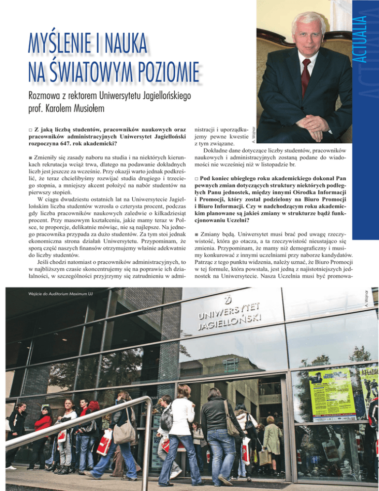 ACTUALIA MYŚLENIE I NAUKA NA ŚWIATOWYM POZIOMIE Rozmowa z rektorem Uniwersytetu Jagiellońskiego prof. Karolem Musiołem □ Pod koniec ubiegłego roku akademickiego dokonał Pan pewnych zmian dotyczących struktury niektórych podległych Panu jednostek, między innymi Ośrodka Informacji i Promocji, który został podzielony na Biuro Promocji i Biuro Informacji. Czy w nadchodzącym roku akademickim planowane są jakieś zmiany w strukturze bądź funkcjonowaniu Uczelni? ■ Zmiany będą. Uniwersytet musi brać pod uwagę rzeczywistość, która go otacza, a ta rzeczywistość nieustająco się zmienia. Przypominam, że mamy niż demograficzny i musimy konkurować z innymi uczelniami przy naborze kandydatów. Patrząc z tego punktu widzenia, należy uznać, że Biuro Promocji w tej formule, która powstała, jest jedną z najistotniejszych jednostek na Uniwersytecie. Nasza Uczelnia musi być promowaA. Wojnar ■ Zmieniły się zasady naboru na studia i na niektórych kierunkach rekrutacja wciąż trwa, dlatego na podawanie dokładnych liczb jest jeszcze za wcześnie. Przy okazji warto jednak podkreślić, że teraz chcielibyśmy rozwijać studia drugiego i trzeciego stopnia, a mniejszy akcent położyć na nabór studentów na pierwszy stopień. W ciągu dwudziestu ostatnich lat na Uniwersytecie Jagiellońskim liczba studentów wzrosła o czterysta procent, podczas gdy liczba pracowników naukowych zaledwie o kilkadziesiąt procent. Przy masowym kształceniu, jakie mamy teraz w Polsce, te proporcje, delikatnie mówiąc, nie są najlepsze. Na jednego pracownika przypada za dużo studentów. Za tym stoi jednak ekonomiczna strona działań Uniwersytetu. Przypominam, że sporą część naszych finansów otrzymujemy właśnie adekwatnie do liczby studentów. Jeśli chodzi natomiast o pracowników administracyjnych, to w najbliższym czasie skoncentrujemy się na poprawie ich działalności, w szczególności przyjrzymy się zatrudnieniu w admi- nistracji i uporządkujemy pewne kwestie z tym związane. Dokładne dane dotyczące liczby studentów, pracowników naukowych i administracyjnych zostaną podane do wiadomości nie wcześniej niż w listopadzie br. A. Wojnar □ Z jaką liczbą studentów, pracowników naukowych oraz pracowników administracyjnych Uniwersytet Jagielloński rozpoczyna 647. rok akademicki? Wejście do Auditorium Maximum UJ ALMA MATER nr 128 5 A. Wojnar Wydziału Fizyki, Astronomii i Informatyki Stosowanej, budynek Instytutu Zoologii. W tym roku akademickim rozpocznie się także budowa siedziby Wydziału Chemii i – mam nadzieję – szybko zaczniemy też budowę basenu. Po pokonaniu pewnych przeszkód ruszy również budowa Paderevianum II. Tak wielki zakres działań inwestycyjnych powoduje konieczność zwiększenia liczby pracowników Biura Inwestycji. Chciałbym jednak podkreślić, że nowi pracownicy będą opłacani z funduszy, które mamy już na te inwestycje, zatem ich uposażenia nie Uroczysta immatrykulacja podczas inauguracji nowego roku akademickiego w Auditorium Maximum wejdą w koszty działalności na w profesjonalny sposób. To, co dawniej można było robić Uniwersytetu. Trzeba im będzie jednak zapewnić miejsce pracy. mniejszym wysiłkiem, teraz musi być robione na ogólnoeuro- Są to sprawy niezmiernie ważne, ale też bardzo skomplikowane, pejskim, a nawet ogólnoświatowym poziomie. Stąd zmiany, zwłaszcza w kwestii rozliczeń tych wszystkich inwestycji, na które wprowadzamy. które mamy pieniądze z wieloletniego programu finansowania Jest jeszcze kilka jednostek na Uniwersytecie istniejących Kampusu 600-lecia Odnowienia Uniwersytetu Jagiellońskiego w naszych czasach niepotrzebnie. Likwidujemy, na przykład, lub z funduszy europejskich. drukarnię, która – według znawców – w swej strukturze nigdy W jakiejś mierze nastąpi więc zwiększenie zatrudnienia na nie będzie na odpowiednio wysokim poziomie doinwestowana Uniwersytecie, ale jeszcze raz powtarzam: nowo przyjęci prai nigdy nie będzie w związku z tym wystarczająco skuteczna. cownicy administracji będą opłacani z projektów, które będą Dziś drukuje się książki, korzystając z nieprawdopodobnej kon- obsługiwać. Mam nadzieję, że nikt nie oczekuje, iż ta sama liczkurencji na rynku drukarskim, i to jest znacznie lepsze rozwią- ba pracowników będzie w stanie zarządzać projektami dyspozanie. nującymi środkami, których wartość dwa razy przekracza nasz Chcemy też przeorganizować rozmieszczenie administracji. roczny budżet. W najbliższym czasie powiększy się także zespół pracowni□ No właśnie, coraz wyraźniej widać, że swoją funkcję – ków Biura Zamówień Publicznych, gdyż liczba zamówień pubz administracyjnej na reprezentacyjną – zmienia Collegium licznych, które muszą realizować, jest w tej chwili gigantyczna. Novum. Jakie są plany zagospodarowania tego gmachu? Do zagospodarowania na Uniwersytecie mamy bowiem ponad miliard złotych. ■ W Collegium Novum zrobiło się już za ciasno, w związku z tym tam, gdzie była drukarnia, planujemy przenieść sporą □ W 2009 roku książka Andrzeja Chwalby Collegium Maius część kwestury. Chcemy mieć nowoczesne centrum admini- zainaugurowała cykl monografii zabytkowych obiektów UJ, stracyjne, ale nie w Collegium Novum, tylko w jego pobliżu. mających uświetnić jubileusz 650-lecia powołania Akademii W Collegium Novum pozostaną struktury, które uznajemy za Krakowskiej. Czy Uniwersytet Jagielloński jeszcze w jakiś bardzo istotne, między innymi Dział Rekrutacji. W gmachu po- inny sposób przygotowuje się do tego jubileuszu, który święzostaną oczywiście studenci, nadal będą się tu odbywać zajęcia tować będziemy w 2014 roku? i wykłady. Z tego nie zrezygnujemy. Pozostanie tu również Samorząd Studentów. ■ Na dopracowanie szczegółów mamy jeszcze sporo czasu. Uniwersytet ma być prawdziwą wspólnotą studentów i pra- Moim zdaniem nie ma potrzeby ust