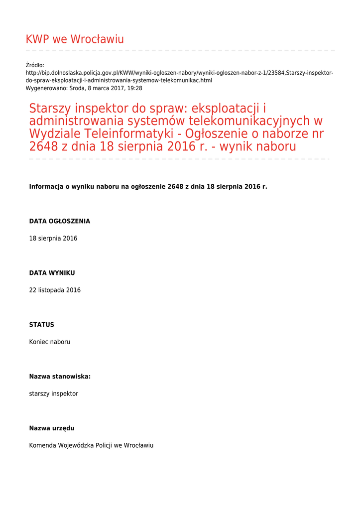 KWP we Wrocławiu Źródło: http://bip.dolnoslaska.policja.gov.pl/KWW/wyniki-ogloszen-nabory/wyniki-ogloszen-nabor-z-1/23584,Starszy-inspektordo-spraw-eksploatacji-i-administrowania-systemow-telekomunikac.html Wygenerowano: Środa, 8 marca 2017, 19:28 Starszy inspektor do spraw: eksploatacji i administrowania systemów telekomunikacyjnych w Wydziale Teleinformatyki - Ogłoszenie o naborze nr 2648 z dnia 18 sierpnia 2016 r. - wynik naboru Informacja o wyniku naboru na ogłoszenie 2648 z dnia 18 sierpnia 2016 r. DATA OGŁOSZENIA 18 sierpnia 2016 DATA WYNIKU 22 listopada 2016 STATUS Koniec naboru Nazwa stanowiska: starszy inspektor Nazwa urzędu Komenda Wojewódzka Policji we Wrocławiu Adres urzędu: Komenda Wojewódzka Policji we Wrocławiu ul. Podwale 31-33 50-040 Wrocław Wyniki naboru: nabór zakończony wyborem kandydatki/kandydata WYBRANE OSOBY: Wawrzyniec Polak Wrocław Treść ogłoszenia: Komenda Wojewódzka Policji we Wrocławiu Ogłoszenie o naborze nr 2648 z dnia 18 sierpnia 2016 r. Oferty do: 29 sierpnia 2016 Wymiar etatu: 1 Stanowiska: 1 Status: Nabór w toku Dodatkowe: Dolnośląski Komendant Wojewódzki Policji poszukuje kandydatów\kandydatek na stanowisko: Starszy inspektor do spraw: eksploatacji i administrowania systemów telekomunikacyjnych w Wydziale Teleinformatyki MIEJSCE WYKONYWANIA PRACY: Wrocław ADRES URZĘDU: Komenda Wojewódzka Policji we Wrocławiu ul. Podwale 31-33 50-040 Wrocław WARUNKI PRACY Warunki dotyczące charakteru pracy na stanowisku i sposobu wykonywania zadań - okresowe pełnienie dyżurów telefonicznych poza normatywnym czasem pracy i konieczność udzielania technicznych konsultacji telefonicznych (nawet w dni wolne lub w nocy), a także w razie potrzeby przyjazd do jednostki Policji lub innego obiektu w celu usunięcia usterek z uwagi na konieczność utrzymania systemów teleinformatycznych w ruchu (w zgodzie z artykułem 151.5 Kodeksu Pracy). - przenoszenie i obsługa sprzętu komputerowego - sporadyczny udział w zaopatrzeniu w sprzęt lub materiały (zakupy), a także w transporcie i odbiorach dostaw oraz w szkoleniach (delegacje) - prowadzenie pojazdów służbowych Miejsce i otoczenie organizacyjno-techniczne - ponad połowa dziennego czasu pracy przed monitorem ekranowym - praca w oświetleniu naturalnym i sztucznym ZAKRES ZADAŃ - administrowanie urządzeniami cyfrowej sieci teleinformatycznej OST112 w celu zapewnienia właściwej i bezawaryjnej pracy jednostek Policji województwa dolnośląskiego. Nadzorowanie prac związanych z usuwaniem nieprawidłowości i przerw w pracy telekomunikacyjnych łączy cyfrowych i analogowych na terenie województwa dolnośląskiego - administrowanie i zarządzanie usługami głosowymi oraz video w Cisco Unified Call Manager Administration. Uruchamianie i nadzór nad sprawnym działaniem systemów telefonii IP we wszystkich jednostkach Policji oraz Straży Pożarnej na terenie województwa dolnośląskiego - obsługa i eksploatacja urządzeń sieciowych oraz łączy ogólnopolskiej sieci OST112. Utrzymanie, nadzór i eksploatacja urządzeń podstawowych łączy optycznych i redundantnych łączy radioliniowych do KMP/KPP i PSP sieci OST112 na terenie województwa dolnośląskiego - zarządzanie i bieżąca obsługa rejestratorów rozmów telefonicznych i radiowych w jednostkach Policji woj.dolnośląskiego - tworzenie baz danych o charakterze ewidencyjnym na potrzeby Wydziału Teleinformatyki. Administrowanie lokalnymi bazami danych , wykorzystywanymi przez wydział Teleinformatyki (bazą umów przygotowanych i realizowanych przez Wydział Teleinformatyki oraz bazą sprzętu i łączy telekomunikacyjnych eksploatowanych w jednostkach dolnośląskiej Policji) - administrowanie i eksploatacja siłowni telekomunikacyjnych w jednostkach Policji całego województwa poprzez: diagnostykę pracy urządzeń, konserwację urządzeń, kontrolę pracy i stanu elementów składowych siłowni oraz obsługę agregatu. Cel: zapewnienie nieprzerwanego zasilania urządzeń teleinformatycznych - utrzymanie ogólnopolskiego systemu łączności rządowej. Eksploatacja systemu poprzez: diagnostykę pracy cyfrowej centrali telefonicznej, pracy urządzeń abonenckich, kontrolę wydzielonej sieci kablowej na terenie miasta Wrocławia. Cel: zapewnienie nieprzerwanej pracy systemu na potrzeby centralnych organów administracji państwowej - obsługa techniczna i wsparcie przy przygotowywaniu wideokonferencji organizowanych na potrzeby jednostek KGP, KWP i KMP/KPP. Administrowanie lokalnym terminalem wideokonferencyjnym. Opracowywanie niezbędnej dokumentacji wymaganej przy realizacji umów i zakupów w ramach ustawy o zamówieniach publicznych. Udział w pracach komisji prowadzących postępowania przetargowe WYMAGANIA NIEZBĘDNE - wykształcenie: średnie - doświadczenie zawodowe: 1 rok w telekomunikacji lub informatyce - prawo jazdy kat. B - znajomość języka angielskiego na poziomie podstawowym - umiejętność współpracy w zespole - wysoka samodzielność przy wykonywaniu zadań - asertywność oraz umiejętność podejmowania trudnych decyzji - umiejętność działania w sytuacjach nieprzewidzianych oraz sytuacjach stresowych - posiadanie obywatelstwa polskiego - korzystanie z pełni praw publicznych - nieskazanie prawomocnym wyrokiem za umyślne przestępstwo lub umyśle przestępstwo skarbowe WYMAGANIA DODATKOWE: - wykształcenie: wyższe profilowane w kierunku telekomunikacja lub informatyka - doświadczenie zawodowe: 3 lata przy zarządzaniu sieciami teletransmisyjnymi - przeszkolenie z zakresu prawa zamówień publicznych, przeszkolenie z zakresu prawa telekomunikacyjnego - uprawnienia SEP do eksploatacji urządzeń elektrycznych do 1 kV - znajomość języka angielskiego na poziomie zaawansowanym - znajomość konfigurowania urządzeń teletransmisyjnych Vanguard - znajomość oprogramowania zarządzającego opartego na platformie HP OpenView - znajomość tworzenia baz danych - znajomość zagadnień z za