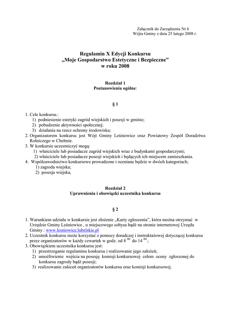 Załącznik do Zarządzenia Nr 6 Wójta Gminy z dnia 25 lutego 2008 r. Regulamin X Edycji Konkursu ,,Moje Gospodarstwo Estetyczne i Bezpieczne” w roku 2008 Rozdział 1 Postanowienia ogólne: §1 1. Cele konkursu.: 1) podniesienie estetyki zagród wiejskich i posesji w gminie; 2) pobudzenie aktywności społecznej; 3) działania na rzecz ochrony środowiska; 2. Organizatorem konkursu jest Wójt Gminy Leśniowice oraz Powiatowy Zespół Doradztwa Rolniczego w Chełmie. 3. W konkursie uczestniczyć mogą: 1) właściciele lub posiadacze zagród wiejskich wraz z budynkami gospodarczymi; 2) właściciele lub posiadacze posesji wiejskich i będących ich miejscem zamieszkania. 4. Współzawodnictwo konkursowe prowadzone i oceniane będzie w dwóch kategoriach; 1) zagroda wiejska; 2) posesja wiejska, Rozdział 2 Uprawnienia i obowiązki uczestnika konkursu §2 1. Warunkiem udziału w konkursie jest złoŜenie „Karty zgłoszenia”, która moŜna otrzymać w Urzędzie Gminy Leśniowice , u miejscowego sołtysa bądź na stronie internetowej Urzędu Gminy : www.lesniowice.lubelskie.pl 2. Uczestnik konkursu moŜe korzystać z pomocy doradczej i instruktaŜowej dotyczącej konkursu przez organizatorów w kaŜdy czwartek w godz. od 8 00 do 14 00 ; 3. Obowiązkiem uczestnika konkursu jest: 1) przestrzeganie regulaminu konkursu i realizowanie jego załoŜeń; 2) umoŜliwienie wejścia na posesję komisji konkursowej celem oceny zgłoszonej do konkursu zagrody bądź posesji; 3) realizowanie zaleceń organizatorów konkursu oraz komisji konkursowej. Rozdział 3 Obowiązki organizatorów konkursu §3 1. Udostępnienie uczestnikom regulaminu i kart zgłoszeniowych. 2. Prowadzenie i nadzorowanie prac związanych z organizacją konkursu. 3. Przegląd zgłoszonych obiektów do konkursu . 4. Powołanie przez Wójta Gminy komisji konkursowej . 5. Dokonanie oceny zgłoszonych do konkursu zagród i posesji wiejskich . 6. Powiadomienie wszystkich uczestników konkursu o terminie pracy komisji w terenie. 7. Dokonanie oceny konkursu zgodnie z określonymi w regulaminie kryteriami oraz sporządzenie protokołów. 7 Rozstrzygnięcie konkursu podczas Gminnego Święta Plonów 2008 r. . Rozdział 4 Kryteria oceny , zasady punktacji i przyznawania nagród §4 1. Kategoria - zagroda wiejska. 1) stan i estetyka budynków - 0 -10 punktów; 2) ogólny ład i porządek całego obejścia - 0 -10 punktów; 3) ozdobne nasadzenia w obrębie zagrody np. kompozycje kwiatowe, rabaty, ukwiecenie, ogródek przed domem, kącik wypoczynkowy itp. - 0 -10 punktów; 4) właściwe gromadzenie ścieków bytowych (posiadanie zbiornika bezodpływowego, oczyszczalni przydomowej) - 0 -10 punktów; 5) prawidłowe i estetyczne gromadzenie odpadów stałych (sortowanie odpadów, podpisana umowa z zakładem wywoŜącym odpady) - 0 -10 punktów; 6) stan i wyposaŜenie budynków w urządzenia słuŜące do produkcji rolnej - 0 -10 punktów; 7) wyznaczenie w gospodarstwie miejsca do składowania obornika, gromadzenia gnojowicy, magazynowania słomy itp.- 0 -10 punktów. 8) wydzielenie miejsca na maszyny- 0 -10 punktów. 2. Maksymalna do uzyskania ilość punktów - 80. 3.Kategoria – posesja wiejska: 1) stan i estetyka budynków - 0 -10 punktów; 2) ogólny ład i porządek całego obejścia - 0 -10 punktów; 3) ozdobne nasadzenia w obrębie posesji np. kompozycje kwiatowe, rabaty, ukwiecenie, ogródek przed domem, kącik wypoczynkowy - 0 -10 punktów; 4) właściwe gromadzenie ścieków bytowych (posiadanie zbiornika bezodpływowego, oczyszczalni przydomowej) - 0 -10 punktów; 5) prawidłowe i estetyczne gromadzenie odpadów stałych (sortowanie odpadów, podpisana umowa z zakładem wywoŜącym odpady) - 0 -10 punktów; 4) Maksymalna do uzyskania ilość punktów – 50. §5 W konkursie nie mogą brać udziału laureaci pierwszego miejsca z roku poprzedzającego rok ogłoszenia kolejnej edycji konkursu. § 6 1. Uczestnikom konkursu za I, II, III miejsce w kaŜdej z kategorii będą przyznawane nagrody rzeczowe lub pienięŜne. 2. Wszyscy uczestnicy konkursu otrzymują dyplomy. 3. Dopuszcza się inne formy nagrodzenia uczestników konkursu „ Moje Gospodarstwo Estetyczne i Bezpieczne” Rozdział 5 Harmonogram realizacji konkursu Lp Działanie Wykonawca Termin 1. Ogłoszenie konkursu Wójt Gminy 1- 10 marca 2008 r. Zgłoszenie udziału (załącznik) Uczestnicy do 31 maja 2008 r. Powołanie komisji konkursowej Ustalenie harmonogramu przeglądu posesji Przegląd posesji i zagród wiejskich Rozstrzygnięcie konkursu i ogłoszenie wyników Wójt Gminy Komisja konkursowa Komisja konkursowa Komisja konkursowa do 20 maja 2008 r. do 31 maja 2008 r. I - do15 czerwca 2008 r. II - do 15 sierpnia 2008 r. Uroczyste wręczenie nagród Wójt Gminy Gminne Święto Plonów 2. 3. 4. 5. 6. do 24 sierpnia 2008 r. 7. Rozdział VII Postanowienia końcowe §6 1. Decyzja komisji jest ostateczna. 2. Komisja kończy swą działalność po ogłoszeniu wyników.