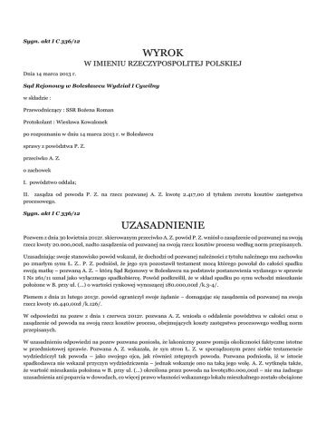 Sygn. akt I C 336/12 WYROK W IMIENIU RZECZYPOSPOLITEJ POLSKIEJ Dnia 14 marca 2013 r. Sąd Rejonowy w Bolesławcu Wydział I Cywilny w składzie : Przewodniczący : SSR Bożena Roman Protokolant : Wiesława Kowalonek po rozpoznaniu w dniu 14 marca 2013 r. w Bolesławcu sprawy z powództwa P. Z. przeciwko A. Z. o zachowek I. powództwo oddala; II. zasądza od powoda P. Z. na rzecz pozwanej A. Z. kwotę 2.417,00 zł tytułem zwrotu kosztów zastępstwa procesowego. Sygn. akt I C 336/12 UZASADNIENIE Pozwem z dnia 30 kwietnia 2012r. skierowanym przeciwko A. Z. powód P. Z. wniósł o zasądzenie od pozwanej na swoją rzecz kwoty 20.000,00zł, nadto zasądzenia od pozwanej na swoją rzecz kosztów procesu według norm przepisanych. Uzasadniając swoje stanowisko powód wskazał, że dochodzi od pozwanej należności z tytułu należnego mu zachowku po zmarłym synu Ł. Z.. P. Z. podniósł, że jego syn pozostawił testament mocą którego powołał do całości spadku swoją matkę – pozwaną A. Z. – którą Sąd Rejonowy w Bolesławcu na podstawie postanowienia wydanego w sprawie I Ns 261/11 uznał jako wyłącznego spadkobiercę. Powód podkreślił, że w skład spadku po synu wchodzi mieszkanie położone w B. przy ul. (...) o wartości rynkowej wynoszącej 180.000,00zł /k.3-4/. Pismem z dnia 21 lutego 2013r. powód ograniczył swoje żądanie – domagając się zasądzenia od pozwanej na swoja rzecz kwoty 16.440,00zł /k.126/. W odpowiedzi na pozew z dnia 1 czerwca 2012r. pozwana A. Z. wniosła o oddalenie powództwa w całości oraz o zasądzenie od powoda na swoją rzecz kosztów procesu, obejmujących koszty zastępstwa procesowego według norm przepisanych. W uzasadnieniu odpowiedzi na pozew pozwana poniosła, że lakoniczny pozew pomija okoliczności faktyczne istotne w przedmiotowej sprawie. Pozwana A. Z. wskazała, że syn stron Ł. Z. w sporządzonym przez siebie testamencie wydziedziczył tak powoda – jako swojego ojca, jak również zstępnych powoda. Pozwana podniosła, iż w istocie spadkodawca nie wskazał przyczyn wydziedziczenia – jednak wskazuje ono na taką jego wolę. A. Z. wytknęła także, że wartość mieszkania położona w B. przy ul. (...) określona przez powoda na kwotę180.000,00zł – nie ma żadnego uzasadnienia ani poparcia w dowodach, co więcej prawo własności wskazanego lokalu mieszkalnego zostało obciążone służebnością osobistą na rzecz pozwanej – co niewątpliwie obniża wartość nieruchomości. Pozwana A. Z. uzasadniając swoje stanowisko wskazała także na okoliczność istnienia konfliktu pomiędzy jej synem – spadkodawcą Ł. Z. – a jego ojcem powodem P. Z.. A. Z. podkreśliła, że P. Z. uporczywie niedopełniał wobec swojego syna obowiązków rodzinnych, nie utrzymywał z synem kontaktów, nie płacił na syna alimentów podczas jego studiów. A. Z. wskazała, że lokal mieszkalny położny w B. przy ul. (...) wchodził w skład majątku wspólnego jej i powoda, po rozwodzie i w wyniku przeprowadzone podziału majątku został jej przyznany – a ona dokonała spłaty na rzecz powoda, byłego męża zapewniając w ten sposób lokum dla siebie i spadkodawcy Ł. Z.. W ocenie pozwanej na mocy art. 5 k.c. prawo do otrzymania zachowku po Ł. Z. – nie przysługuje powodowi P. Z. /k.14-19/. Sąd Rejonowy ustalił następujący stan faktyczny: A. Z. i Przemysł Z. pozostawali w związku małżeńskim. Ze związku tego urodziło się jedno dziecko – syn Ł. Z.. /dowód: zeznania powoda P. Z. k.41v w zw. z k.86v; zeznania pozwanej A. Z. k.42 w zw. z k.87v/ Wyrokiem z dnia 28 marca 1996r. Sąd Okręgowy w Jeleniej Górze rozwiązał małżeństwo A. i P. Z. przez rozwód. /dowód: wyrok Sądu Okręgowego w Jeleniej Górze z dnia 28.03.1996r. k.7-7v przy aktach Sądu Rejonowego w Bolesławcu I Ns 296/96/ W dniu 6 maja 1998r. w wyniku przeprowadzonego postępowania o podział majątku wspólnego – pomiędzy A. Z. i P. Z. została zawarta ugoda sądowa w sprawie I Ns 296/96 prowadzonej przez Sąd Rejonowy w Bolesławcu. Na mocy wymienionej ugody sądowej lokal mieszkalny numer (...) położony w B. przy ul. (...) wchodzący w skład majątku wspólnego wraz z ruchomościami się w nim znajdującymi – został przyznany A. Z., która zobowiązała się do dokonania na rzecz byłego męża P. Z. spłaty w wysokości 36.500,00zł. /dowód: ugoda sądowa z dnia 06.05.1998r. k. 157-158przy aktach Sądu Rejonowego w Bolesławcu I Ns 296/96; zeznania powoda P. Z. k.41v w zw. z k.86v / A. Z. spłaciła zobowiązanie wynikające w wyżej opisanej ugody sądowej. W mieszkaniu położonym w B. przy ul. (...) mieszkała sama wraz z synem Ł. Z.. Celem zgromadzenia środków pieniężnych na spłatę byłego męża P. A. Z. zmuszona była podjąć pracę poza granicami kraju – w Niemczech. Podczas nieobecności A. Z. w kraju – Ł. zajmowała się ciotka. /dowód: zeznania pozwanej A. Z. k.87; zeznania świadka D. B. k.81v-82; zeznania świadka K. R. k.86; zeznania powoda P. Z. k.41v- w zw. z k.86v/ Ł. Z. nie miał dobrego kontaktu z ojcem. Na przestrzeni wielu lat – kontakty te nie były częste. Ł. Z. był odwiedzany przez ojca i babcię w B., odwiedzał ojca – zatrzymując się w mieszkaniu babci. Wspólnie z ojcem spędził wakacje. A. Z. nie zabraniała synowi kontaktów z ojcem. /dowód: dokumentacja fotograficzna k.40; zeznania pozwanej A. Z. k.42 w zw. z k.87v; zeznania świadka D. B. k.81v-82; zeznania świadka Z. B. k.84; zeznania świadka G. M. k.131v/ Celem uzyskania wyższych alimentów na Ł. A. Z. zmuszona była wnosić o to do Sądu. Troska o wychowanie Ł. Z. spoczywała na matce – A. Z.. /dowód: wyrok z dnia 25.01.1999r. k.26-26v, k.27-27v; zeznania świadka Ł. B. k.83v; zeznania świadka K. R. k.86; zeznania pozwanej A. Z. k.87v-88; zeznania świadka G. M. k.131v/ Ł. Z. był osobą zamkniętą w sobie, nie opowiadał znajomym ani przyjaciołom o ojcu. Mówiąc o nim przedstawiał go per „prezes”. /d