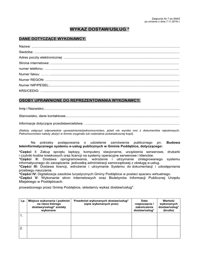 Załącznik Nr 7 do SIWZ po zmianie z dnia 7.11.2016 r. WYKAZ DOSTAW/USŁUG * DANE DOTYCZĄCE WYKONAWCY: Nazwa: ........................................................................................................................................................ Siedziba: ..................................................................................................................................................... Adres poczty elektronicznej: ....................................................................................................................... Strona internetowa: .................................................................................................................................... numer telefonu: ……................................................................................................................................... Numer faksu: ……. ..................................................................................................................................... Numer REGON: .......................................................................................................................................... Numer NIP/PESEL:..................................................................................................................................... KRS/CEDIG: …........................................................................................................................................... OSOBY UPRAWNIONE DO REPREZENTOWANIA WYKONAWCY: Imię i Nazwisko:........................................................................................................................................... Stanowisko, dane kontaktowe:.................................................................................................................... Informacje dotyczące przedstawicielstwa: ….............................................................................................. (Należy załączyć odpowiednie upoważnienie/pełnomocnictwo, jeżeli nie wynika ono z dokumentów rejestrowych. Pełnomocnictwo należy złożyć w formie oryginału lub notarialnie poświadczonej kopii). Na potrzeby postępowania o udzielenie zamówienia publicznego pn. teleinformatycznego systemu e-usług publicznych w Gminie Poddębice, dotyczącego: Budowa *Części I: Zakup sprzętu laptopy, komputery stacjonarne, urządzenia serwerowe, drukarki i czytniki kodów kreskowych oraz licencji na systemy operacyjne serwerowe i klienckie. *Części II: Dostawa oprogramowania, wdrożenie i utrzymanie zintegrowanego systemu informatycznego do zarządzania jednostką administracji samorządowej z obsługą e-usług. *Części III: Dostawa licencji, wdrożenie i utrzymanie Systemu do dokumentacji i udostępniania przebiegu nauczania. *Części IV: Digitalizacja zasobów turystycznych Gminy Poddębice w postaci spaceru wirtualnego. *Części V: Wykonanie stron internetowych oraz Biuletynów Informacji Publicznej Urzędu Miejskiego w Poddębicach. prowadzonego przez Gminę Poddębice, składam/y wykaz dostaw/usług*. Lp. Miejsce wykonania i podmiot na rzecz którego dostawy/usługi* zostały wykonane 1. 2. Przedmiot wykonanych dostaw/usług* (opis wykonanych prac) Data rozpoczęcia / zakończenia dostaw/usług* Wartość wykonanych dostaw/usług* (brutto) 3. Z wykazu winno wynikać spełnienie warunków określonych w SIWZ cz. V * niepotrzebne skreślić ................................................................................ (data i czytelny podpis Wykonawcy)